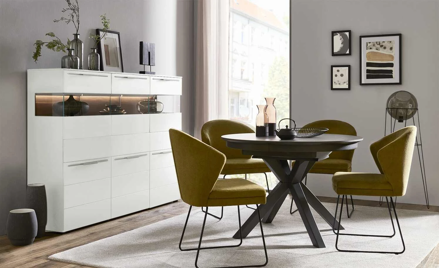 - Material Korpus: Holzwerkstoff lackiert, Glas