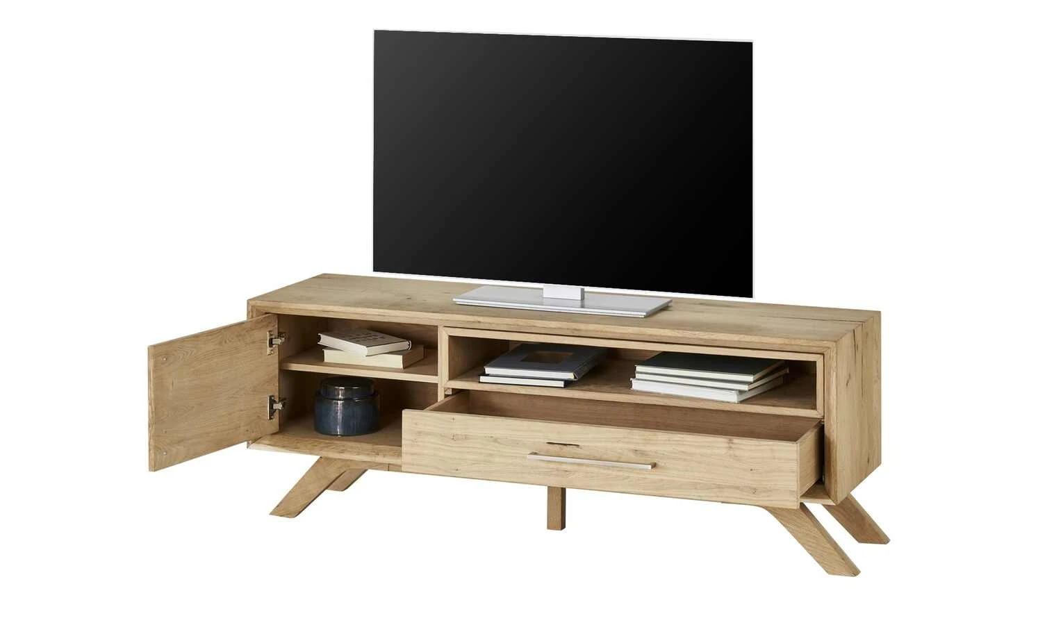 Das TV-Lowboard Cap Ferrat One hat ein natürliches Design mit Scandi-Charme. Es ist von der Marke Gray & Jones und besteht aus hochwertigen Materialien. So sind Front und Korpus mit Eiche furniert, für die Füße ist massive Eiche verwendet worden. Dank der unbehandelten Oberflächen kommt die holztypische Maserung wunderbar zur Geltung. Cap Ferrat One hat eine 150 cm breite Stellfläche für einen Fernseher. Das große Gerätefach ist mit einem Kabeldurchlass in der Rückwand ausgestattet. Stauraum befindet sich hinter Tür und in Schublade. Beide verfügen über eine Soft-Close-Ausstattung.