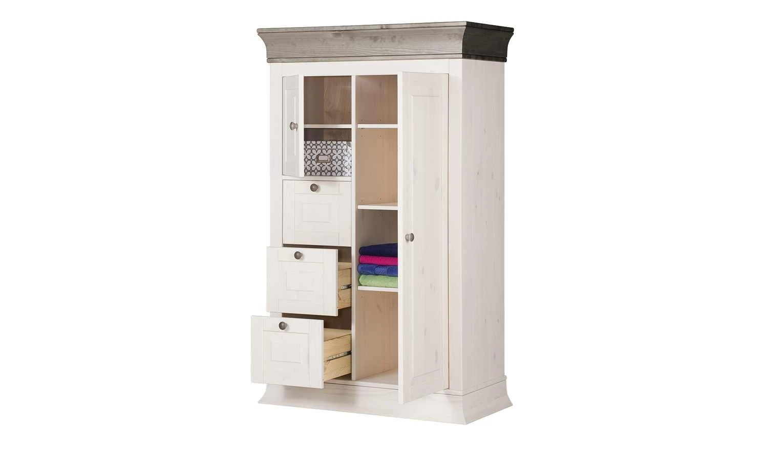 Das Highboard Bornholm ist einem klassischen Brotschrank wie zu Großmutters Zeiten nachempfunden. Der Brotschrank ist aus massiver Kiefer gefertigt worden und somit robust und langlebig. Durch das helle Weiß, bei dem die Holz-Maserung gut erkennbar ist, und die dekorativen Absetzungen in lavafarben lackierter Kiefer erhält Bornholm ein nostalgisches Landhaus-Flair. Dieses wird durch den geschwungenen Sockel und Kranz und die formschönen Einfräsungen an den Fronten geschmackvoll unterstützt. Auf der rechten Seite finden Sie vier große Fächer hinter einer Drehtür. Auf der linken Seite befinden sich drei praktische Schübe und ein weiteres Fach mit Tür. So haben Sie ausreichend Platz für Alltagsutensilien, Geschirr und vieles mehr.