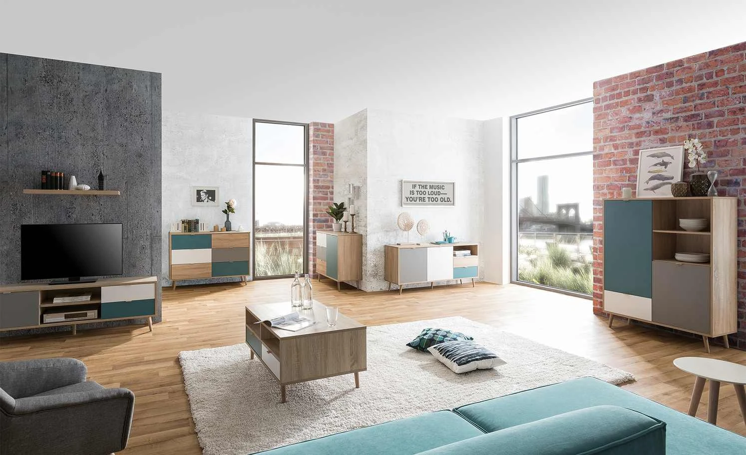 - Farbe / Dekor: Weiß / Petrol / Grau / Eiche sägerau (Nachbildung)