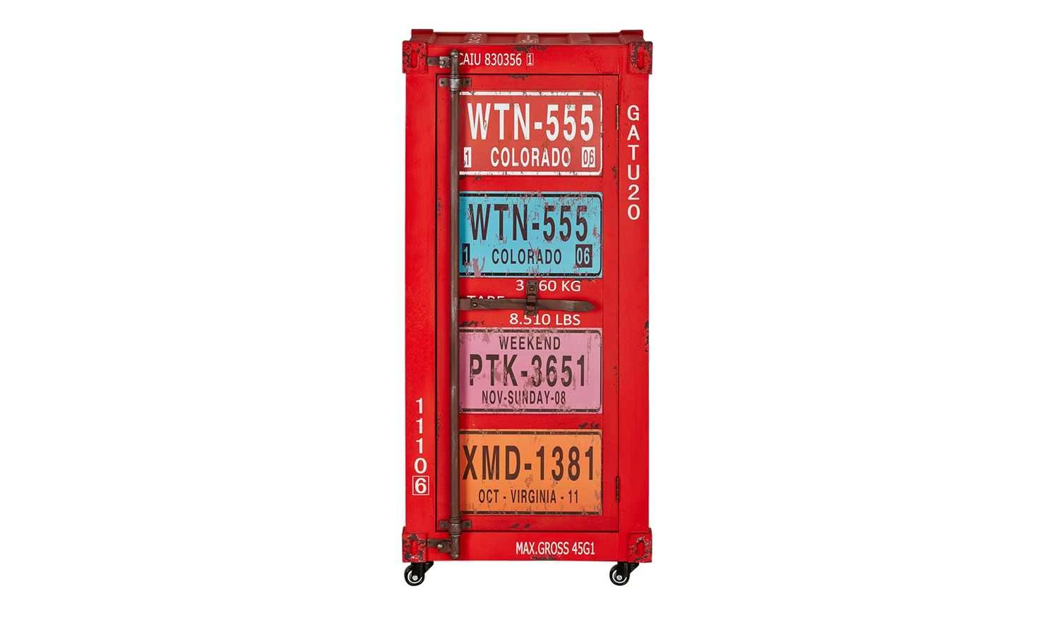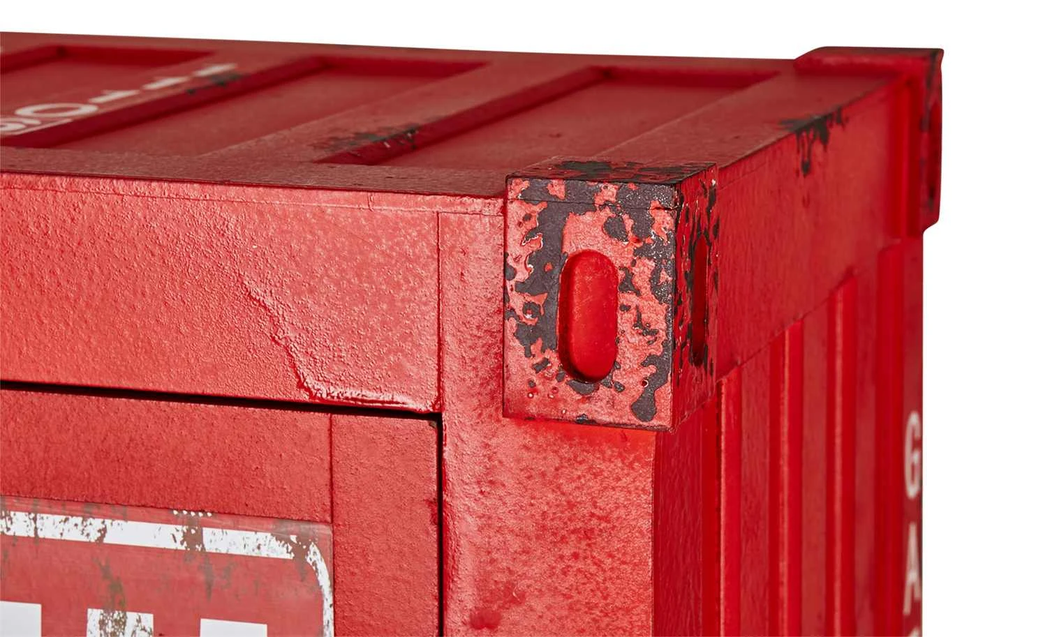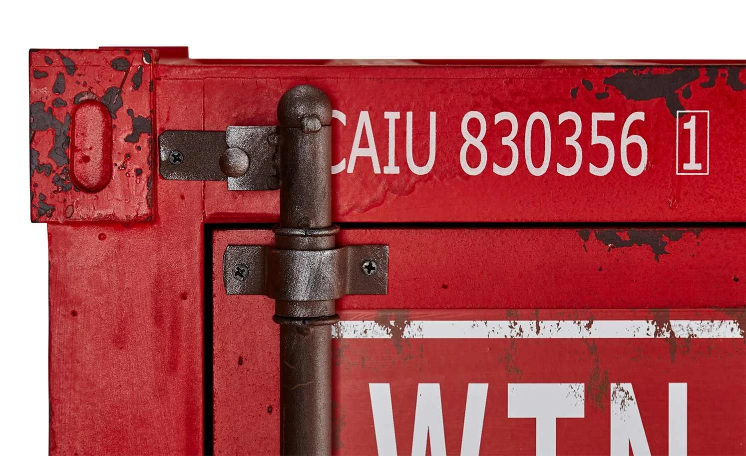 Die Kommode Ancona fällt durch ihren feuerwehrroten Farbton und das außergewöhnliche Design sofort ins Auge. Peppen Sie also Ihren Wohnraum damit auf. Ancona ist rot lackiert, wobei die Kommode absichtlich einen Used-Look erhalten hat. Das passt perfekt zum Design, denn die Kommode soll an die typischen Container erinnert, die man immer in Häfen sieht. Die Kommode ist mit diversen Autokennzeichen und anderen Schriftzügen bedruckt. Ein weiteres Highlight ist der Griff samt Beschlägen aus Metall. Auch sie sehen alt und abgenutzt aus. Im Inneren bietet Ihnen Ancona Stauraum in drei Fächern.