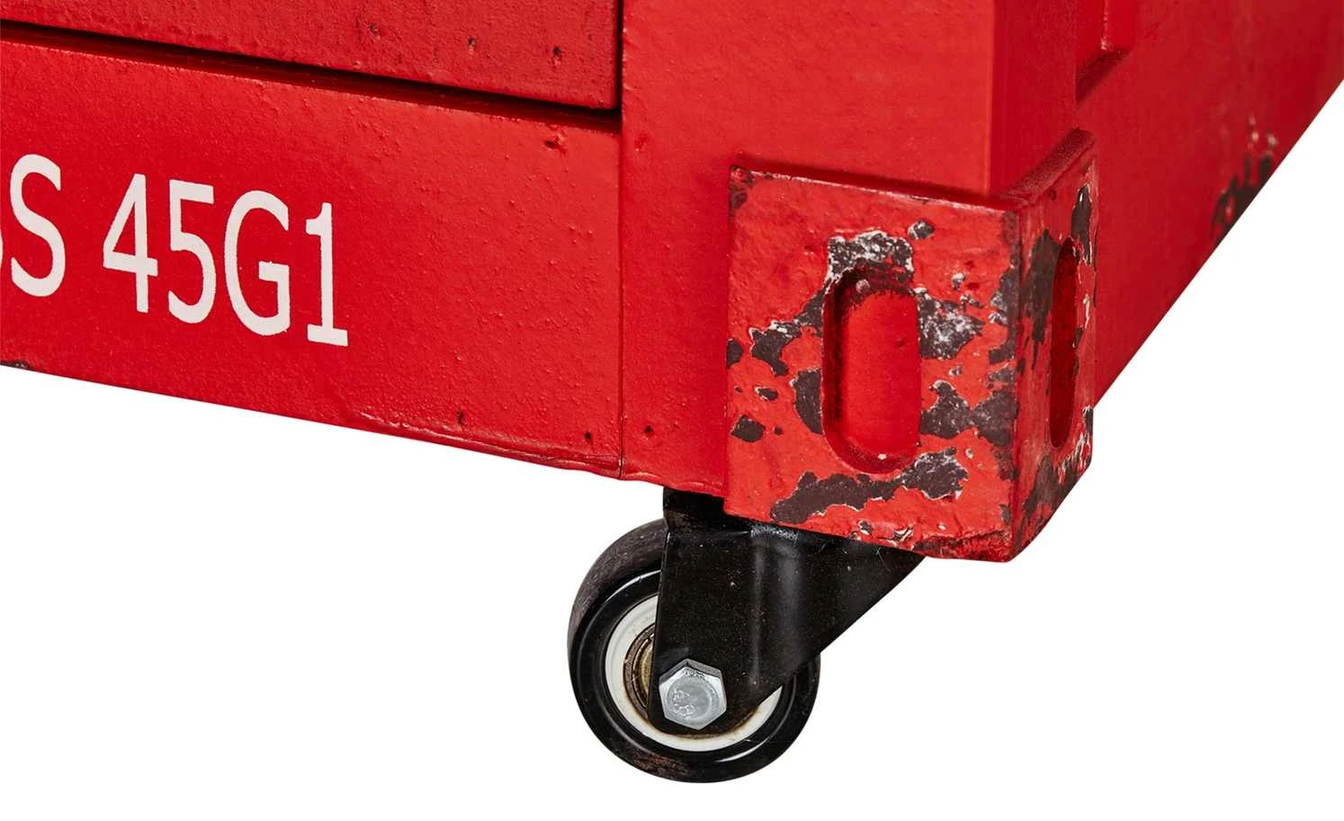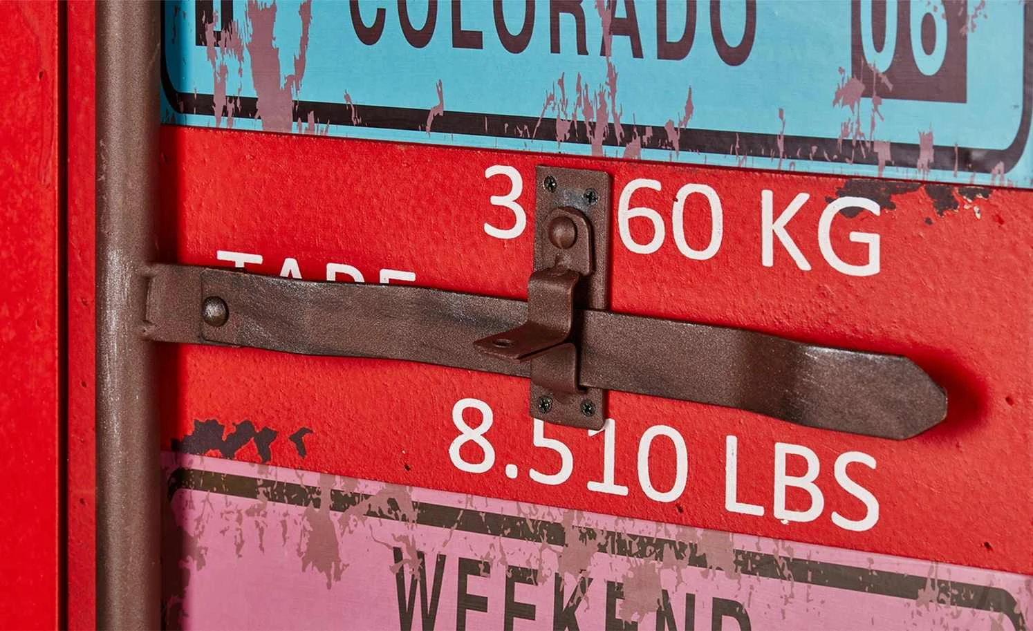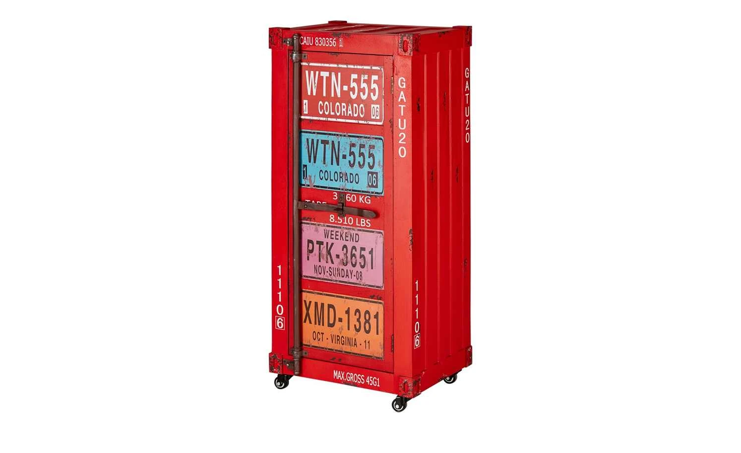 Die Kommode Ancona fällt durch ihren feuerwehrroten Farbton und das außergewöhnliche Design sofort ins Auge. Peppen Sie also Ihren Wohnraum damit auf. Ancona ist rot lackiert, wobei die Kommode absichtlich einen Used-Look erhalten hat. Das passt perfekt zum Design, denn die Kommode soll an die typischen Container erinnert, die man immer in Häfen sieht. Die Kommode ist mit diversen Autokennzeichen und anderen Schriftzügen bedruckt. Ein weiteres Highlight ist der Griff samt Beschlägen aus Metall. Auch sie sehen alt und abgenutzt aus. Im Inneren bietet Ihnen Ancona Stauraum in drei Fächern.