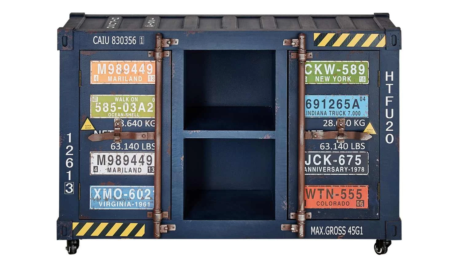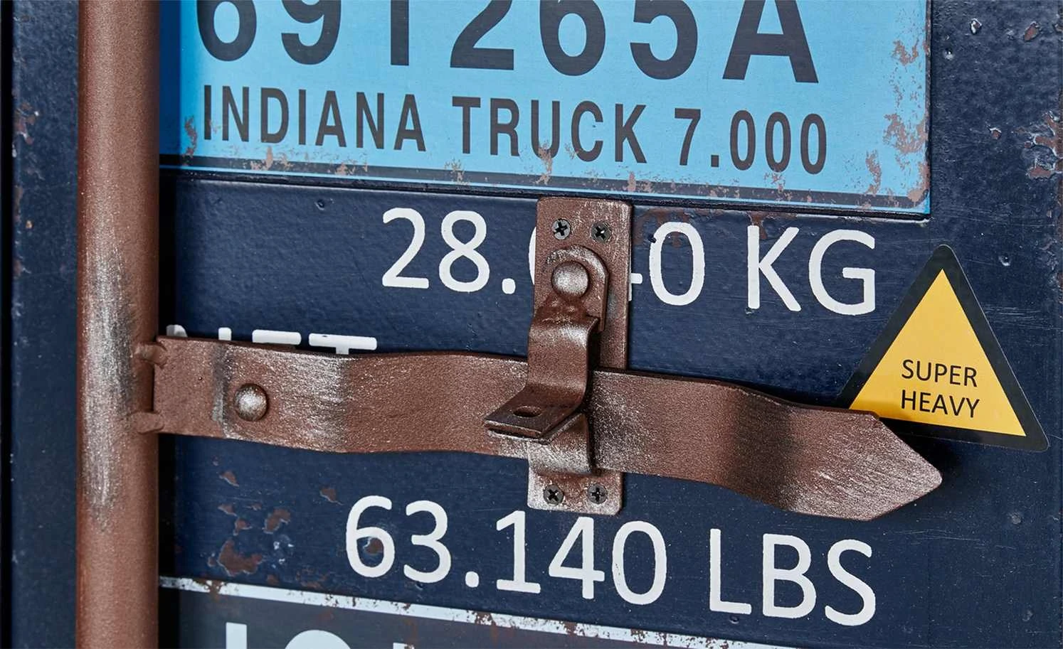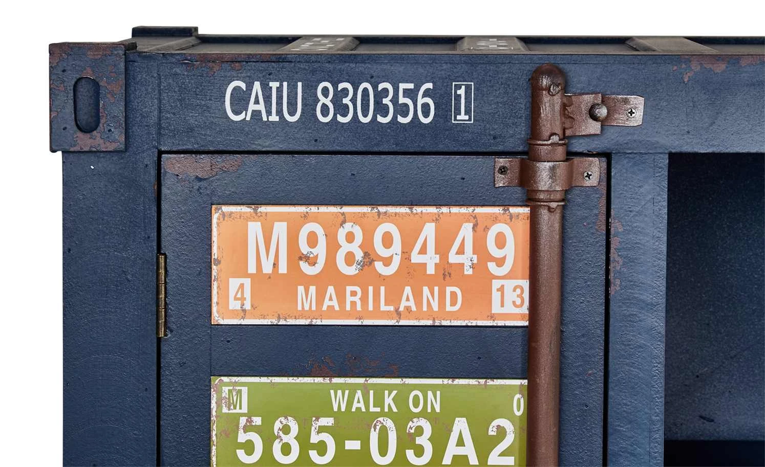 Ein ganz besonderes Stück ist die Kommode Genua. Sie ist im Design einem Container nachempfunden, der alt und abgenutzt ist. Genua ist blau lackiert, wobei die Oberfläche aussieht wie Metall. Ecken und andere Stellen wurden mit einem Used-Look versehen, so als wäre die Farbe abgeplatzt. Die Front fällt durch die mehrfarbigen Autokennzeichen auf. Weitere Highlights sind die Sicherheitshinweise und Schriftzüge. Auch die Metallgriffe mit Hebeln und Beschlägen fallen ins Auge. Mittig hat Genua zwei offene Fächer. Vier weitere Fächer werden durch die beiden Türen verschlossen.