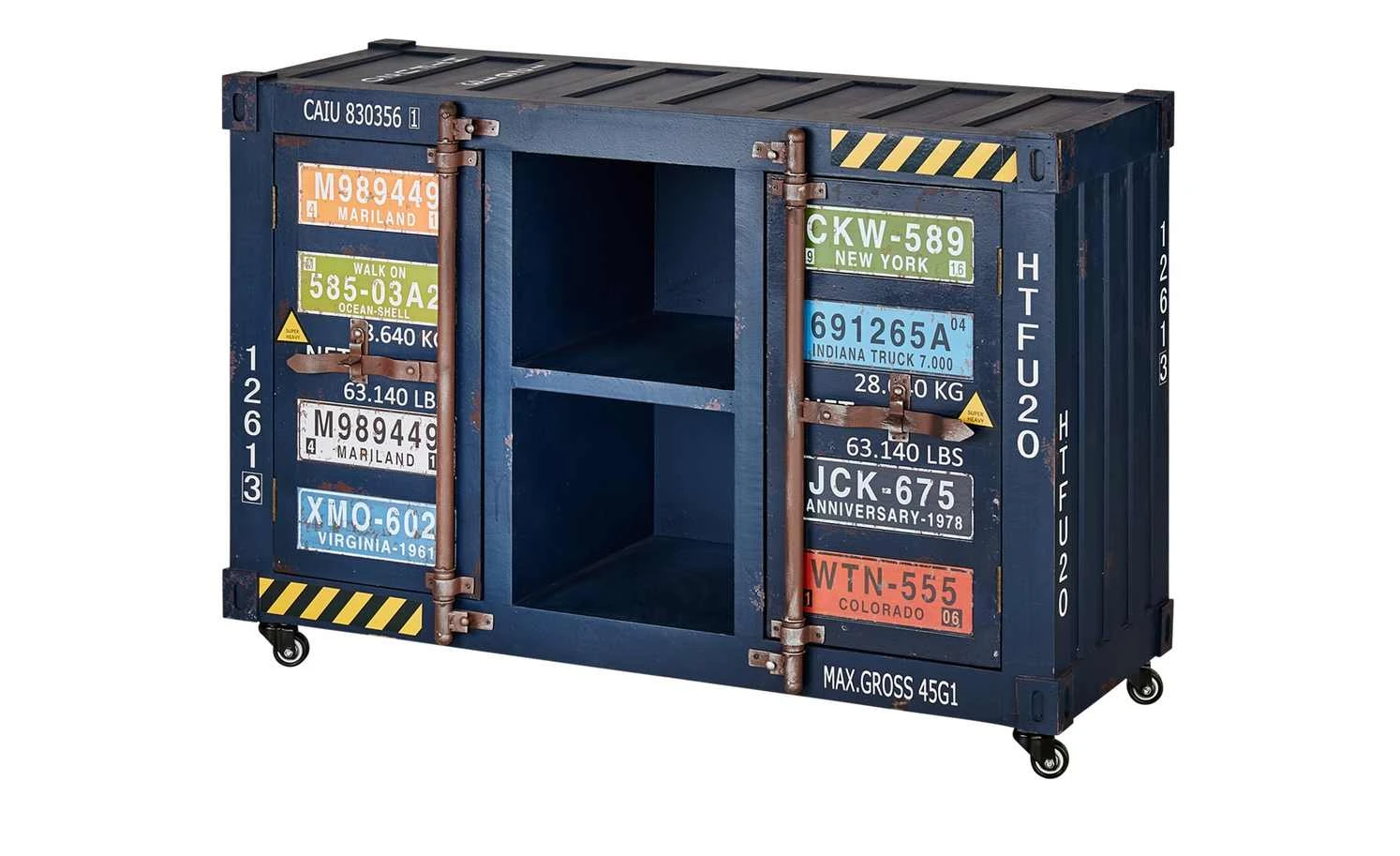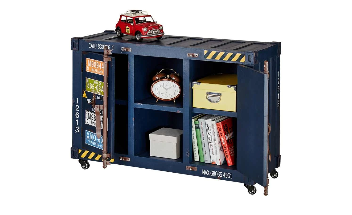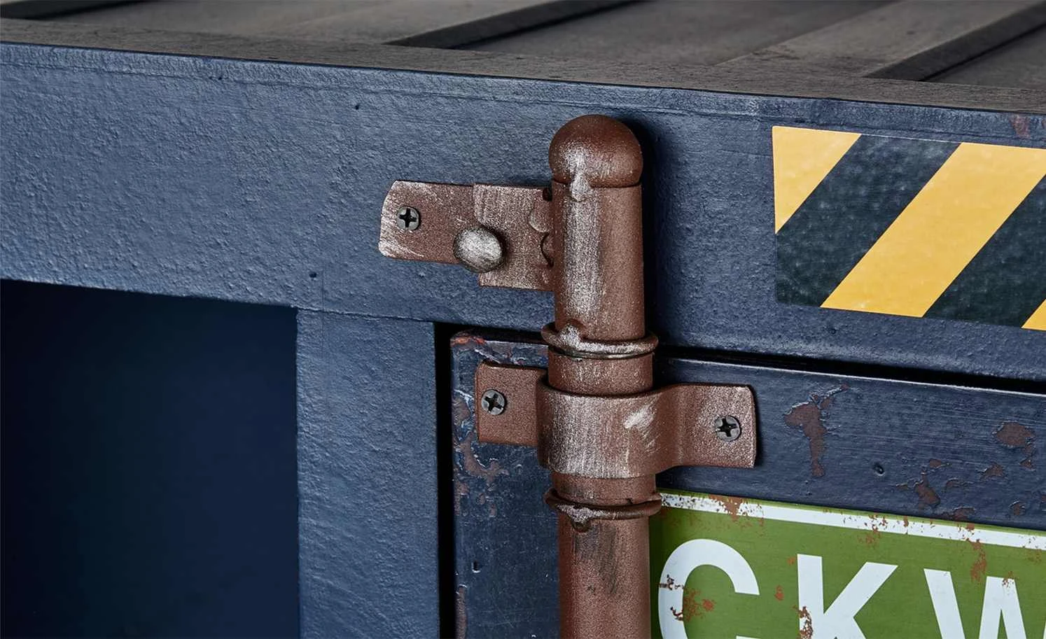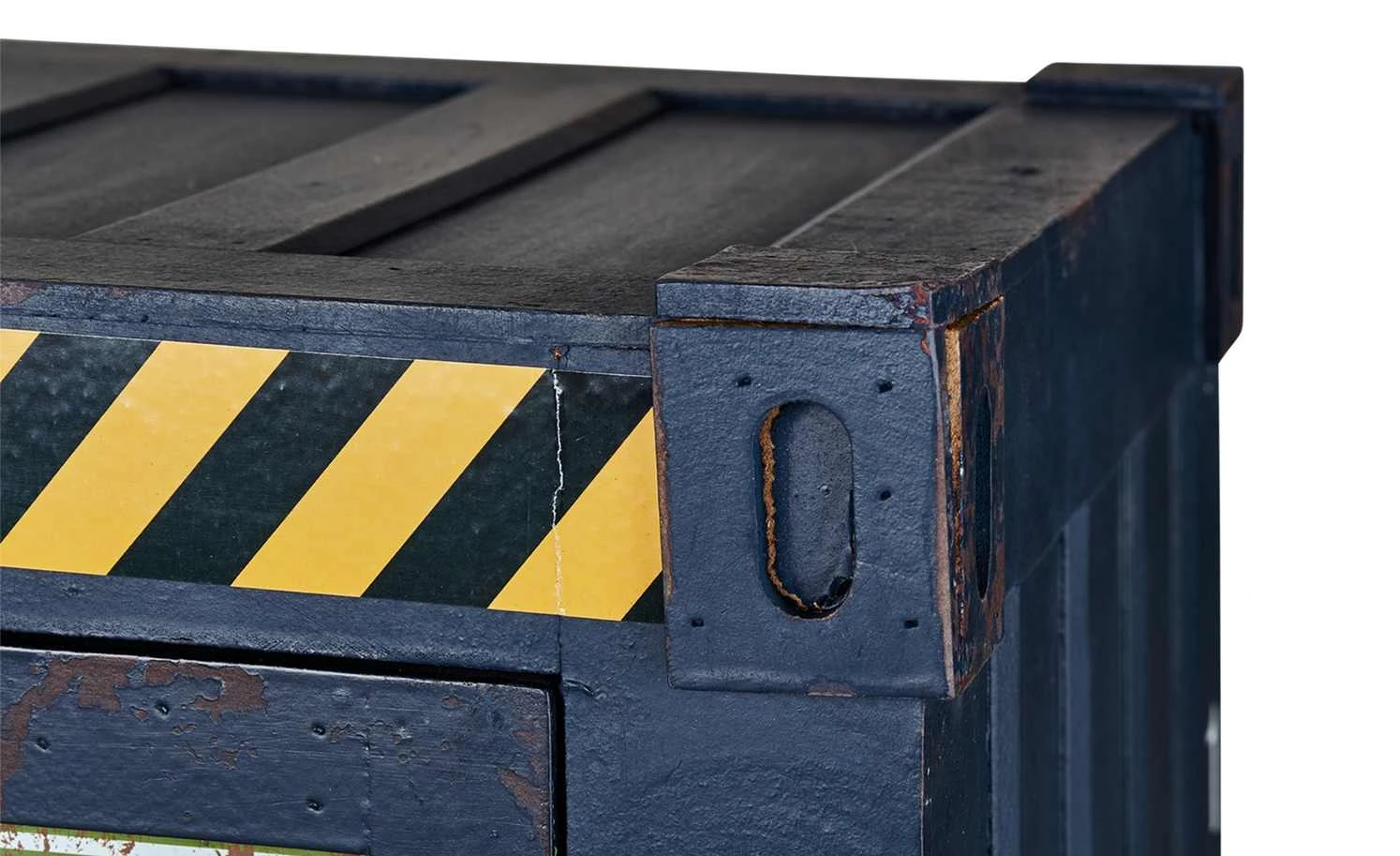 Ein ganz besonderes Stück ist die Kommode Genua. Sie ist im Design einem Container nachempfunden, der alt und abgenutzt ist. Genua ist blau lackiert, wobei die Oberfläche aussieht wie Metall. Ecken und andere Stellen wurden mit einem Used-Look versehen, so als wäre die Farbe abgeplatzt. Die Front fällt durch die mehrfarbigen Autokennzeichen auf. Weitere Highlights sind die Sicherheitshinweise und Schriftzüge. Auch die Metallgriffe mit Hebeln und Beschlägen fallen ins Auge. Mittig hat Genua zwei offene Fächer. Vier weitere Fächer werden durch die beiden Türen verschlossen.