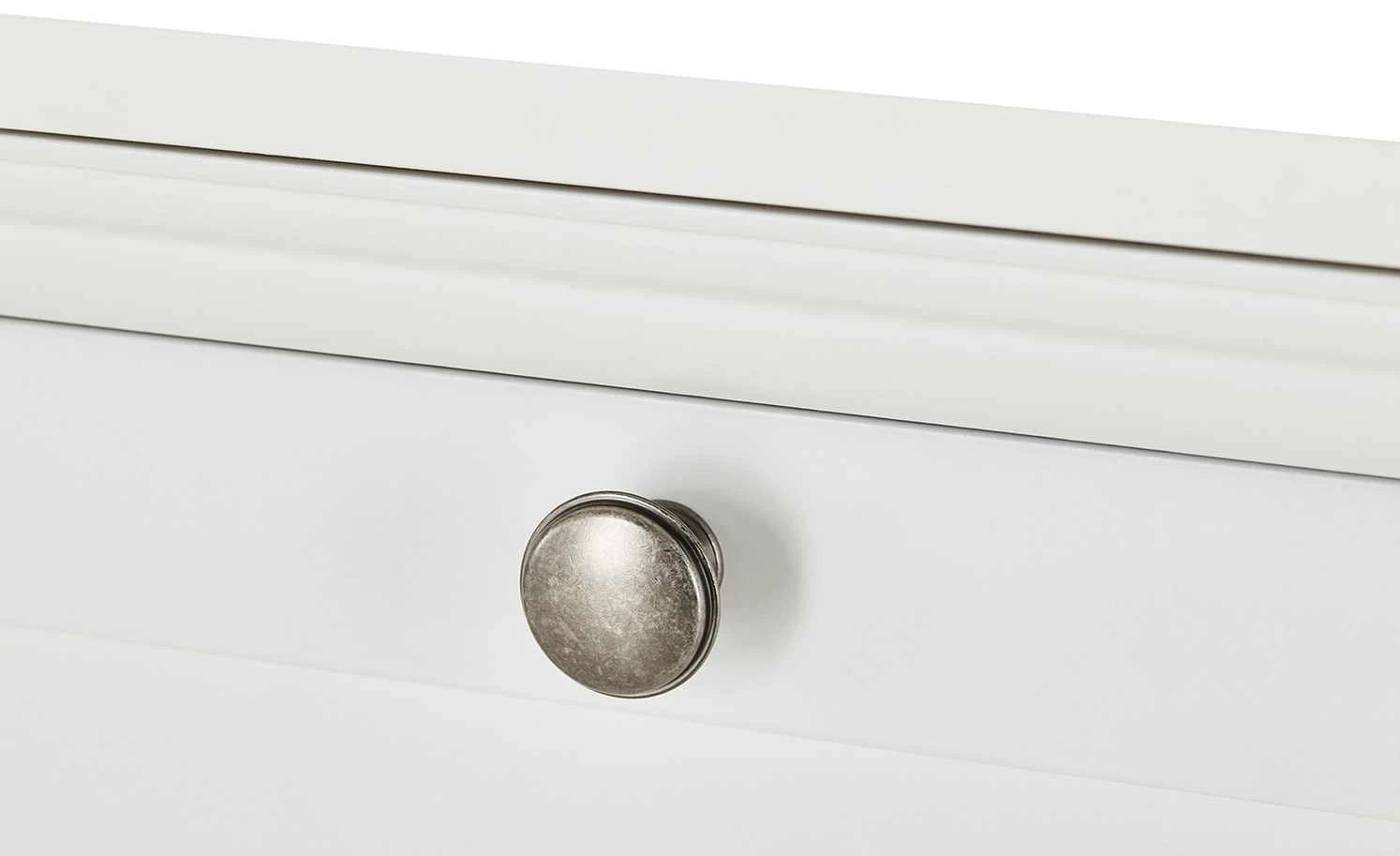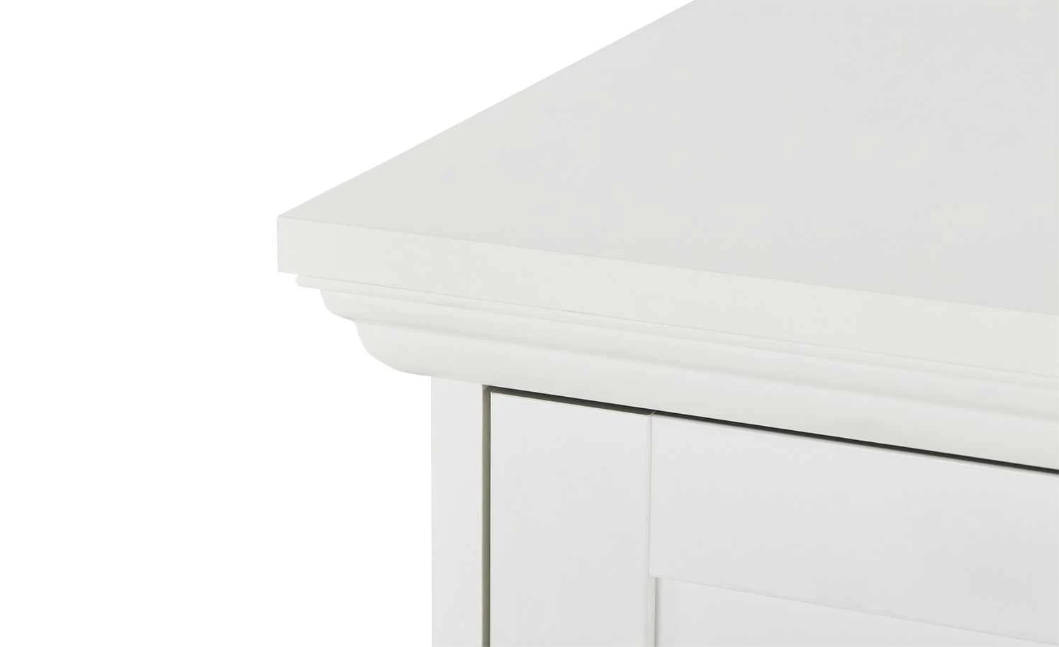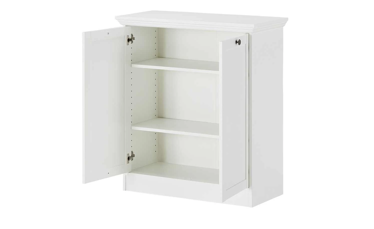 Die Kommode Laurito punktet mit ihrem hübschen Landhauscharme, der reduziert und elegant wirkt. Die feinen Linien werden mit einem strahlenden Weißton kombiniert. Metallgriffe im Vintagedesign setzen punktuelle Akzente – und sind natürlich auch praktisch. Laurito verfügt nämlich über zwei große Türen. Dahinter finden Sie drei geräumige Fächer mit höhenverstellbaren Einlegeböden. Die Oberflächen sind beschichtet, was sie strapazierfähig und pflegeleicht macht.