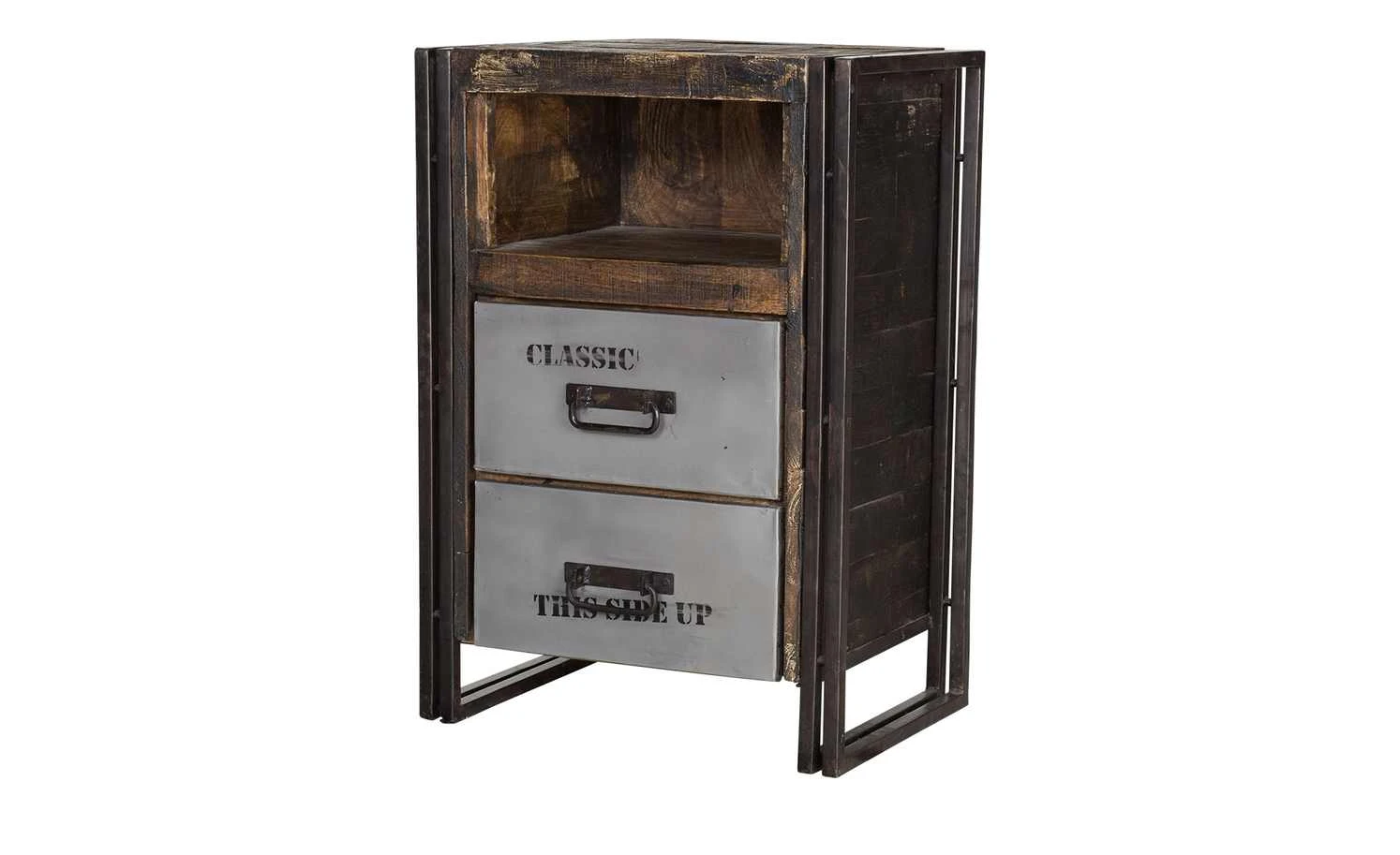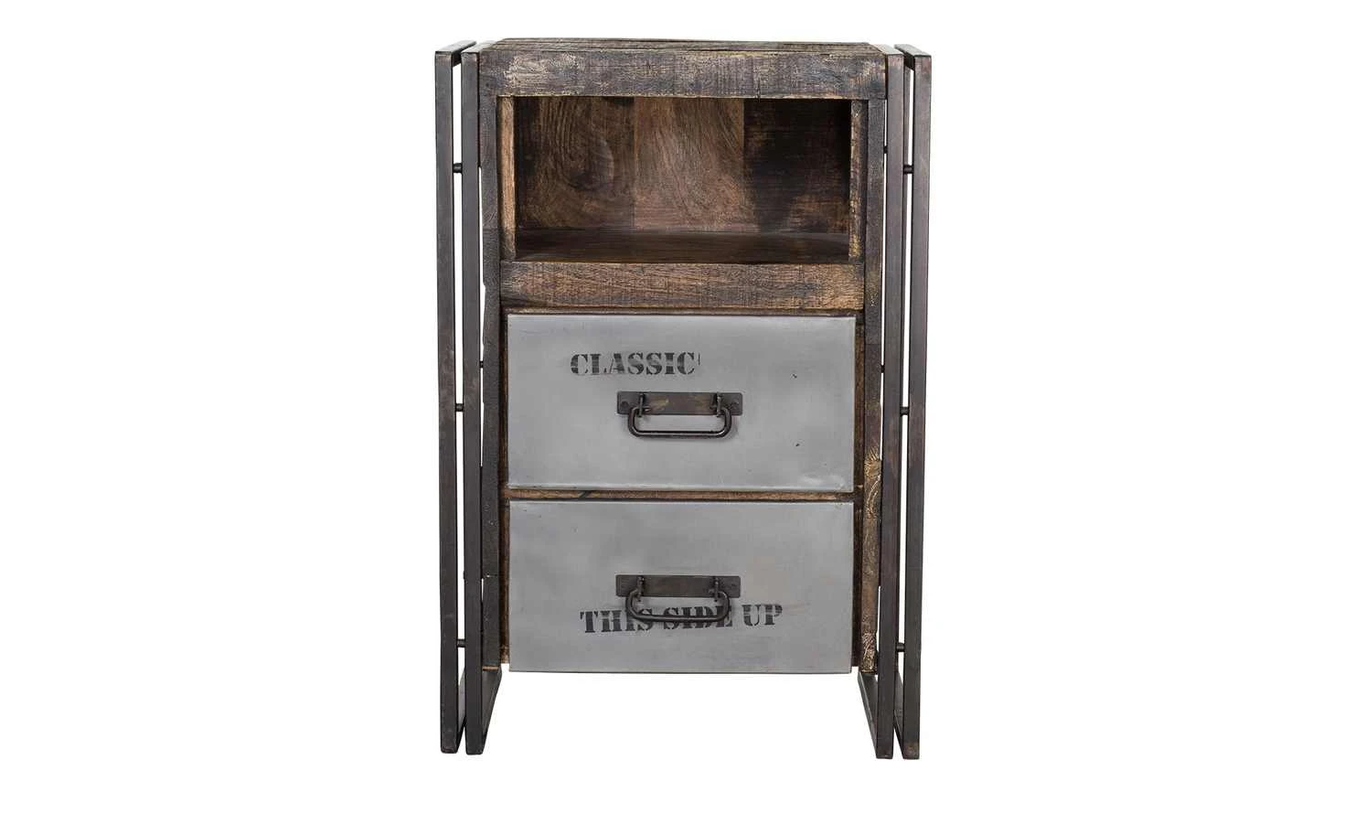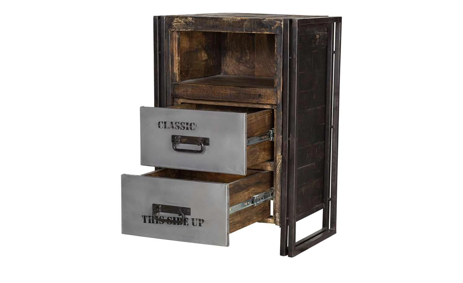 Die Kommode besitzt zwei Schubladen mit metallverkleideten Blenden. Die Schrift auf den Schubladenfronten erinnert an Aufschriften von nostalgischen Holzkisten. Die Metallgriffe an den Schubläden wirken ebenfalls antik. Einzig die modernen Laufleisten, die dafür sorgen, dass die Schubkästen sich mühelos öffnen und schließen lassen, zeugen von der Aktualität der Kommode. Über den beiden Schubfächern befindet sich ein offenes Ablagefach, bei dem die Holzstruktur schön zur Geltung kommt. Der kleine Schubladenschrank ist in jeder Hinsicht ein schöner Blickfang.