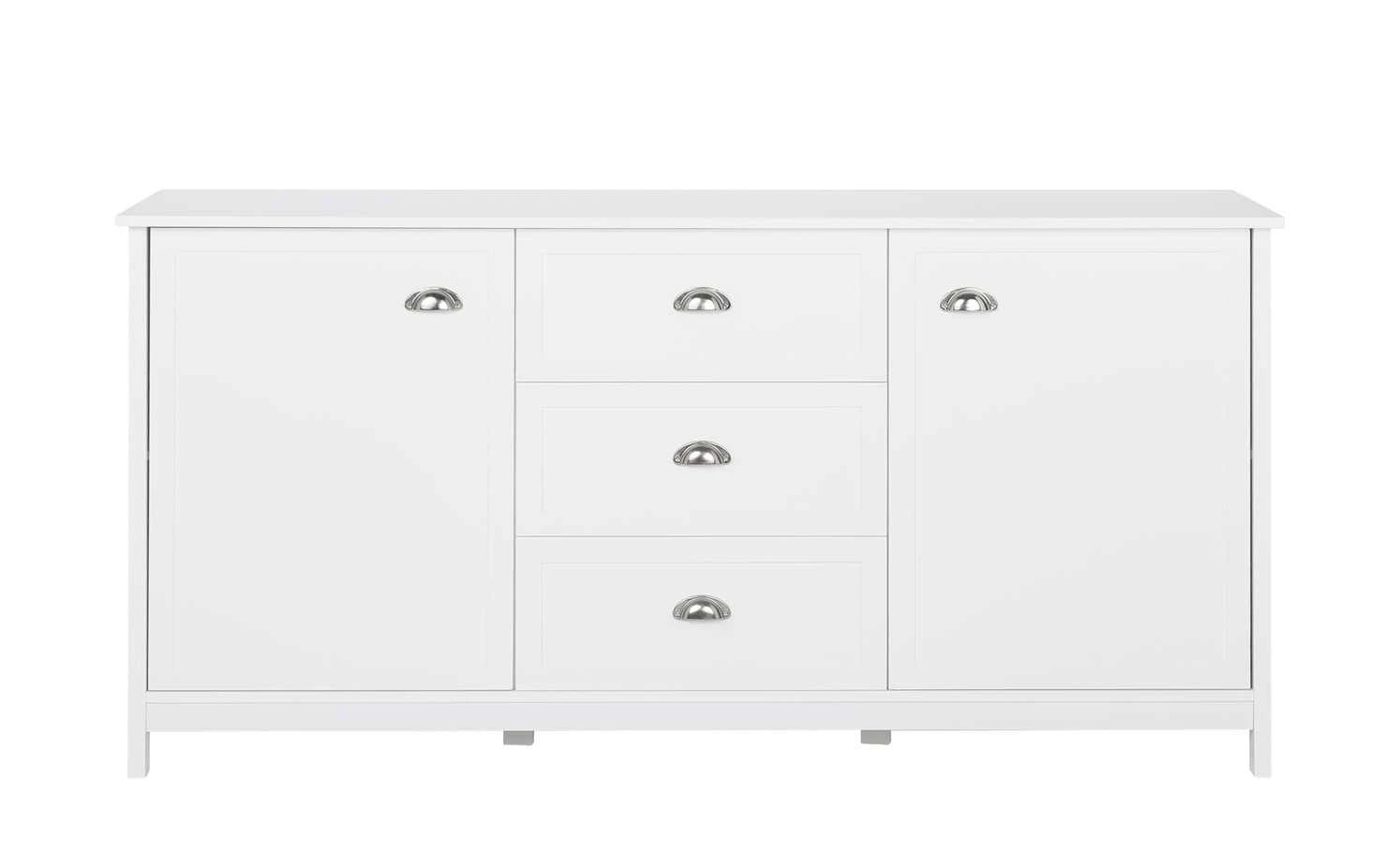 Mit ihrem Landhausstil ist die Kommode Mosi eine Bereicherung für Speisezimmer und Wohnraum. Mosi bietet Ihnen auf einer Gesamtbreite von zirka 160 Zentimetern ordentlich Stauraum hinter zwei Türen und drei Schubladen. Die Griffe im Apothekerstil sind aus glänzendem Metall. Korpus und Front sind lackiert – wahlweise in Weiß oder in Schwarzbraun.