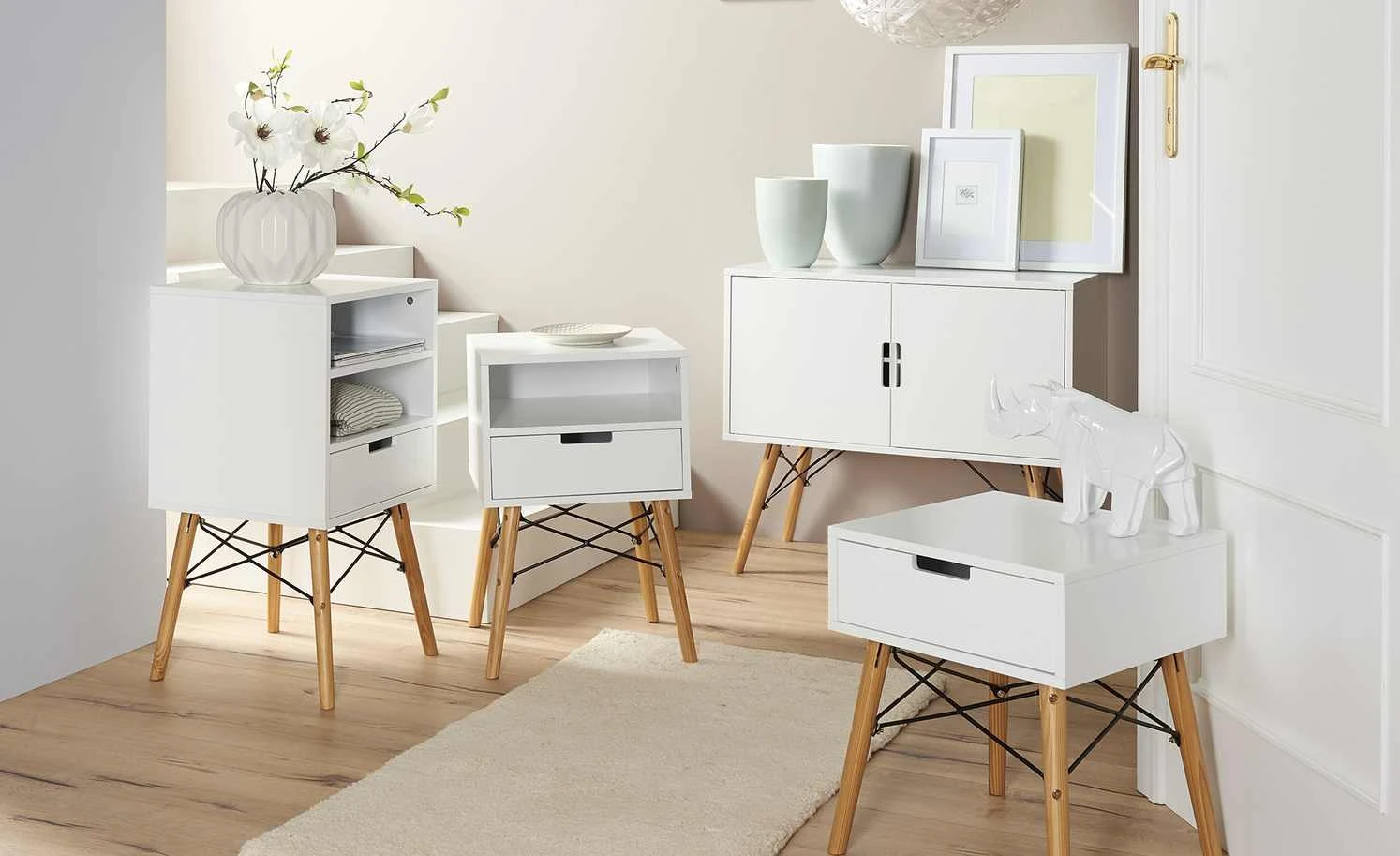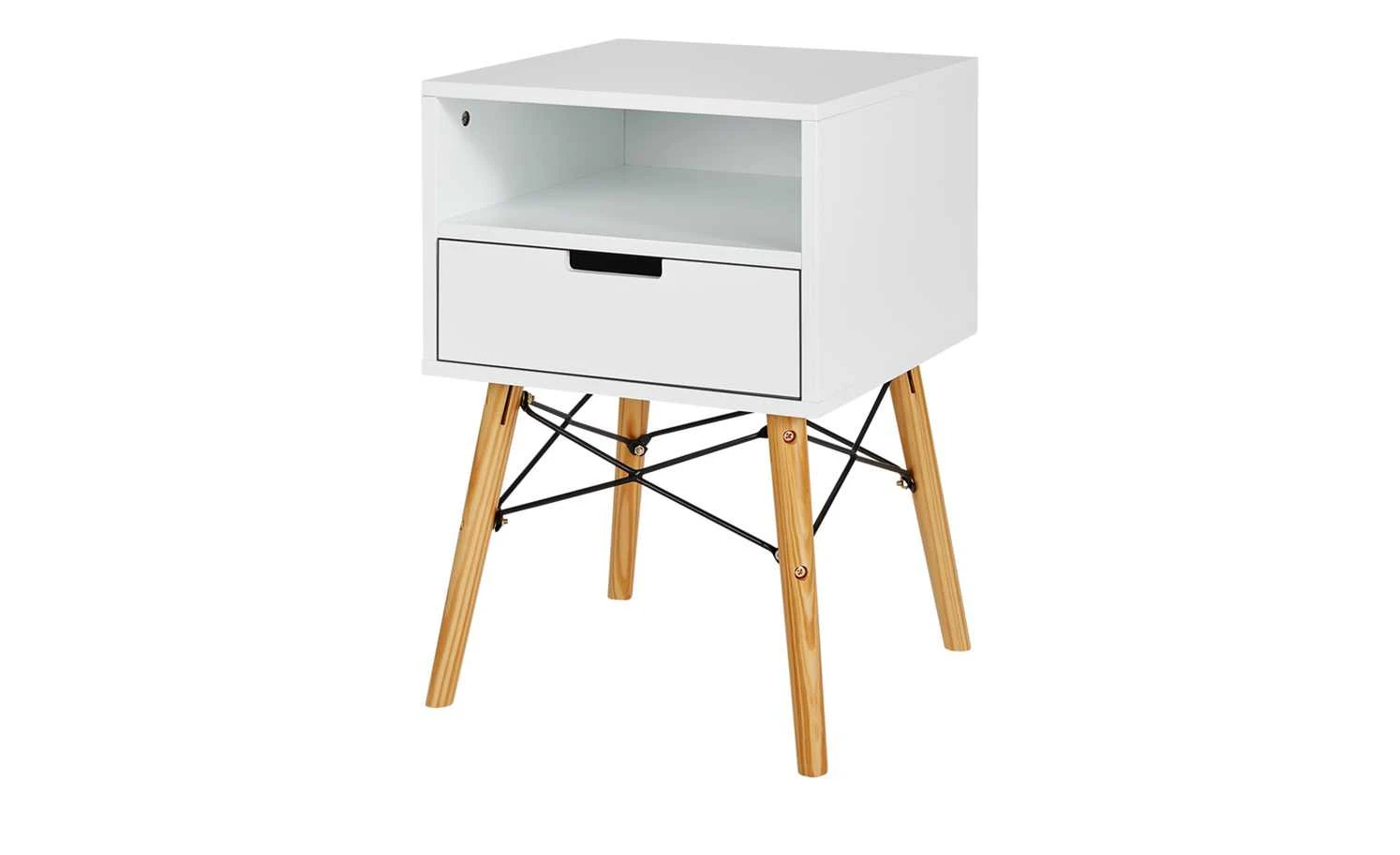 Luftig und leicht wirkt die Kommode New York 1. Der matt-weiße Farbton wird durch die Beine aus massivem Pinienholz kontrastiert. Durch die besondere Beinform, die an Möbel aus den 50er/60er Jahren erinnert, bekommt New York 1 einen geschmackvollen Retro-Touch. Die gekreuzten Verstrebungen zwischen den Beinen sind aus pulverbeschichtetem Metall und geben New York 1 eine moderne Note. Korpus und Fronten bestehen aus stabilem MDF. Oberhalb der Schublade finden Sie ein offenes Fach für Zeitschriften oder stilvolle Deko-Artikel.
