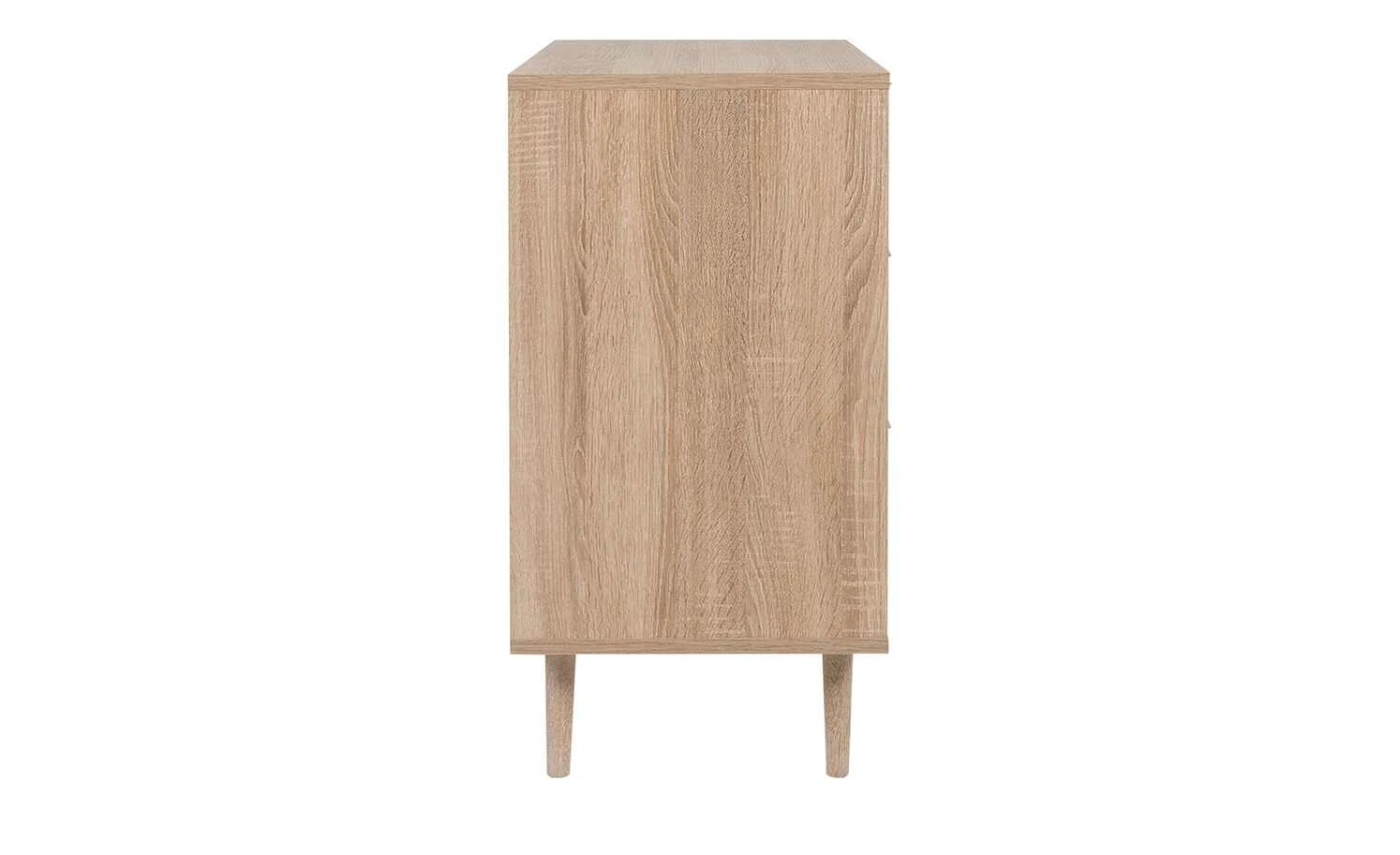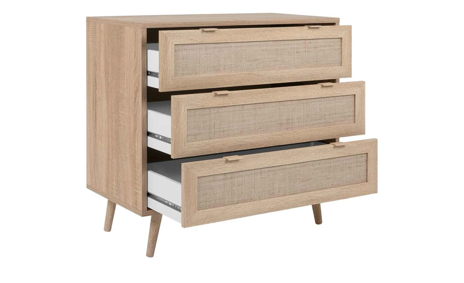 Die Kommode Rafia ist vielseitig einsetzbar und bietet großzügigen Stauraum für Ihre Sachen. Hinter den drei dekorativen Schubfachfronten in Bastgeflecht-Optik finden Kleidung, Spiele und andere Dinge problemlos Platz. Die helle Kommode wird von vier schräg zulaufenden Eichen-Massivholzfüßen getragen und macht in allen Räumen eine gute Figur. Die Serie Rafia erinnert an den beliebten Boho-Stil und fügt sich in nahezu alle Einrichtungskonzepte problemlos ein.