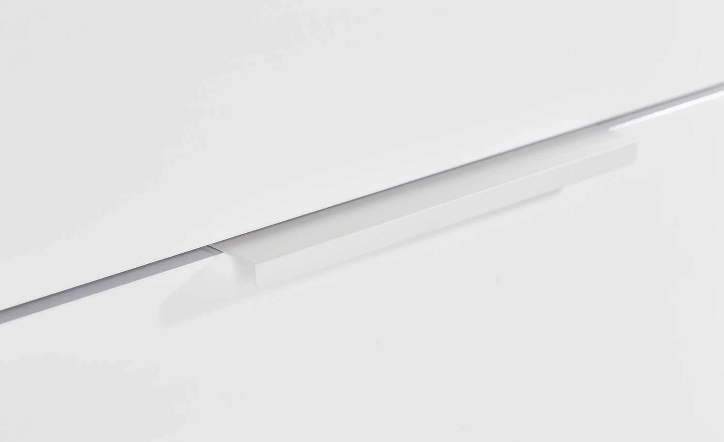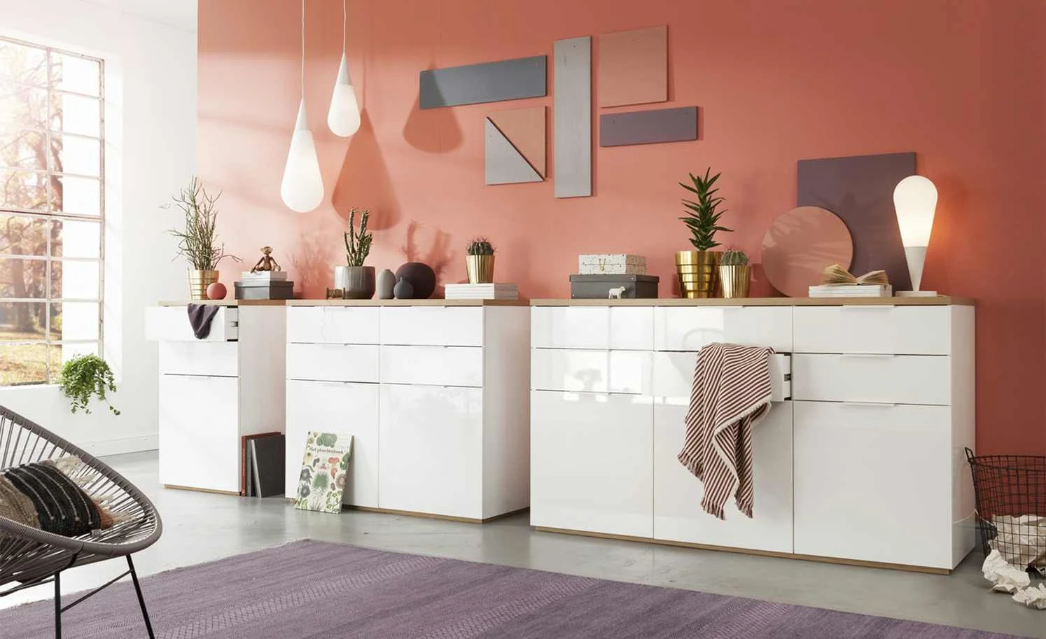 Urbanes Design und viel Stauraum machen die Kommode Siena zum Highlight eines jeden Raumes. Korpus und Front sind weiß und haben ein edles Hochglanzfinish. Abdeckplatte und Unterboden sind in Eiche Riviera (Nachbildung) gehalten und rahmen das Weiß so schön ein. Dank ihrer Beschichtung sind die Oberflächen kratzerunempfindlich. Siena verfügt über vier Schubladen und sechs Fächer hinter den beiden Türen.
