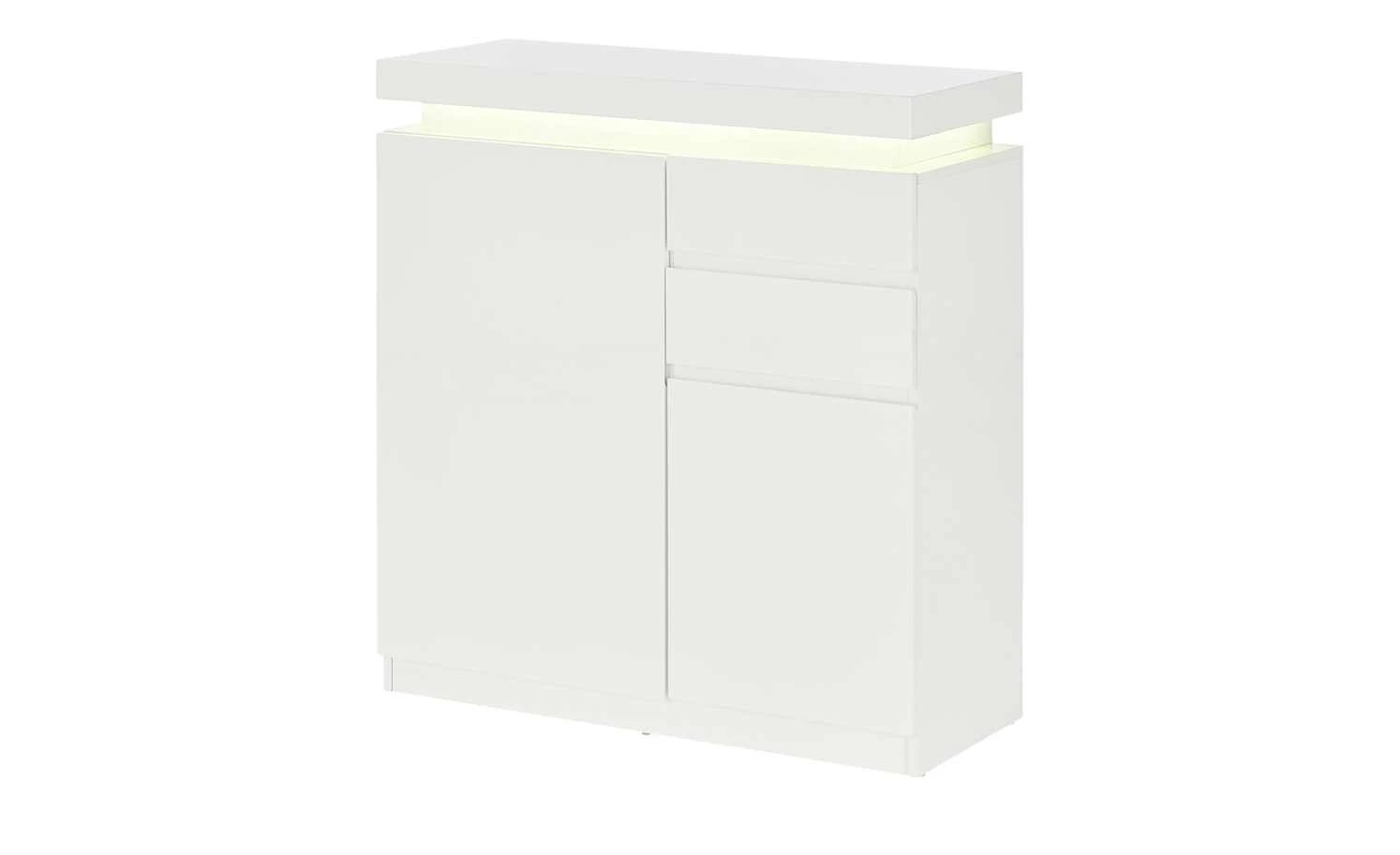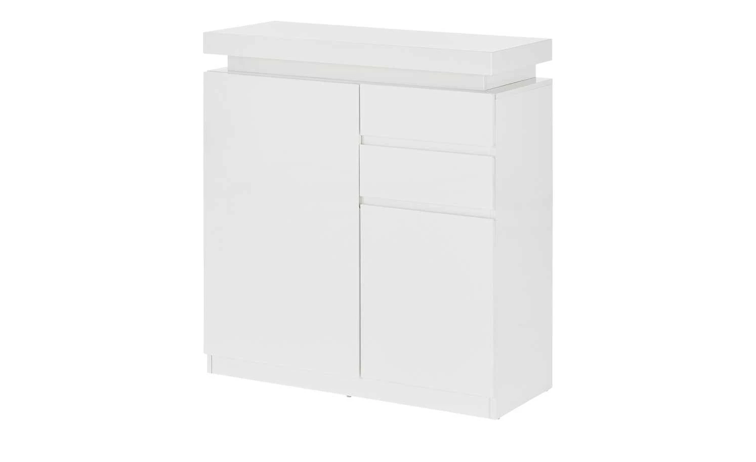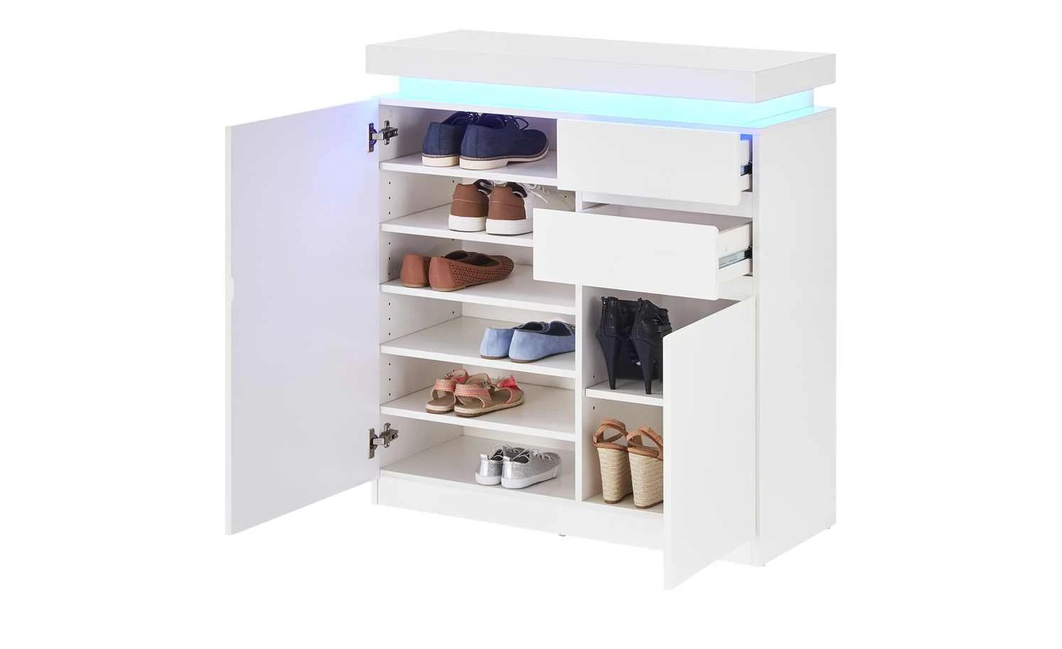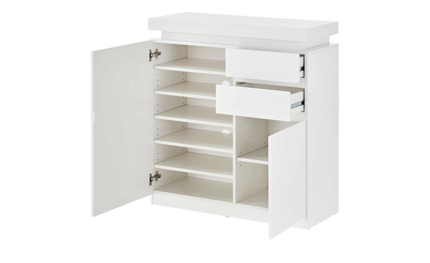 Zweckmäßig und stylisch: Dieser weiße Kommode mit integrierter Beleuchtung bringt Ordnung und Glanz in Ihr Zuhause. Hinter einer großen Tür auf der linken Seite der Kommode befinden sich 5 Einlegeböden. Hier können Sie Ihre Schuhe übersichtlich neben- und übereinander aufbewahren. Weiteren Stauraum finden Sie in 2 Fächern hinter einer kleinen Tür im rechten Bereich des Schranks. Darüber bieten zwei Schubladen Platz für Schuhputzzeug und andere Utensilien. Torri ist komplett weiß lackiert, wobei die Kommode eine auffällige Hochglanzoptik erhalten hat. Für farbige Akzente sorgt die Beleuchtung, die im Lieferumfang enthalten ist. Sie kann die Farbe wechseln und setzt den Schrank in Szene.