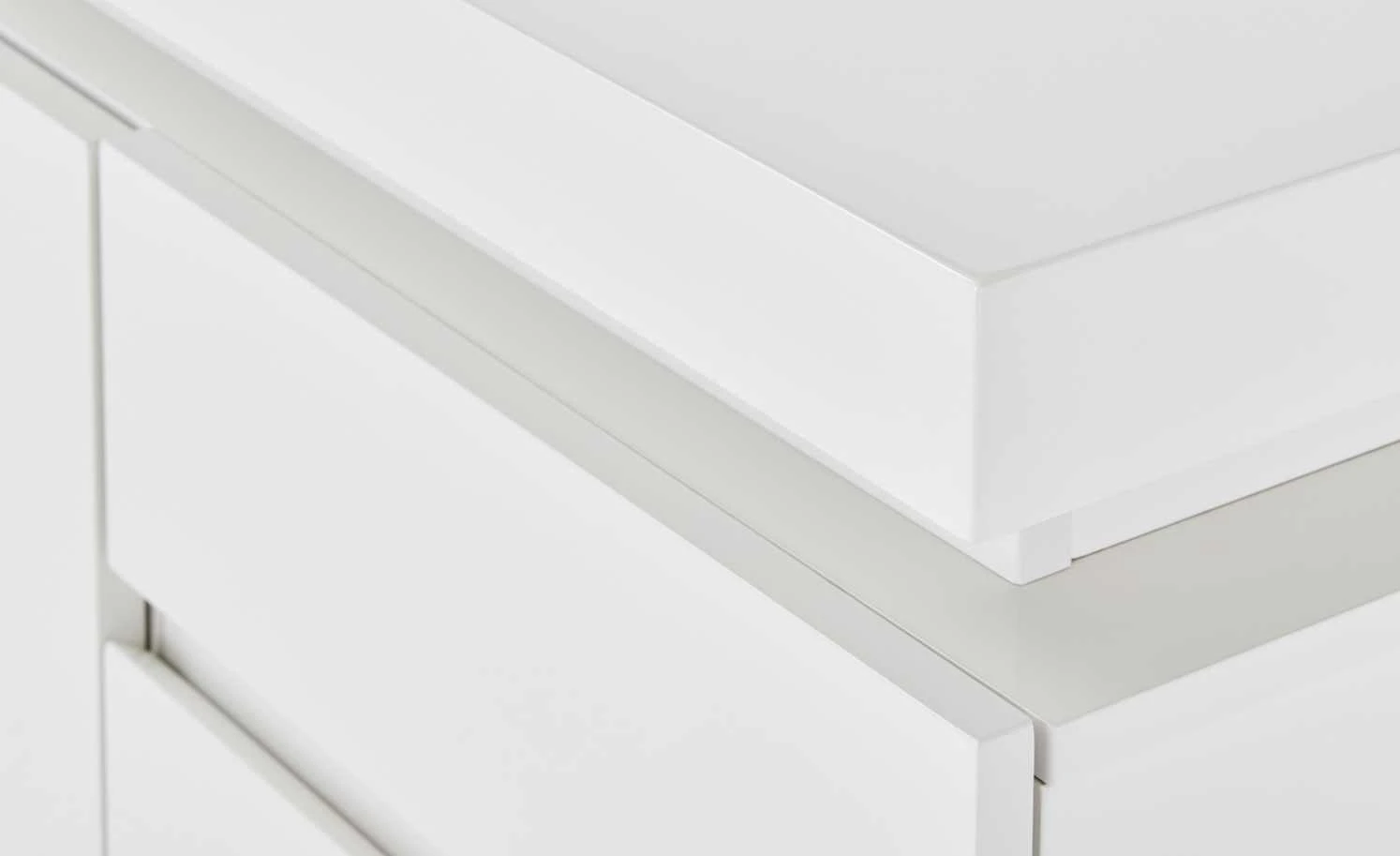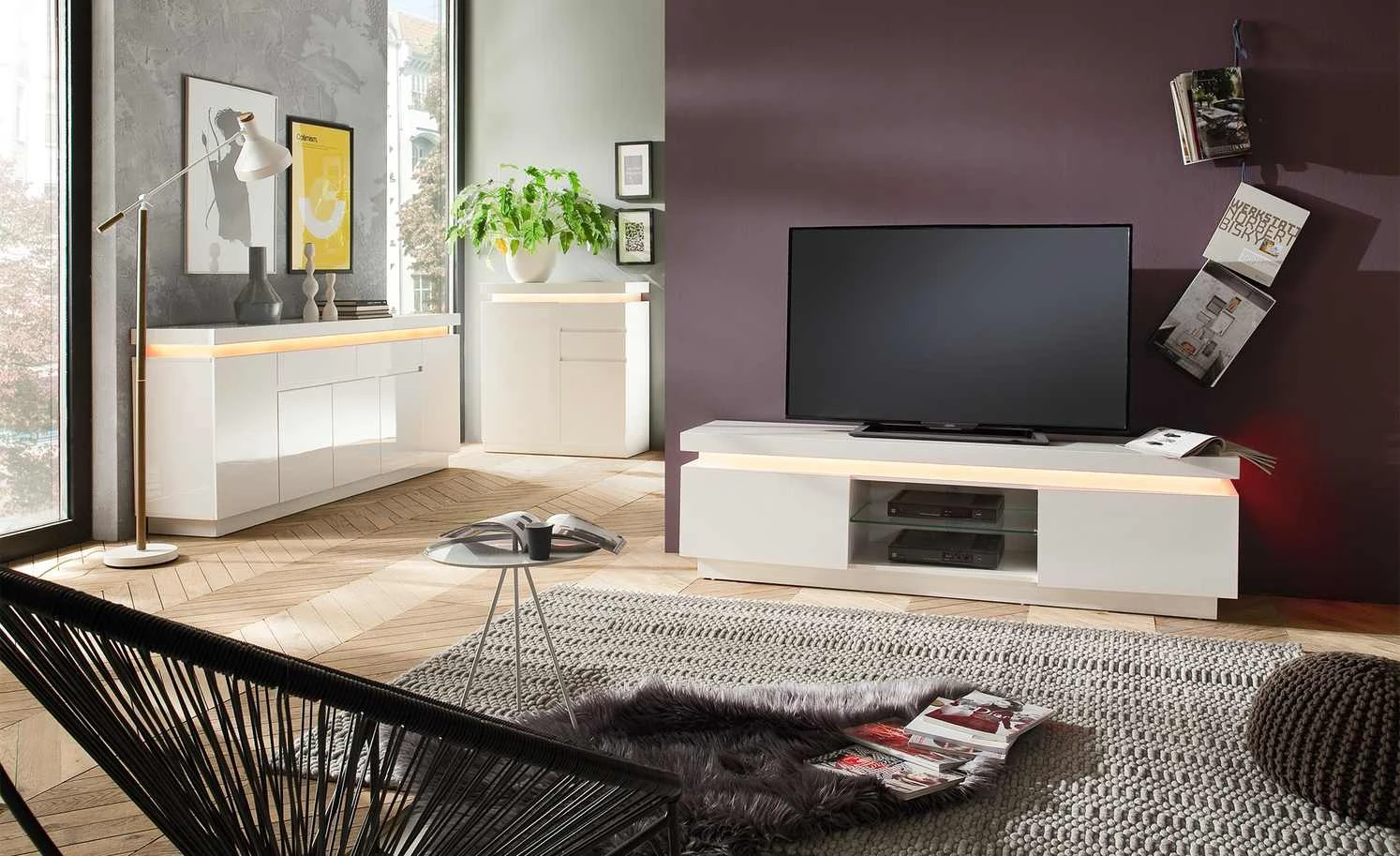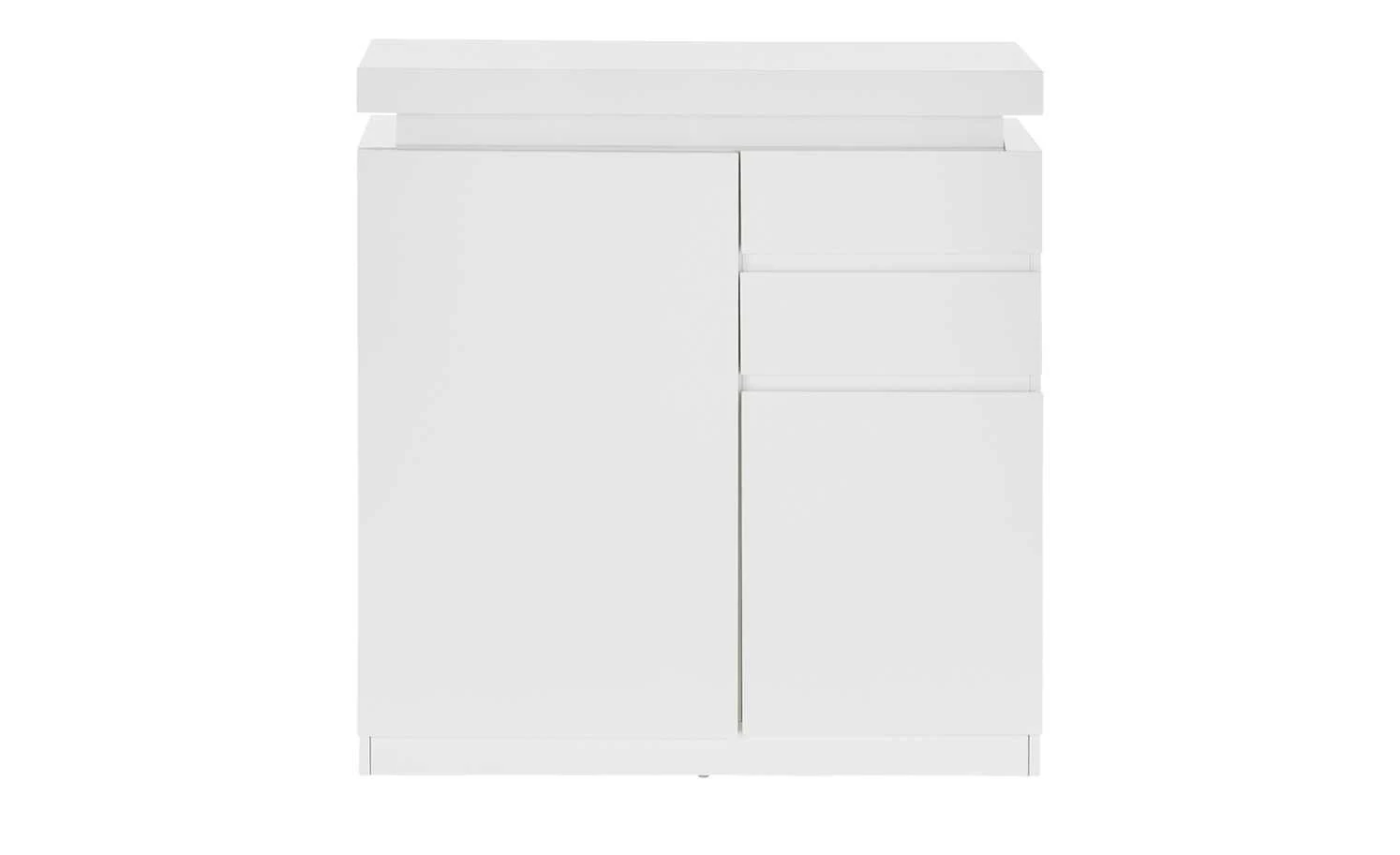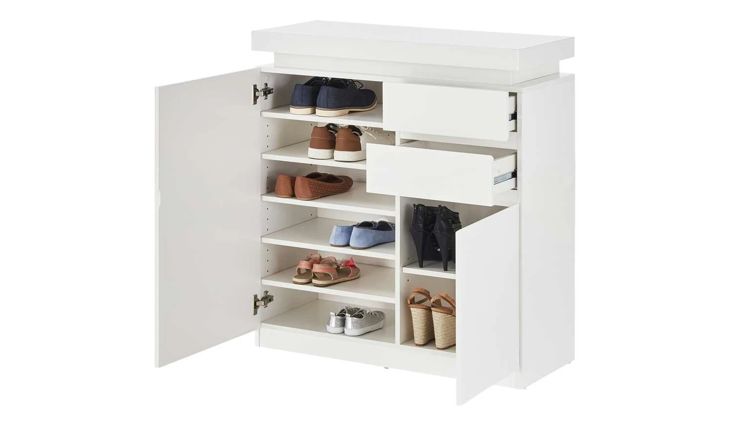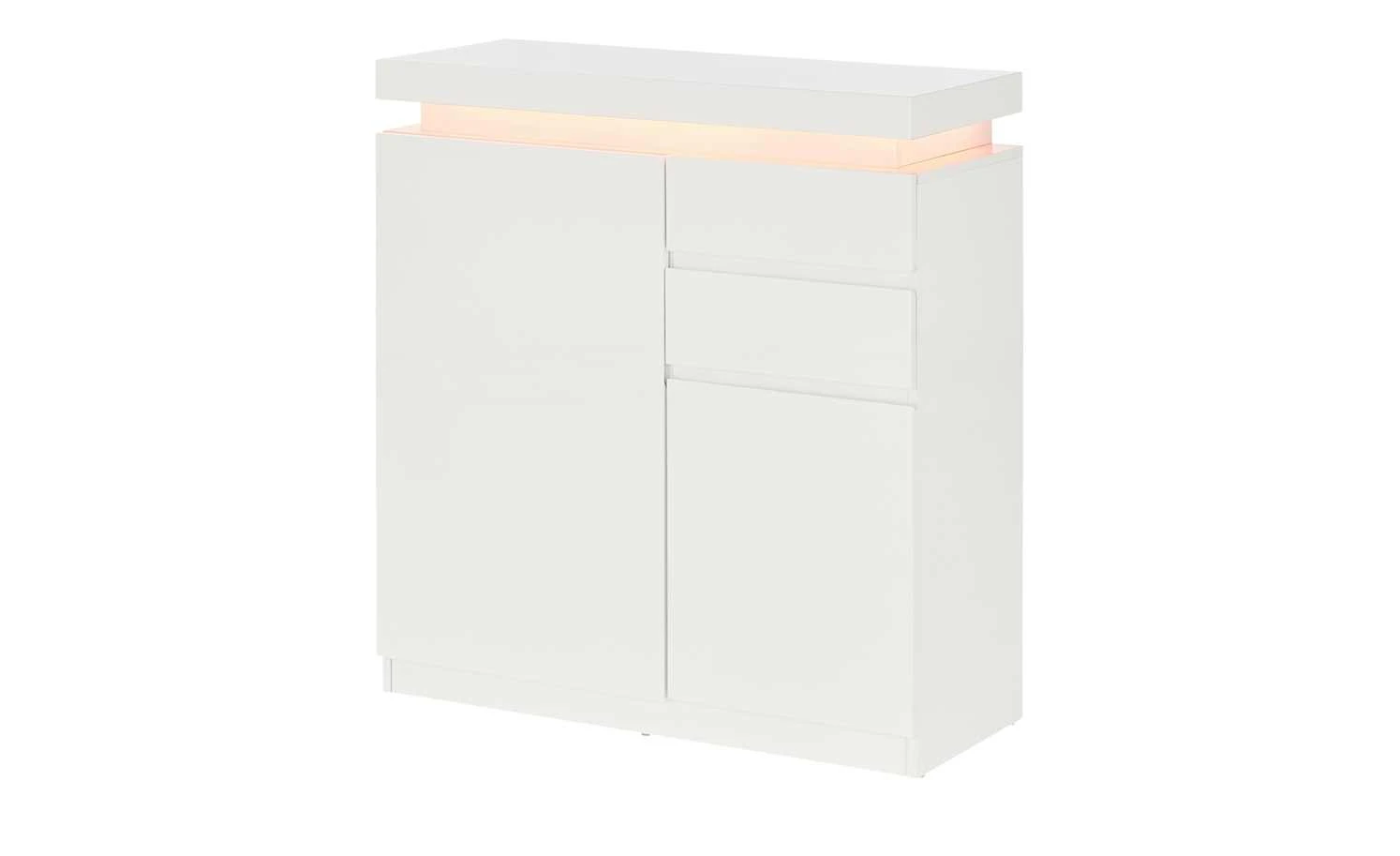 Zweckmäßig und stylisch: Dieser weiße Kommode mit integrierter Beleuchtung bringt Ordnung und Glanz in Ihr Zuhause. Hinter einer großen Tür auf der linken Seite der Kommode befinden sich 5 Einlegeböden. Hier können Sie Ihre Schuhe übersichtlich neben- und übereinander aufbewahren. Weiteren Stauraum finden Sie in 2 Fächern hinter einer kleinen Tür im rechten Bereich des Schranks. Darüber bieten zwei Schubladen Platz für Schuhputzzeug und andere Utensilien. Torri ist komplett weiß lackiert, wobei die Kommode eine auffällige Hochglanzoptik erhalten hat. Für farbige Akzente sorgt die Beleuchtung, die im Lieferumfang enthalten ist. Sie kann die Farbe wechseln und setzt den Schrank in Szene.