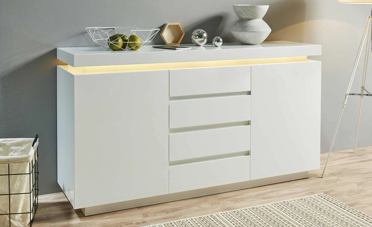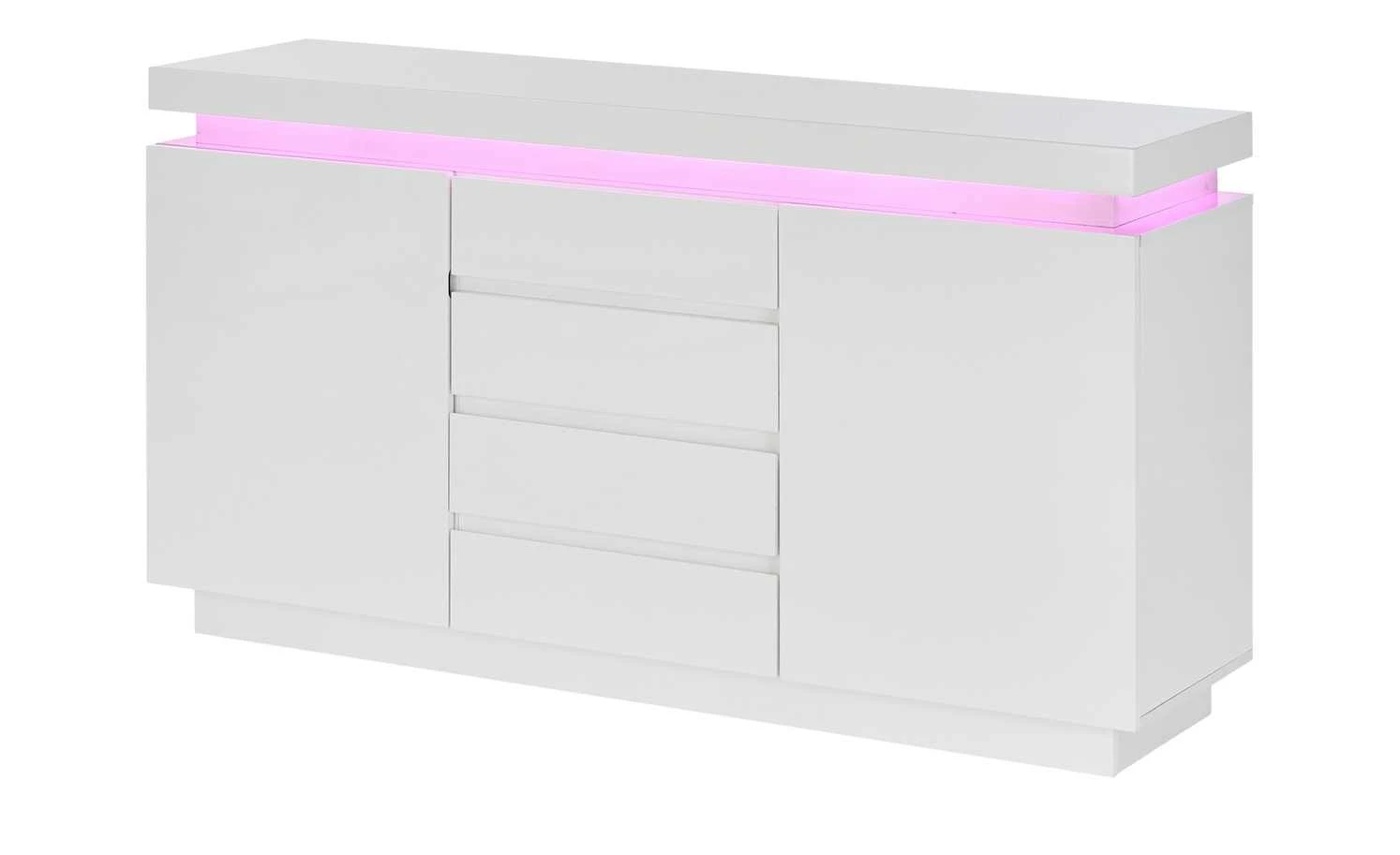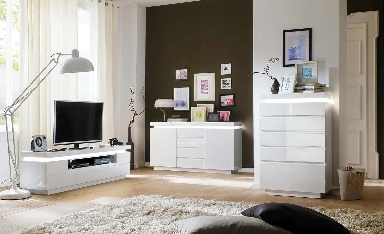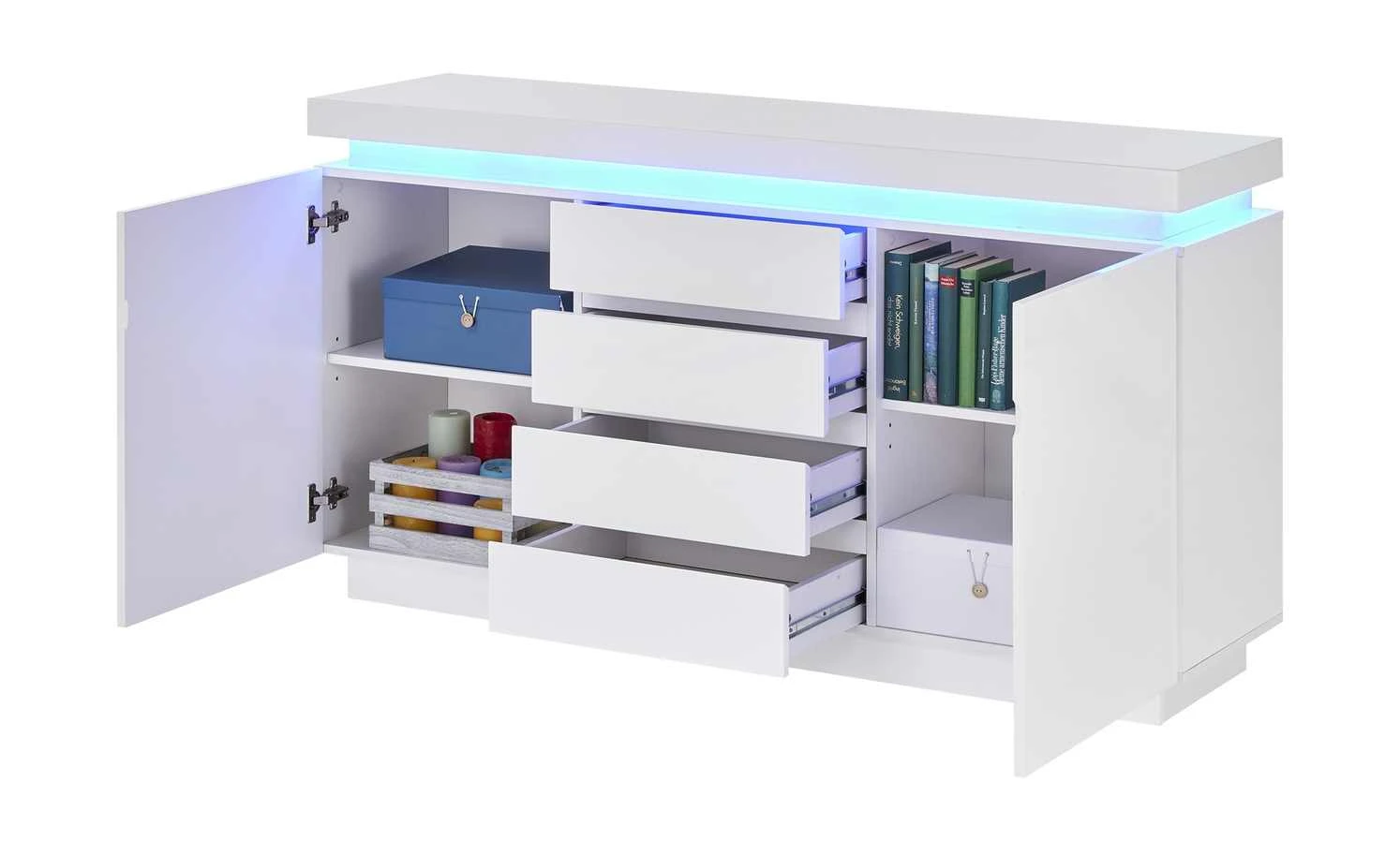 Die Kommode Torri ist eine Bereicherung für Ihren Wohnraum. Mit ihrem freundlichen Weiß und dem auffälligen Hochglanz macht die Kommode optisch etwas her. Auch der Stauraum lässt keine Wünsche offen. Die Kommode hat links und rechts jeweils eine Tür. Dahinter finden Sie jeweils zwei Fächer, die durch einen Boden voneinander getrennt werden. Mittig hat Torri außerdem vier geräumige Schubfächer. Das Highlight ist aber die Beleuchtung, die ihre Farbe wechseln kann. Sie wird per Fernbedienung bequem gesteuert und sorgt für eine gemütliche Atmosphäre.