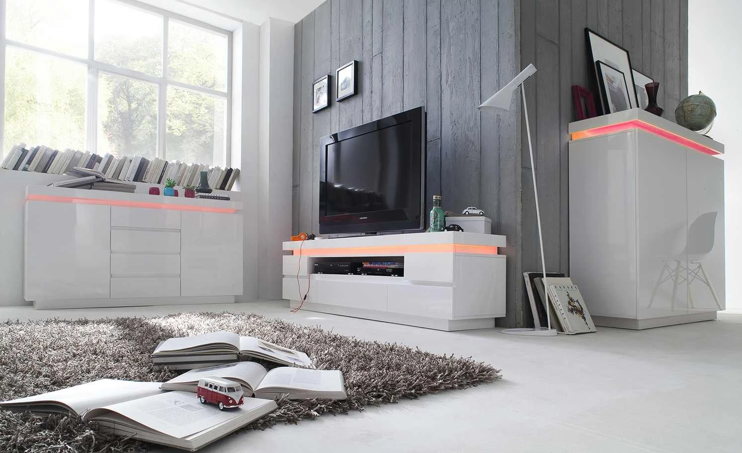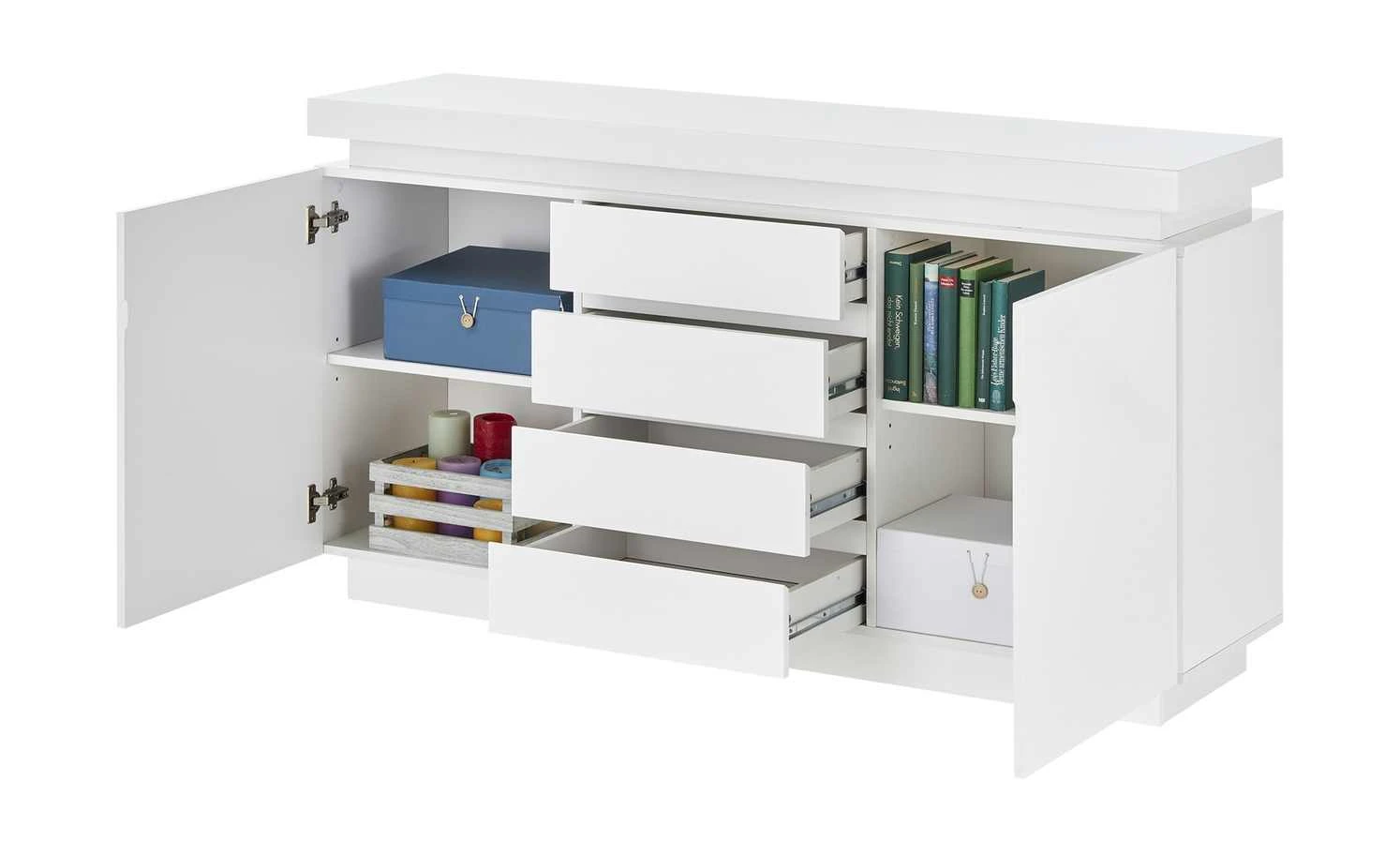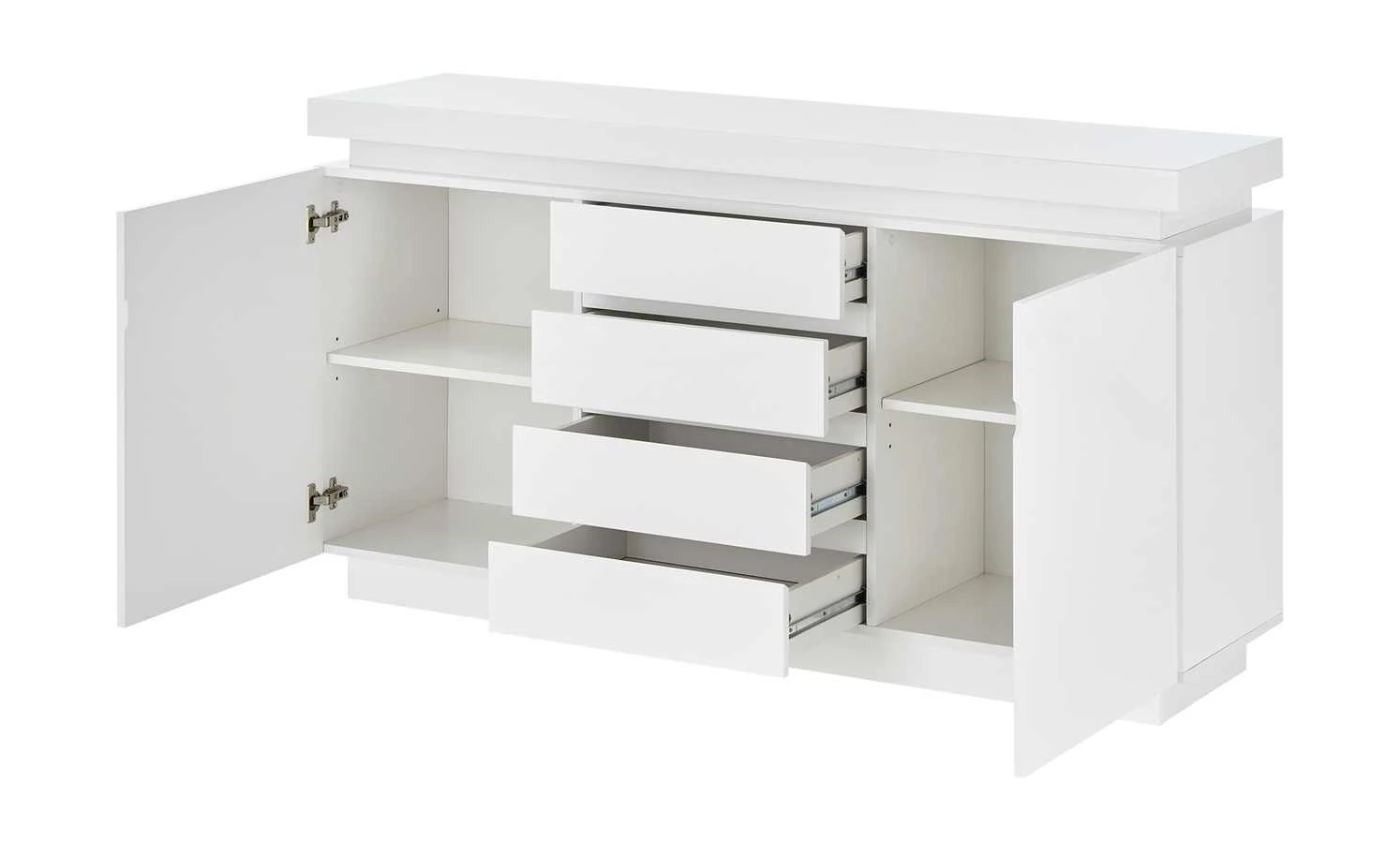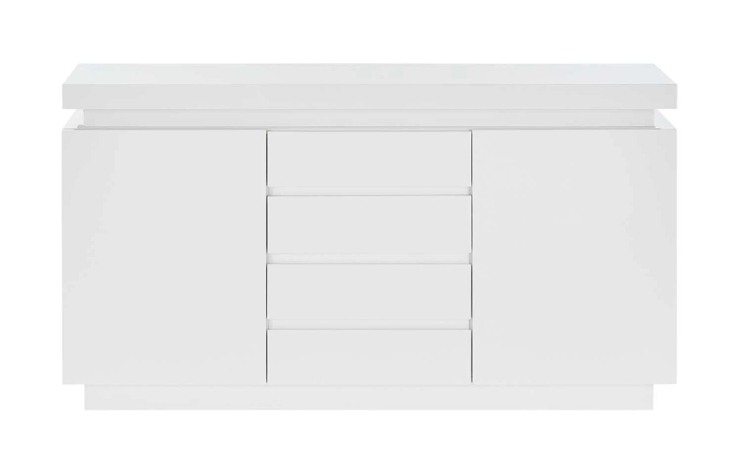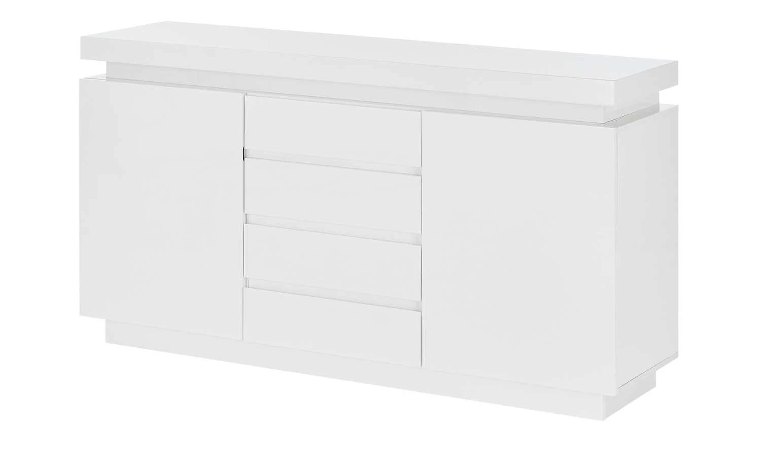 Die Kommode Torri ist eine Bereicherung für Ihren Wohnraum. Mit ihrem freundlichen Weiß und dem auffälligen Hochglanz macht die Kommode optisch etwas her. Auch der Stauraum lässt keine Wünsche offen. Die Kommode hat links und rechts jeweils eine Tür. Dahinter finden Sie jeweils zwei Fächer, die durch einen Boden voneinander getrennt werden. Mittig hat Torri außerdem vier geräumige Schubfächer. Das Highlight ist aber die Beleuchtung, die ihre Farbe wechseln kann. Sie wird per Fernbedienung bequem gesteuert und sorgt für eine gemütliche Atmosphäre.