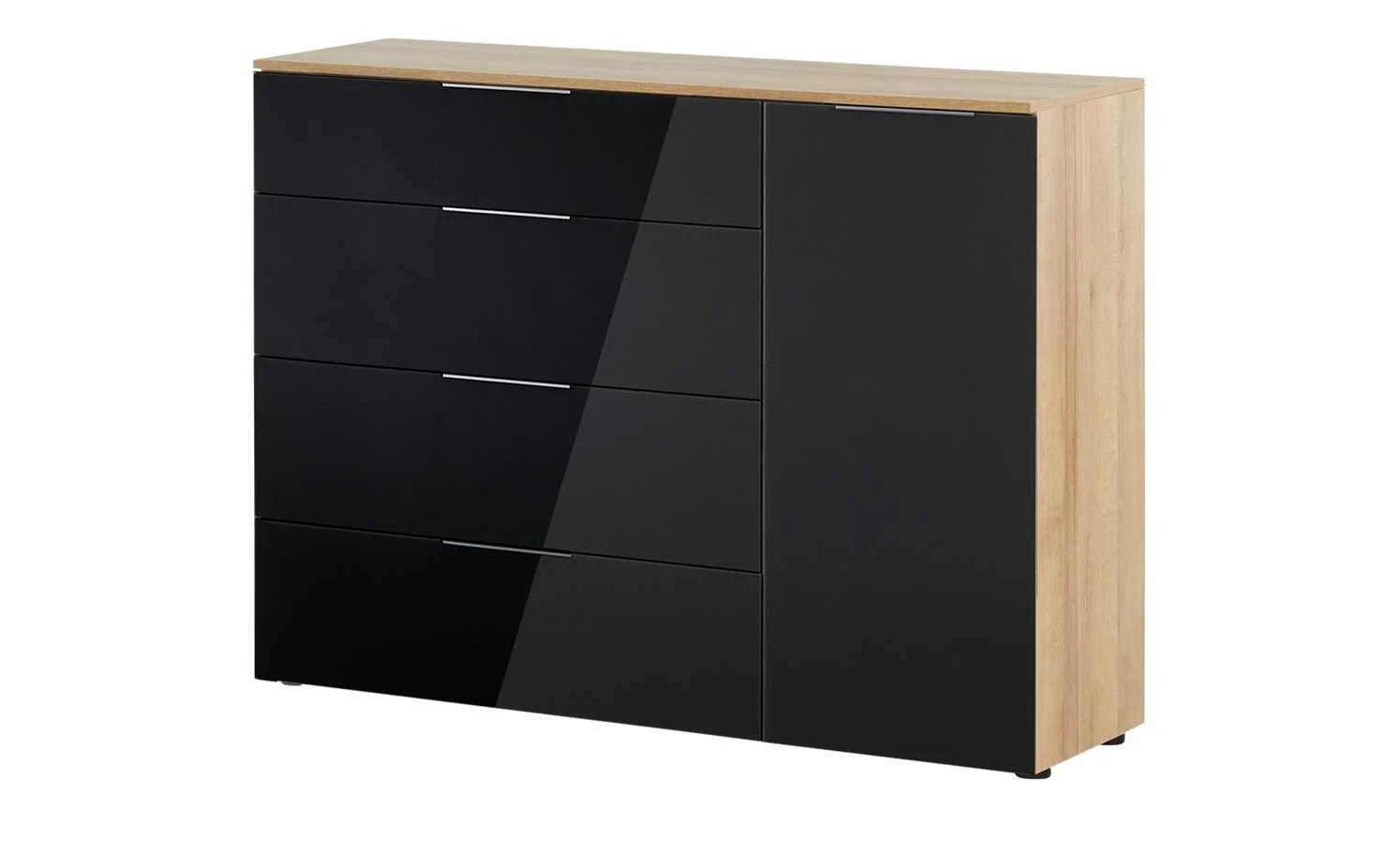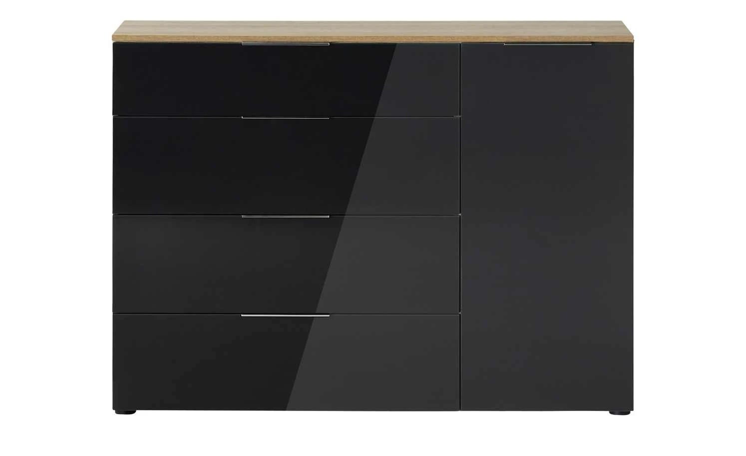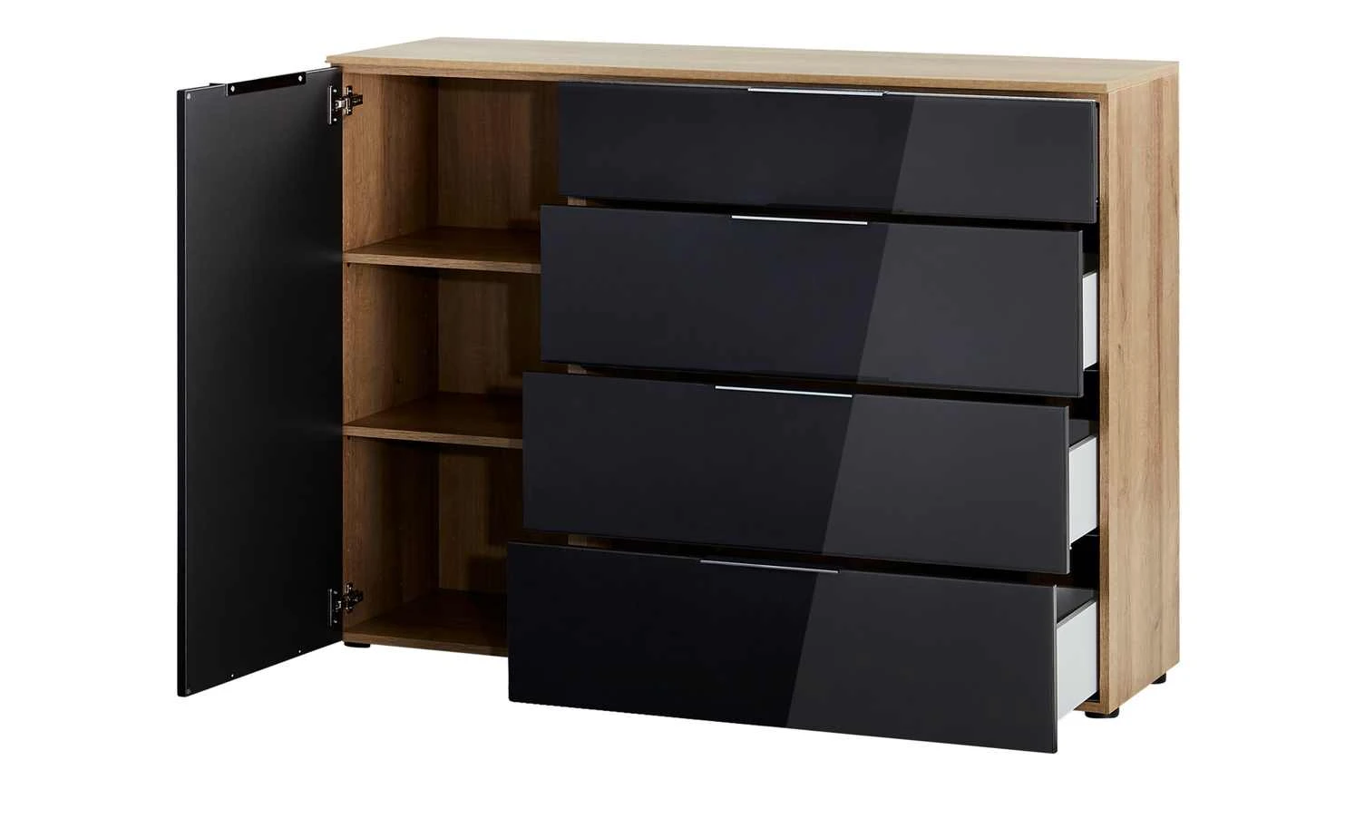 Mit ihrem modernen Look und praktischen Nutzen ist die Kommode Vitreo ein Highlight für jeden Raum. Die geradlinige Linienführung wird mit einem coolen Anthrazit kombiniert. Die Front hat eine Oberfläche aus ESG-Sicherheitsglas. Es ist besonders hart und widerstandsfähig – und gibt der Front ein glänzendes Finish. Zusätzliche Akzente werden durch die verchromten Griffleisten gesetzt. Der Korpus der Kommode hat eine natürliche Holzoptik. Er ist melaminbeschichtet und somit kratzerunempfindlich und leicht zu pflegen. Vitreo ist mit vier großen Schubladen ausgestattet, die übereinander angeordnet sind. Links davon befindet sich eine Tür mit drei Fächern dahinter. Alle vier Schubkästen und die Tür haben eine integrierte Soft-Close-Funktion für leises Schließen.