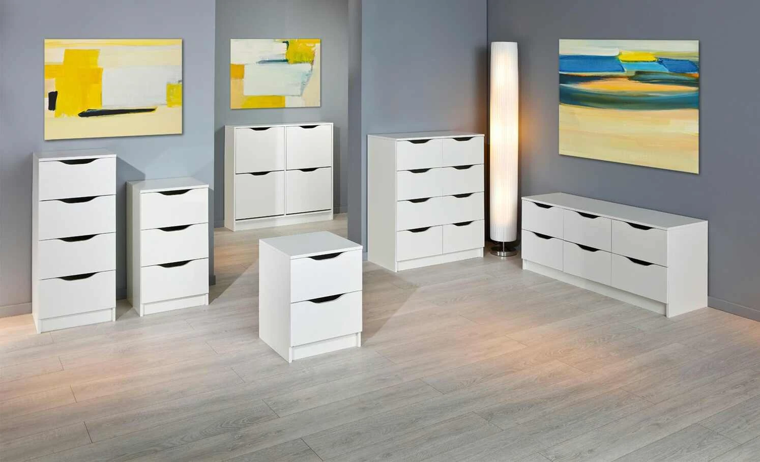Diese praktische Kommode bietet großzügigen Stauraum in acht Schubfächern. Durch die pflegeleichten, weißen Oberflächen lässt sich die Kommode in zahlreiche Einrichtungskonzepte und Räume integrieren.