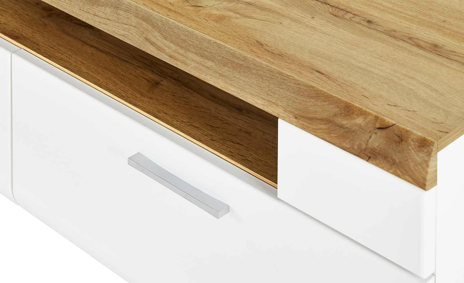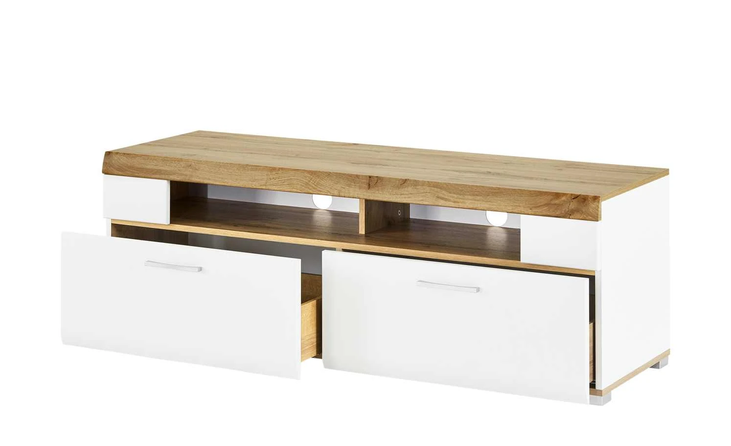 Dieses moderne Lowboard bringt Ihren Raum zum Strahlen. Überwiegend in mattem Weiß gehalten, wirkt das Lowboard frisch und elegant. In den beiden Schubladen mit Metallgriffen kann so einiges verstaut werden. Auf der oberen Fläche in Eichen-Altholz-Optik findet Ihr TV-Gerät ausgiebigen Platz. Darunter gibt es noch zwei Fächer, z. B. für andere Elektro-Geräte. Praktisch ist auch der Kabelkanal, so dass Kabelsalat gar nicht erst aufkommen kann.