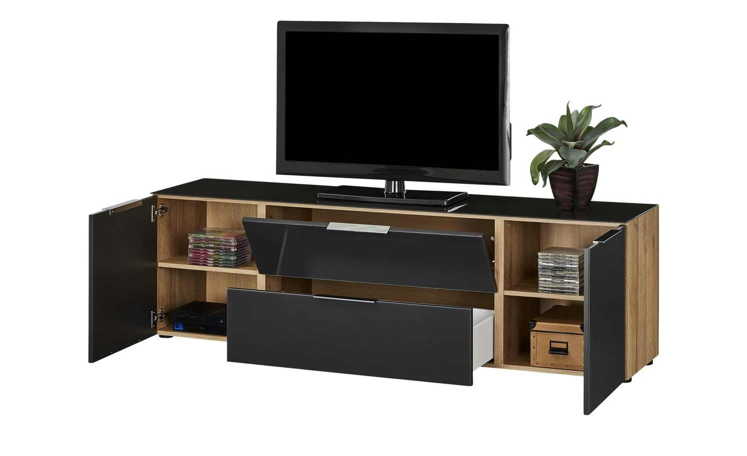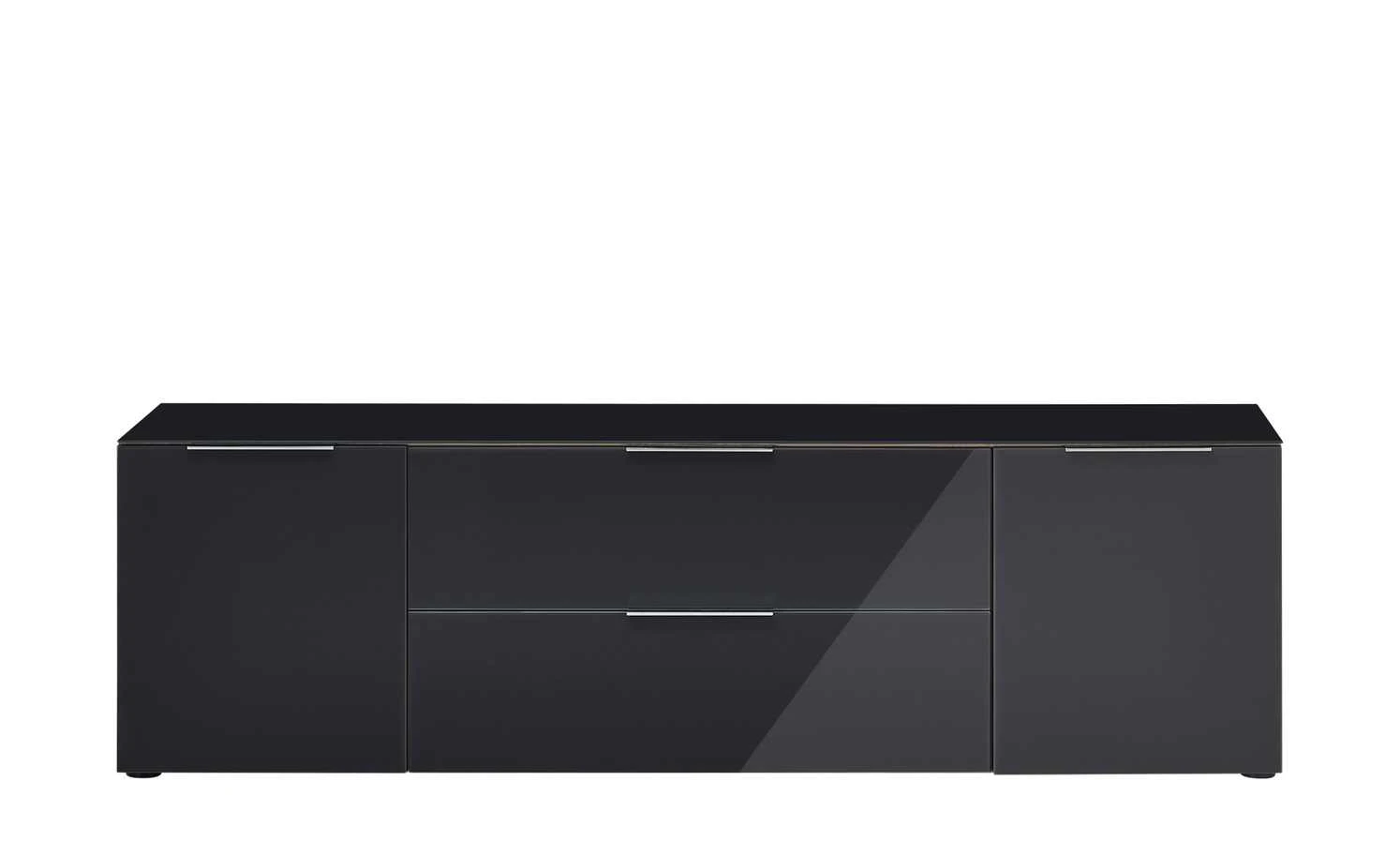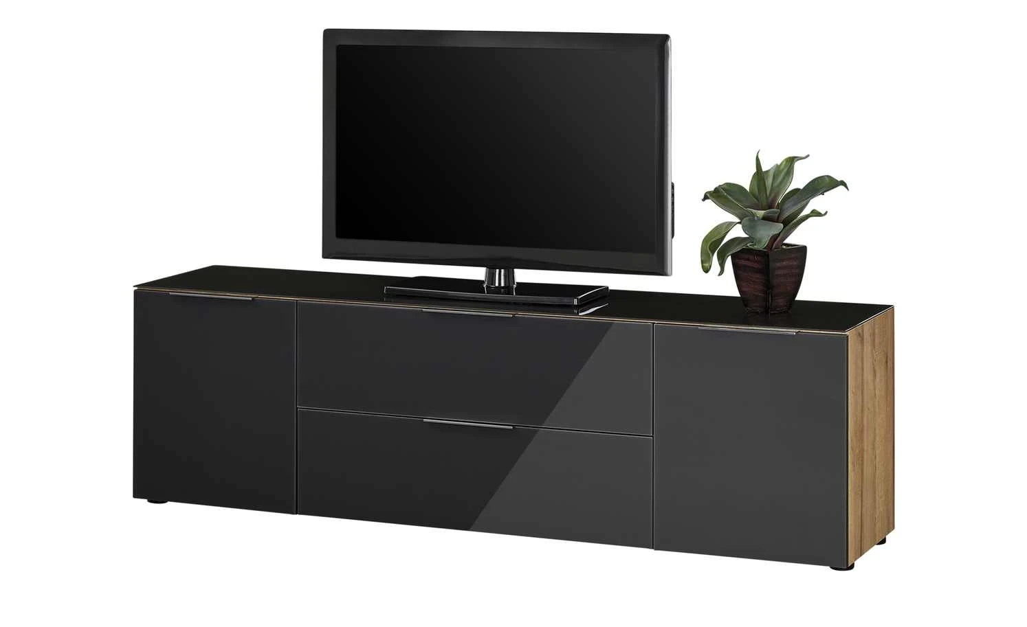 Beim Lowboard Vitreo ist weniger definitiv mehr. Es hat ein reduziertes, geradliniges Design. Front und Abdeckplatte sind in stylischem Anthrazit designt und haben eine Oberfläche aus ESG-Sicherheitsglas. Es hat ein glänzendes Finish und bringt die Farbe so noch mehr zum Strahlen. Die schmalen Möbelgriffe sind besonders dezent designt, um den ebenmäßigen Look nicht zu stören. Der Korpus setzt sich mit seinem feinen Holzdekor ab. Er ist melaminbeschichtet und deshalb besonders widerstandsfähig. Vitreo verfügt über zwei Türen, eine Klappe und eine Schublade. Dank der integrierten Dämpfung schließen sie alle sanft und geräuscharm. Das Lowboards ist aus besten Materialien gefertigt und mit dem Siegel Made in Germany ausgezeichnet.