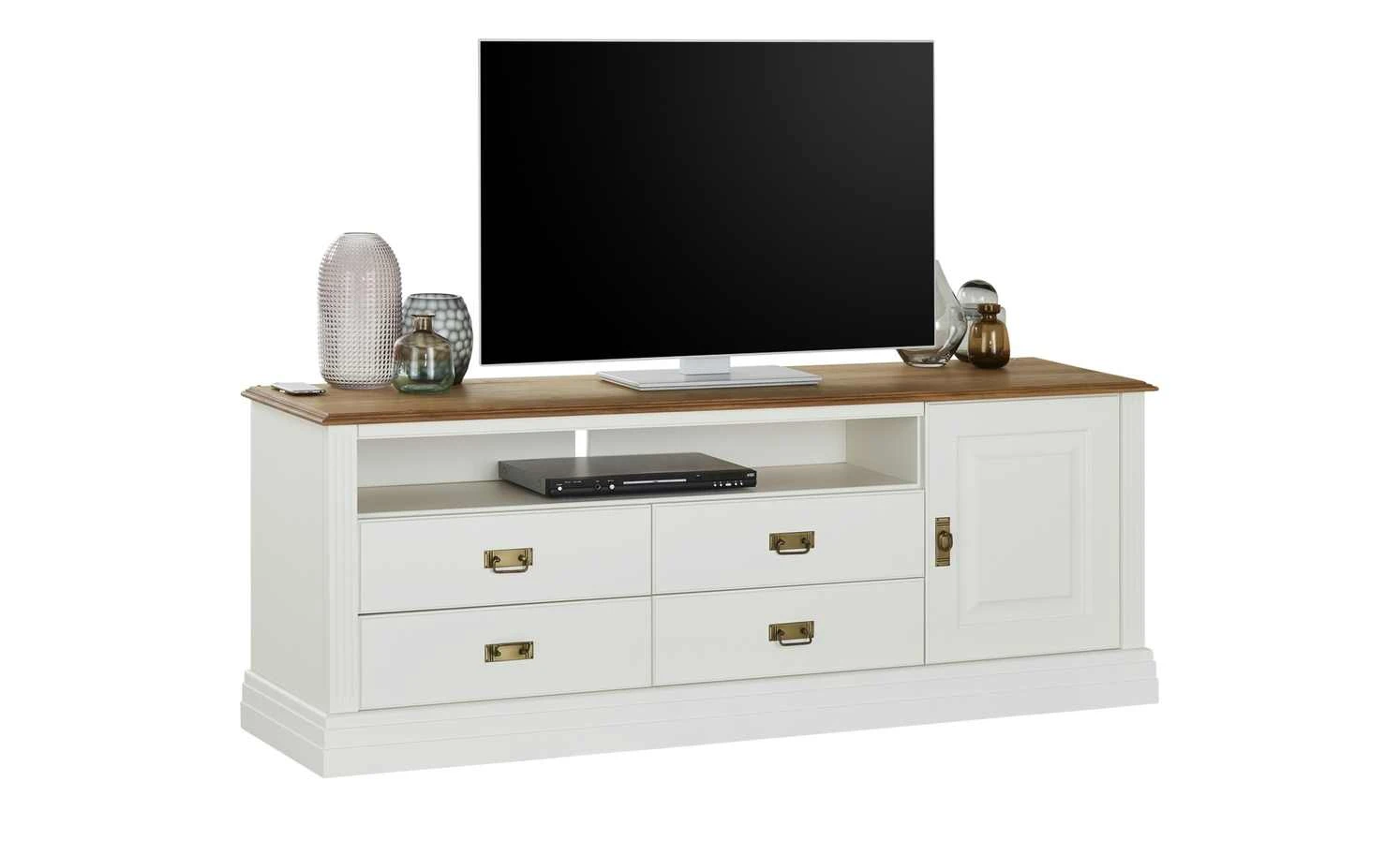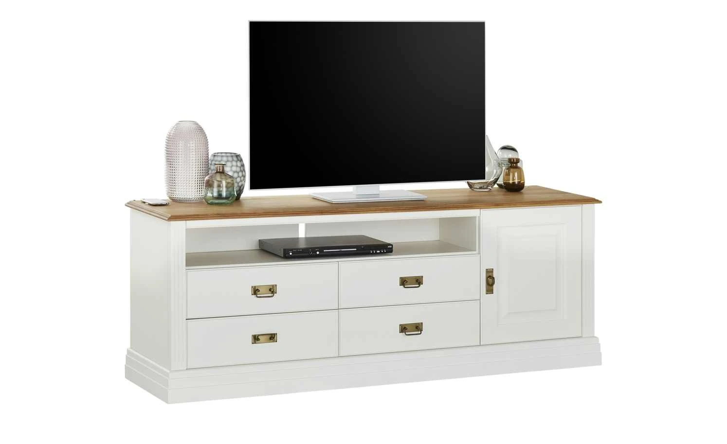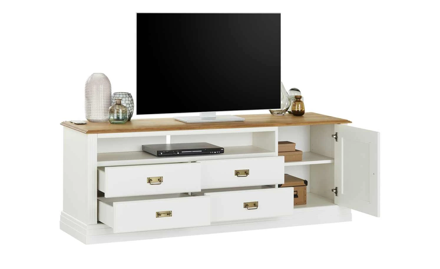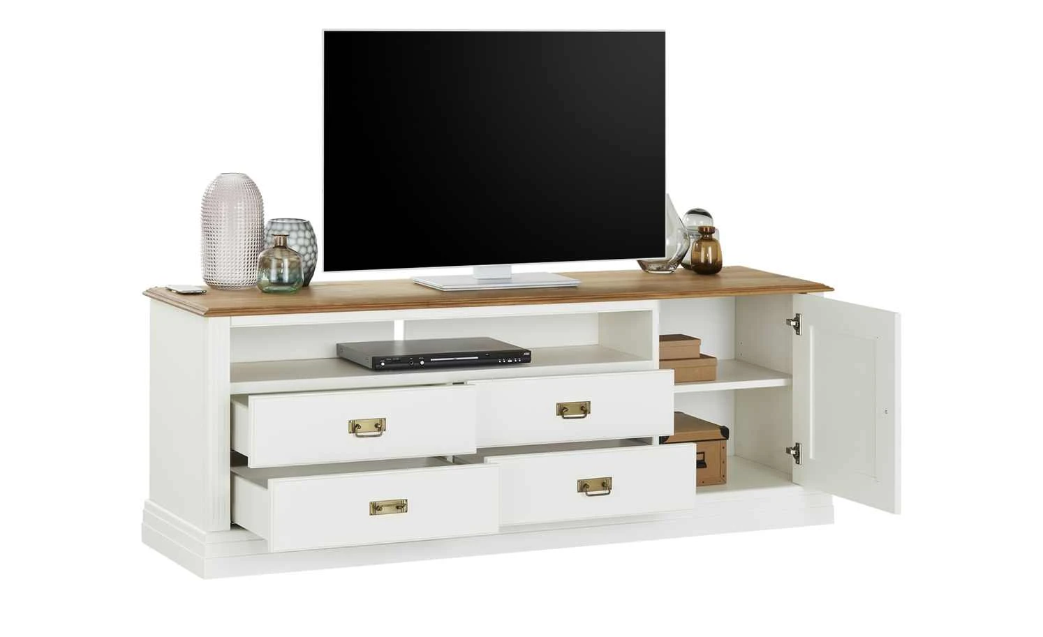 Das Landhausdesign strahlt Gemütlichkeit und Geborgenheit aus. Auch das TV-Lowboard Lina von der Marke maison bleue ist im Landhausstil designt. Passend dazu: der freundliche reinweiße Farbton. Die Abdeckplatte setzt sich in Wildeiche Natur ab. Ein schöner, natürlicher Kontrast zur hellen Farbe. Lina ist komplett aus Massivholz gefertigt. Dadurch ist das Lowboard besonders stabil und langlebig. Auch die Verarbeitung und fein lackierten bzw. geölten Oberflächen haben eine herausragende Qualität. Neben Platz für Ihren Fernseher und einem großen Gerätefach, bietet Lina Stauraum hinter einer Tür und in zwei Schubladen. Das Kabelmanagement sorgt dafür, dass störender Kabelsalat verhindert wird.