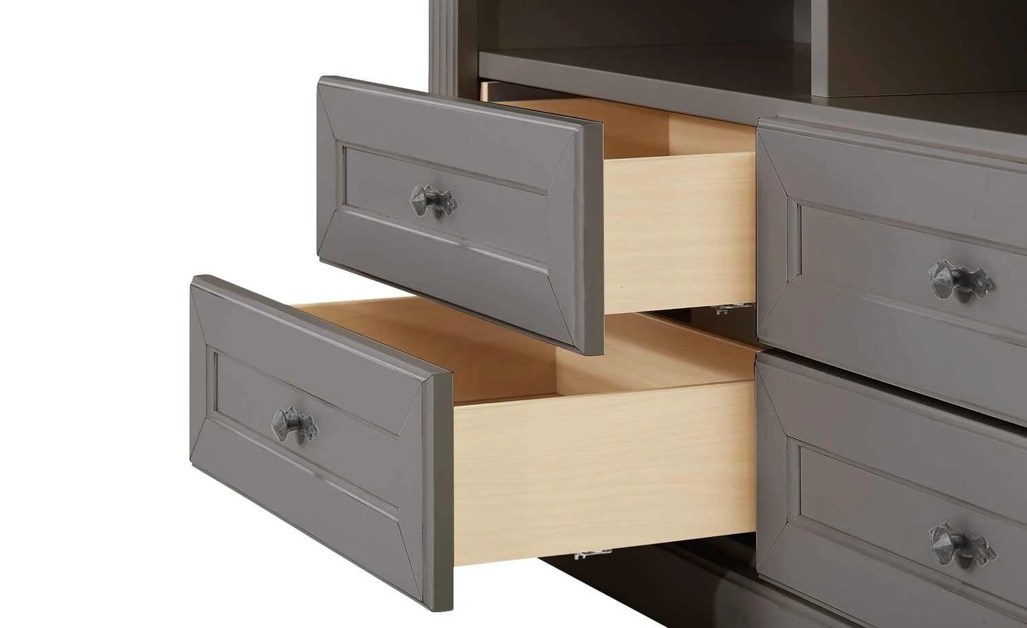 - Mehr zu Ausstattung / Funktion: Schubkästen sind mit kugelgelagerten Unterflurauszügen, Selbsteinzug und Dämpfung ausgestattet, Gerätefächer mit je 1 Kabeldurchlass, Belastbarkeit der Schubkästen: max. 15 kg