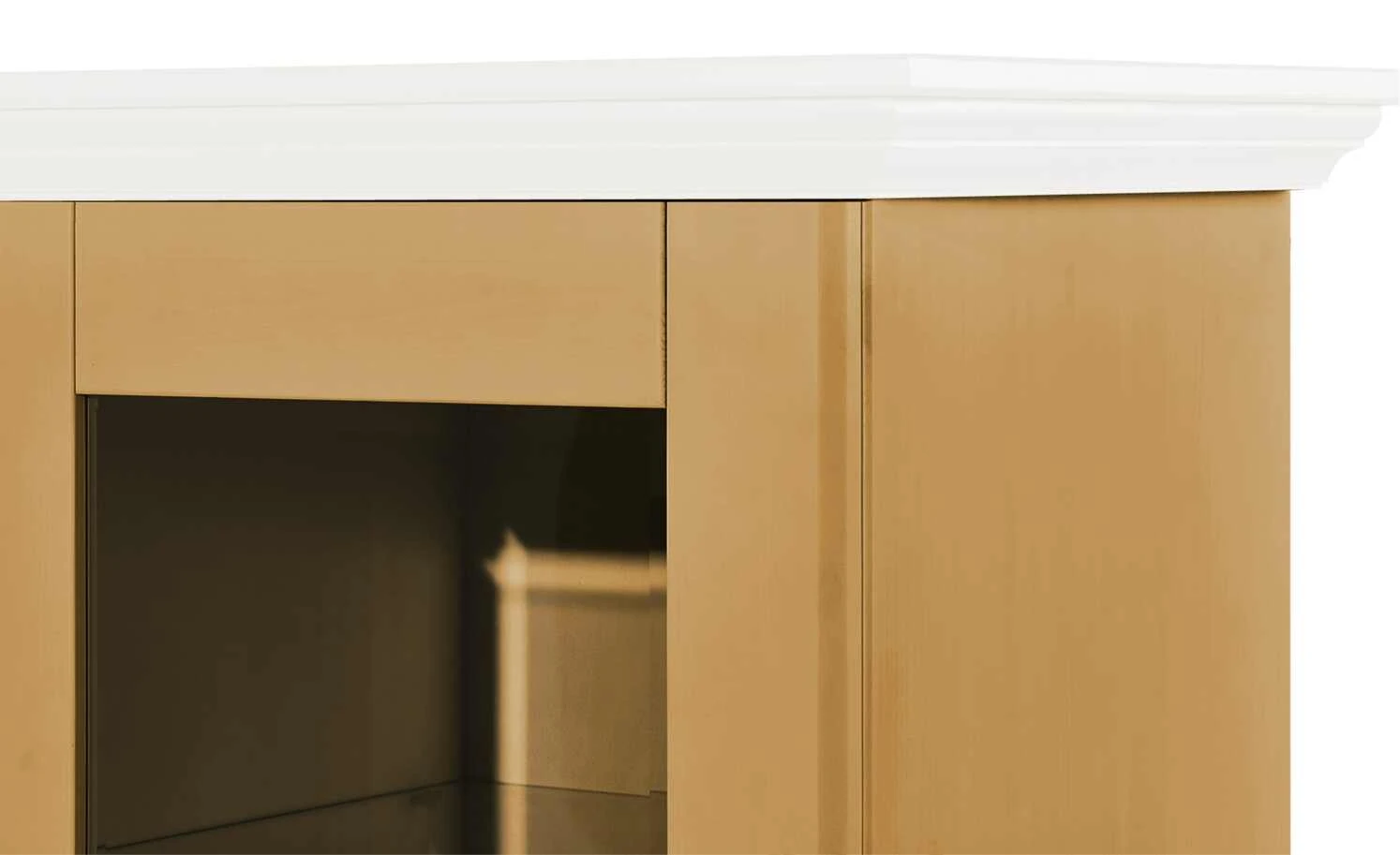 Vitrinen sind gleich doppelt praktisch. Sie bieten Stauraum – und zeitgleich können Sie darin Ihr Geschirr oder Porzellan in Szene setzen. Der Vitrinenaufsatz Florian von maison bleue ist eine Ergänzung für das gleichnamige Sideboard. Er wird einfach auf das Sideboard gesetzt. Der Aufsatz im Landhausstil verfügt über drei Türen mit Glaseinsatz. Für einen freien Blick in die Fächer dahinter. Innen können Sie gleich neun Vitrinenfächer nutzen. Florian besteht aus massiver Kiefer und ist weiß gebeizt und lackiert. Der Kranz setzt sich farblich ab.