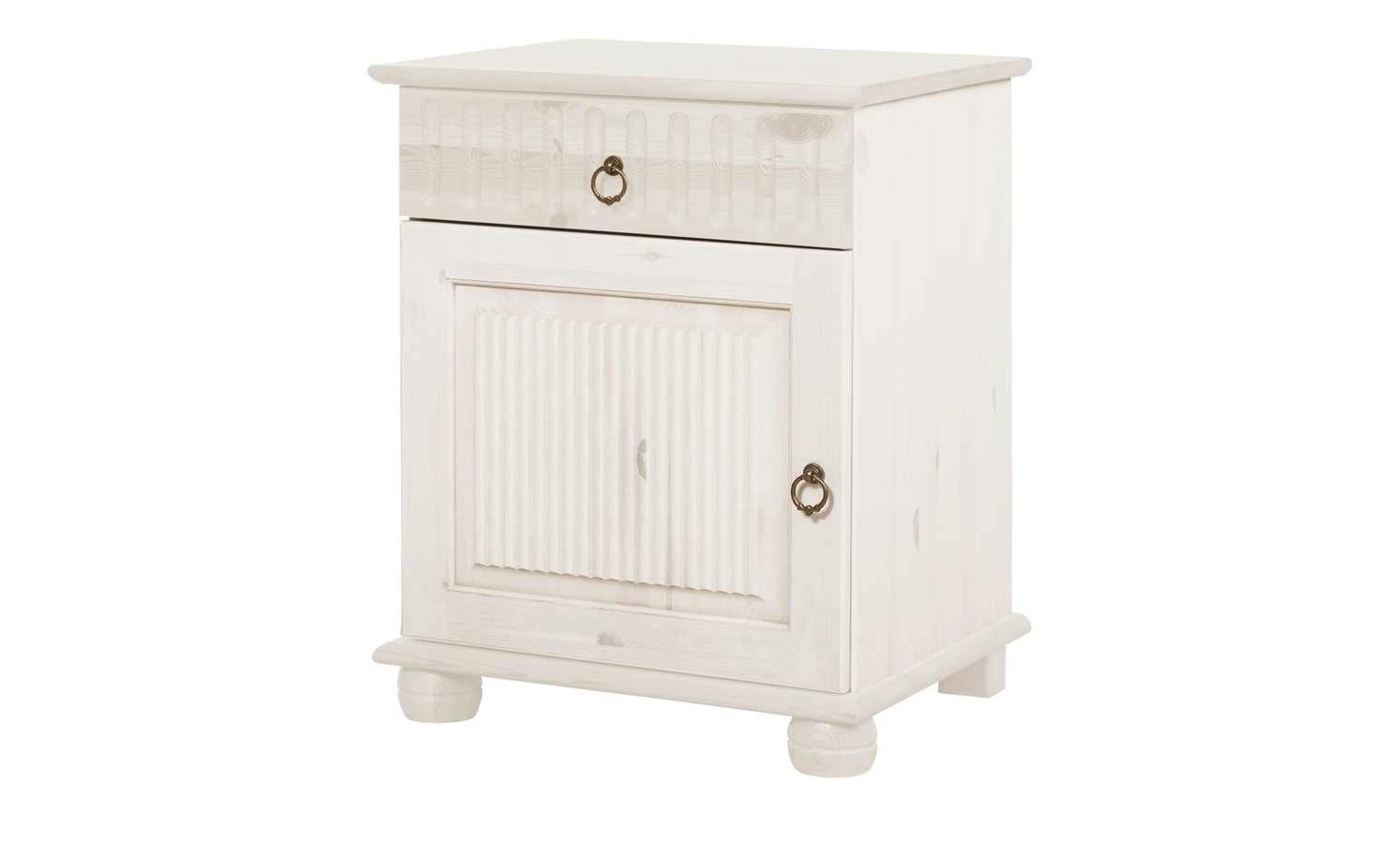 Diese optisch ansprechende Nachtkommode ist nicht nur praktisch, sondern bereichert Ihr Schlafzimmer auch dekorativ. Durch das rustikale Landhaus-Design und die Farbgestaltung passt der Nachtschrank ideal zum gleichnamigen Bettgestell der Serie Bornholm. Die Nachkommode besteht aus massivem Kiefernholz – die Oberfläche ist gewachst. Im Inneren bietet die praktische Nachtkommode ausreichend Platz für alles, was Sie neben Ihrem Bett aufbewahren möchten. Oberhalb des geräumigen Faches mit Drehtür befindet sich eine Schublade. Die Zug-Griffe in Ringform aus Metall sind im Used-Look gehalten und sorgen neben ihrer Funktion auch für optische Highlights.