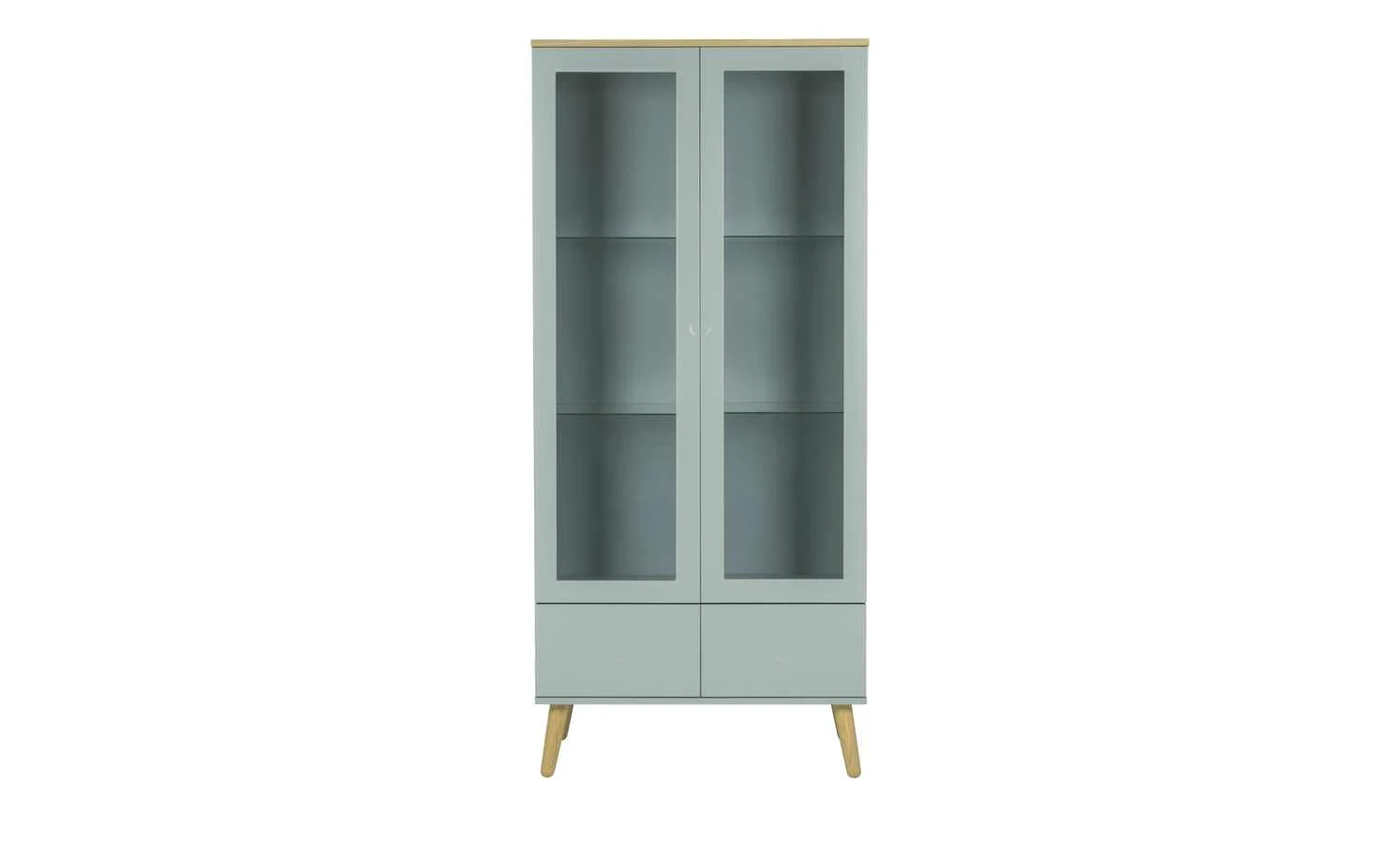 Die Standvitrine Scan hat einen angesagten skandinavischen Look. Damit passt sie wunderbar zu den anderen Modellen der Serie Scan. Der salbeigrüne Farbton wird durch Akzente in Eiche Natur abgesetzt. Die stabilen schlanken Füße sind aus massiver Eiche. Die Abdeckplatte ist mit Eichenholz furniert. Beide Vitrinentüren sind mit Klarglas abgesetzt. So erhalten Sie einen freien Blick in die sechs Vitrinenfächer und deren Inhalt. Zusätzlich verfügt Scan über zwei Schubkästen. Dank der sogenannten Push-to-Open-Funktion konnte auf störende Griffe verzichtet werden.