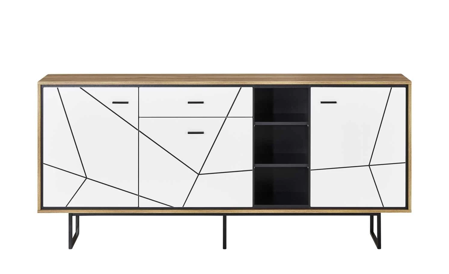 Eine besondere Optik und viel Stauraum vereinen sich beim Sideboard Arezzo. Während der Korpus in Cantania Eiche (Nachbildung) gehalten ist, fällt die Front sofort ins Auge. Die Front ist hochglänzend weiß, wird aber von matten schwarzen Fugen unterbrochen. Das Ergebnis: viele geometrische Formen. Ein weiterer Eyecatcher sind die schwarzen Nischen. Gleich drei Stück sind übereinander angeordnet. Darüber hinaus gibt es drei Türen und eine Schublade. Die Türen schließen geräuscharm. Die Schublade ist mit einem Vollauszug ausgestattet.