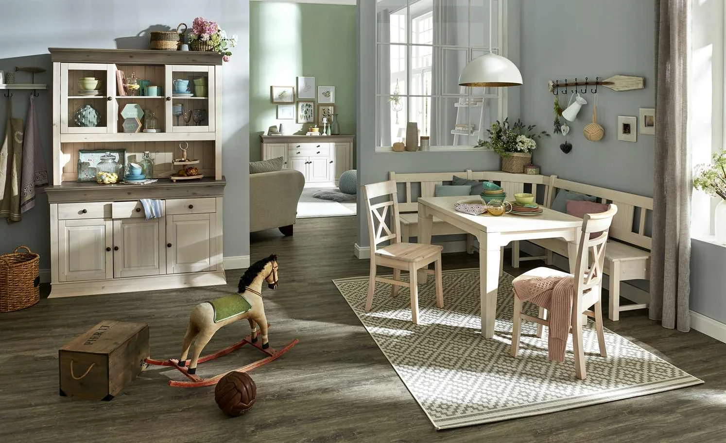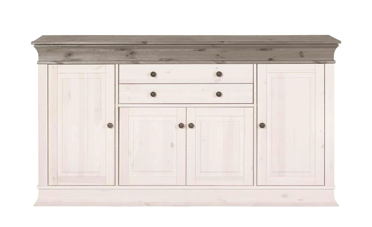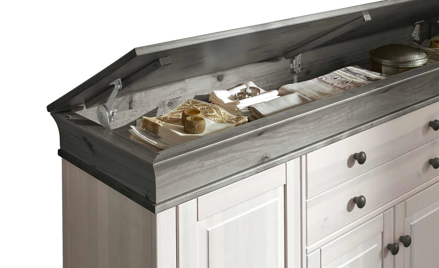 Das Sideboard Bornholm gibt Ihrem Wohn- oder Esszimmer ein nostalgisches Landhaus-Ambiente. Die Kommode aus massiver, weiß gewachster Kiefer wird durch lavafarbene Absetzungen akzentuiert. Besonders schön anzusehen sind die sogenannten Kassettenfüllungen an den Türen, also die eingefrästen Muster. Das Sideboard bietet hinter zwei Schubkästen und vier Holztüren genug Platz, um Ihr Geschirr oder Ihre Tischwäsche zu verwahren. Ein ganz besonderes Highlight ist die aufklappbare Oberplatte, unter der sich ein weiterer Stauraum versteckt.