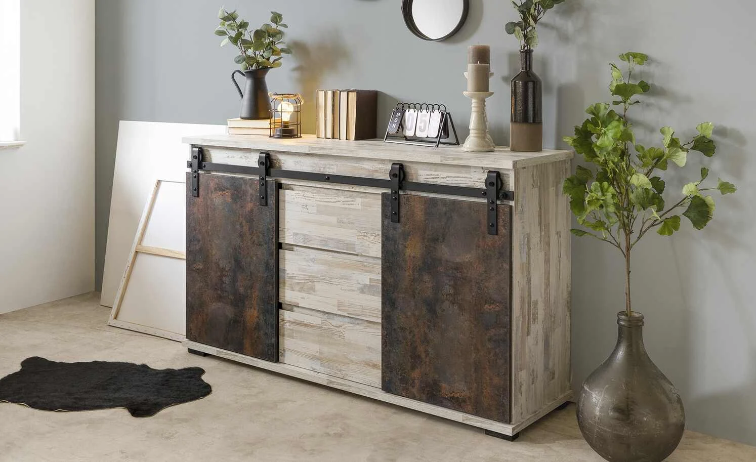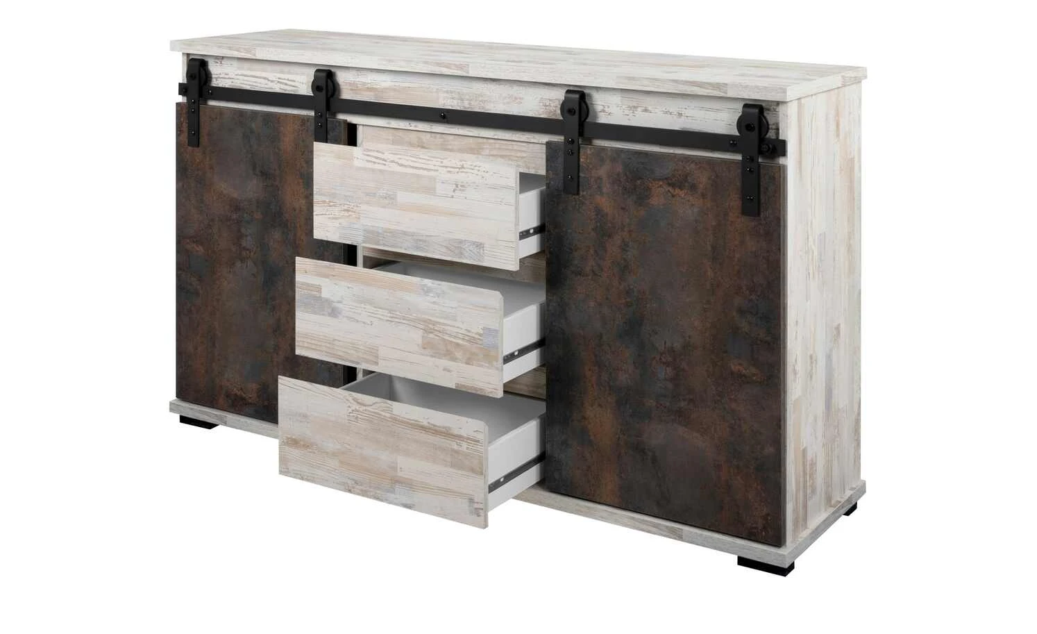 Mit dem Sideboard Seviso entdecken Sie den Industrial-Style von einer ganz neuen Seite. Die hellen, pflegeleichten Oberflächen in weißer Kiefer (Nachbildung) dominieren das 140 Zentimeter lange Sideboard. Eine schwarze Metallschiene ist Kontrast und Türhalterung zugleich. Hier sind die beiden beweglichen Türfronten in Rost-Optik befestigt. Der großzügige Stauraum ist je nach Türposition blickdicht oder offen. Nutzen Sie die insgesamt sechs Fächer und drei Schubfächer für alle Ihre Sachen. Übrigens: Besonders stilsicher können Sie das Sideboard mit weiteren Möbeln der Serie Seviso kombinieren.