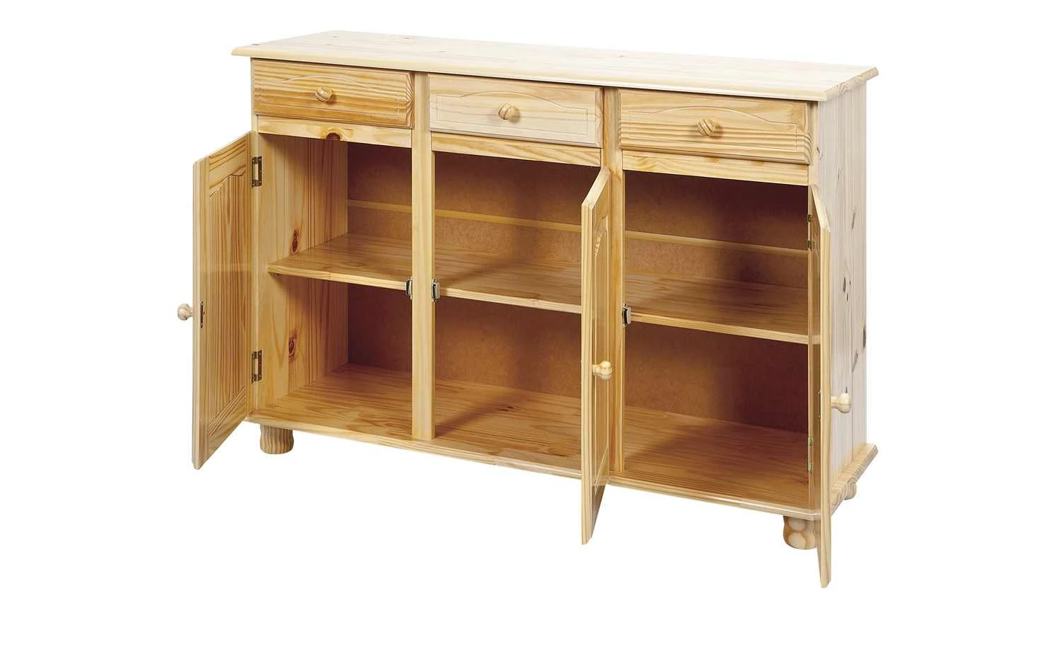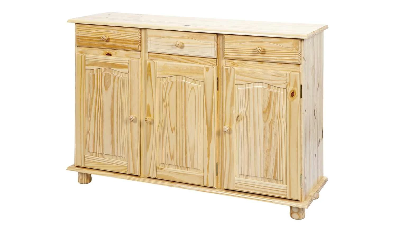 Mit dem Sideboard Tivoli bringen Sie Stauraum und Landhauscharme in Wohn- und Essbereich. Das Sideboard unterteilt sich in drei Schubfächer und sechs geräumige Fächer mit Türen davor. Das ergibt viel Platz für all die Dinge, die Sie unterbringen möchten. Tivoli ist aus massiver Kiefer gefertigt. Das Holz zeichnet sich durch seine Stabilität und Langlebigkeit aus. Um das Holz zu schützen, ist es mit einem Lack behandelt worden. Die typische Kiefernholzmaserung ist aber erhalten geblieben. Dieser Naturlook harmoniert mit dem Landhausstil, in dem das Sideboard designt ist.
