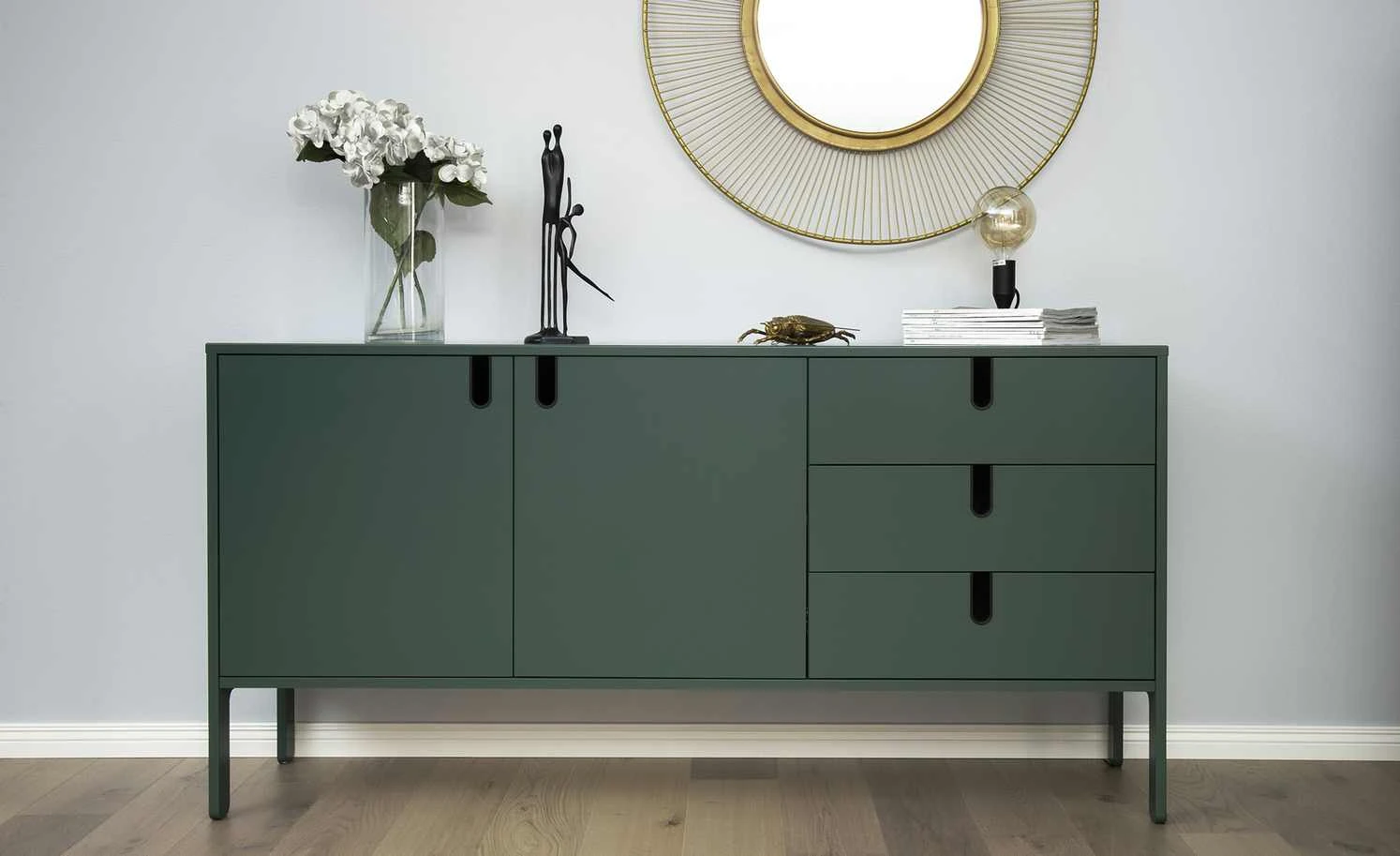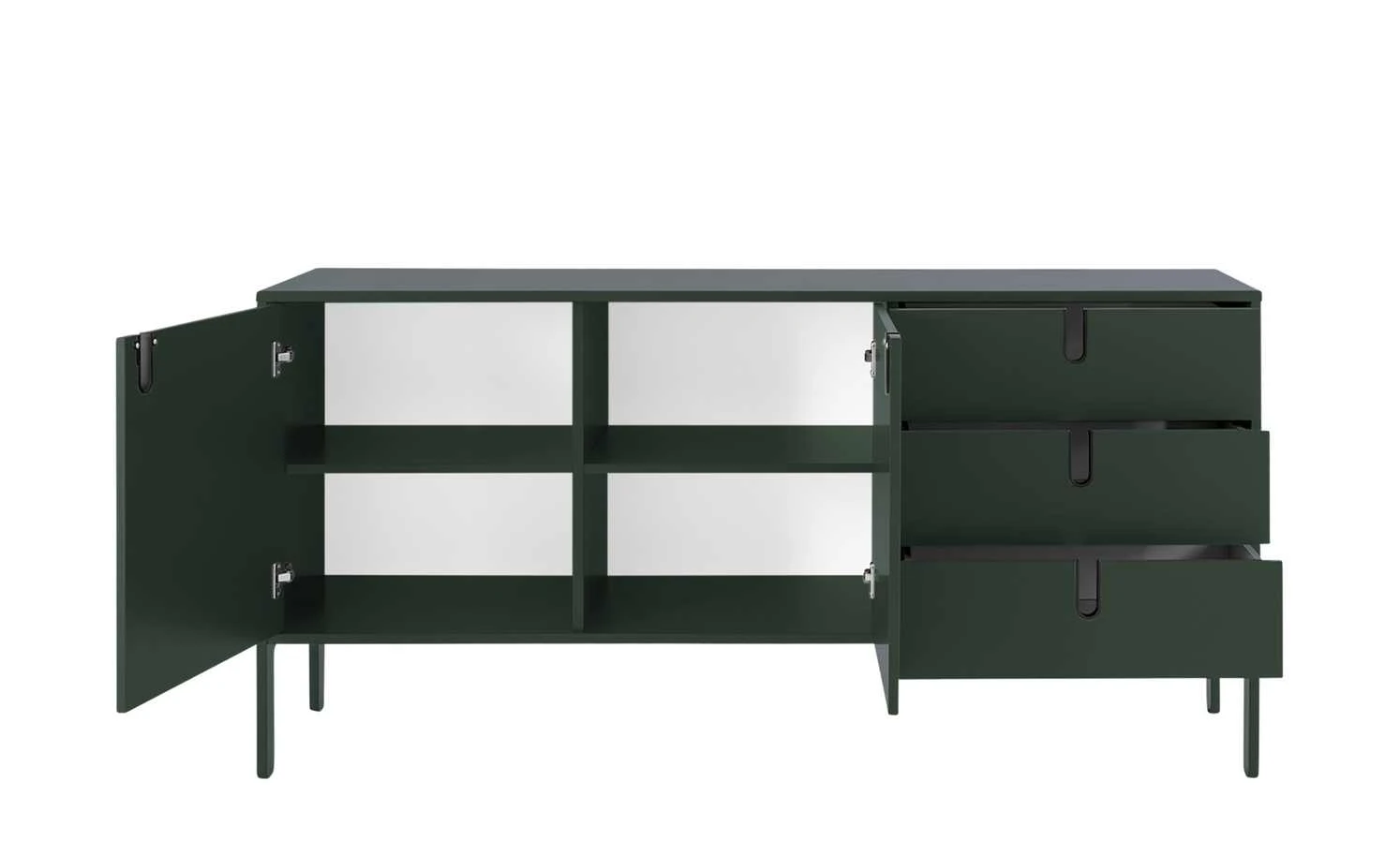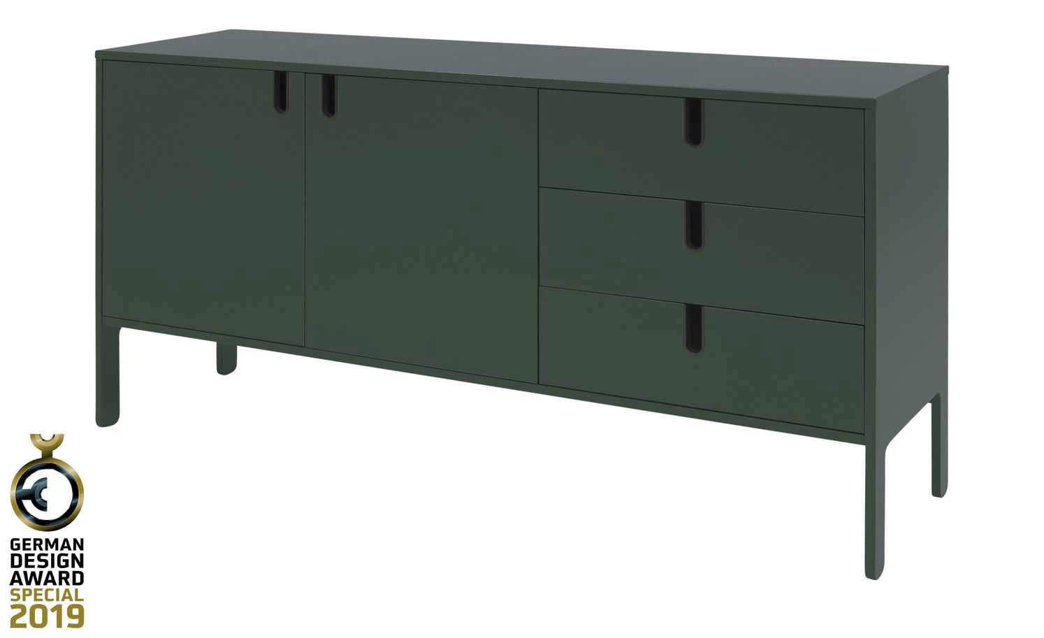 Reduziert und stylisch zugleich, so wirkt das Sideboard Uno. Das Zusammenspiel von klaren Linien und moderner Farbe ist mit dem German Design Award Special 2019 ausgezeichnet worden. Unos Oberflächen sind matt lackiert, was der Farbe eine ganz besondere Note gibt. Uno hat zwei Drehtüren hinter denen sich vier Fächer befinden. Drei Schubfächer bieten zusätzlichen Stauraum. Alle Türen lassen sich dank Soft-Close-Funktion nahezu lautlos schließen.