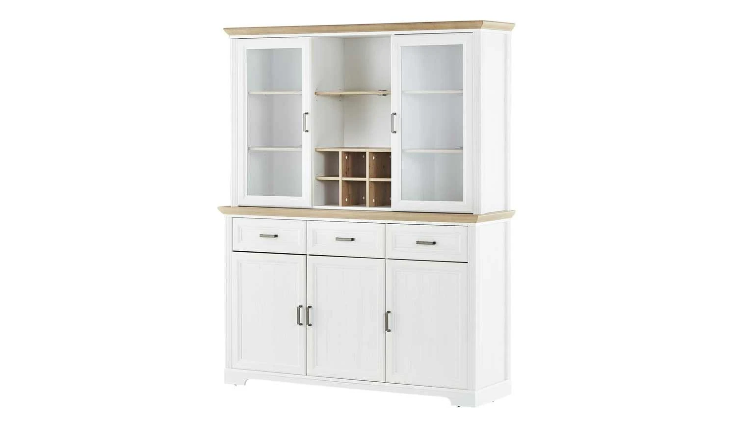 Das Sideboard Varese kann mit dem gleichnamigen Buffetaufsatz ergänzt werden. Optional können Sie es natürlich auch alleinstehen nutzen. Varese ist mit drei Schubladen und drei Türen ausgestattet. Sie verfügen über eine Soft-Close-Ausstattung, die für ein leises Schließen sorgt. Im Sideboard ist genügend Platz für Geschirr, Besteck und viele andere Dinge. Front und Korpus sind hochwertig gearbeitet und im Landhausstil in Pinie hell (Nachbildung) designt. Die Abdeckplatte setzt sich in Asteiche (Nachbildung) ab.