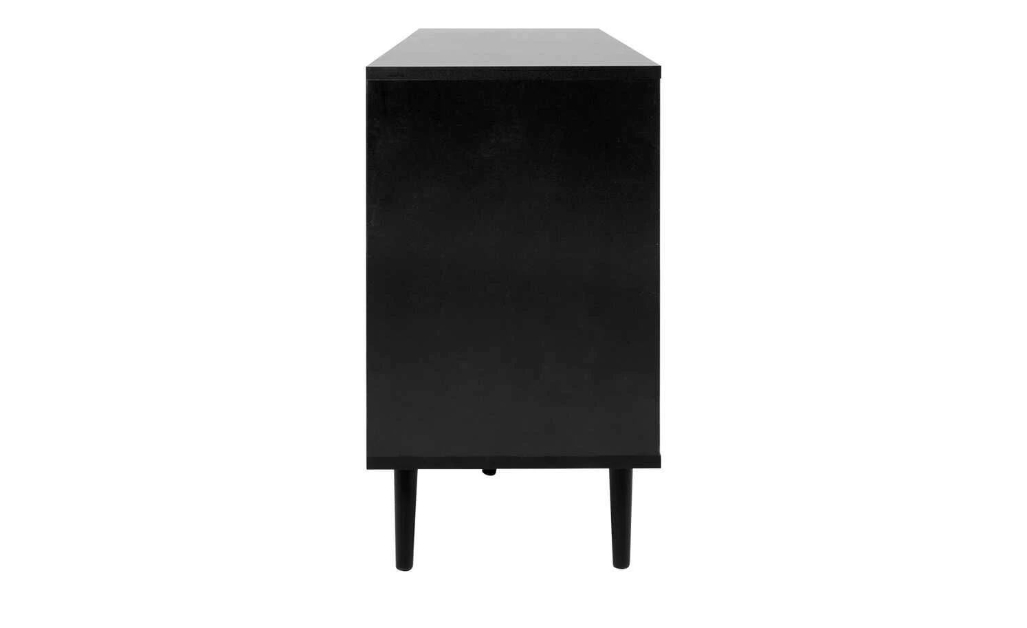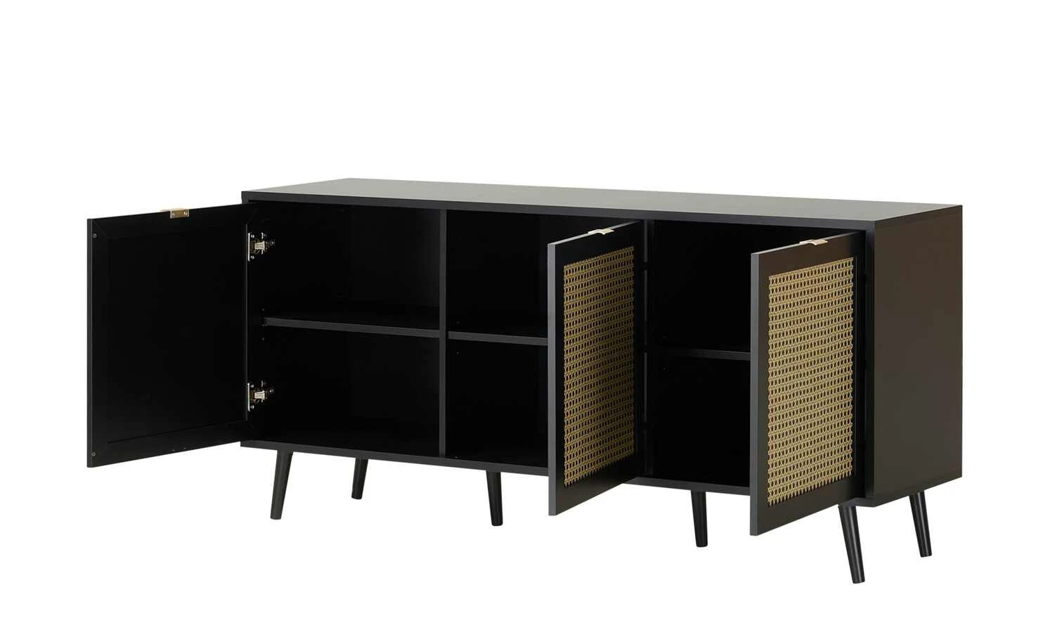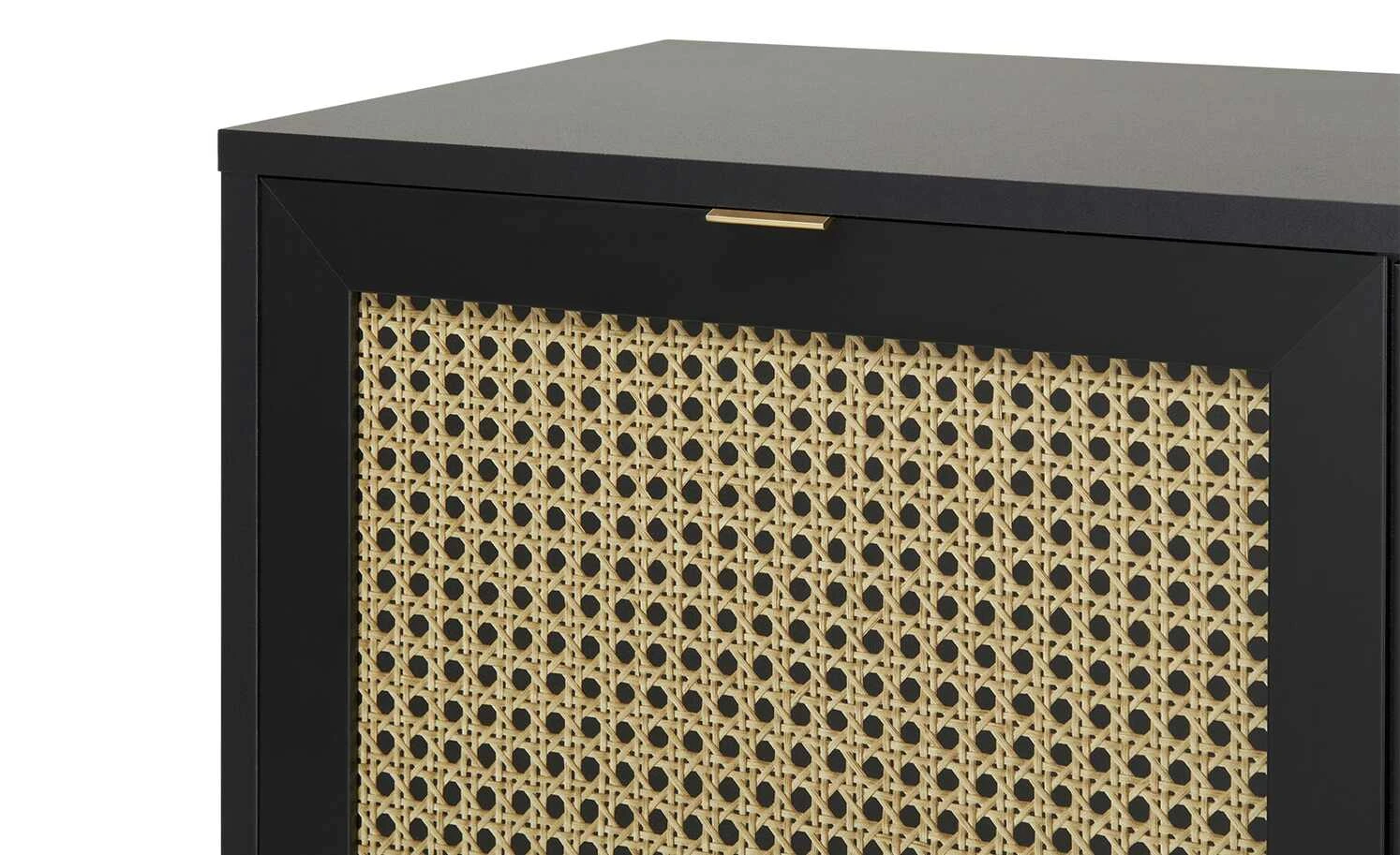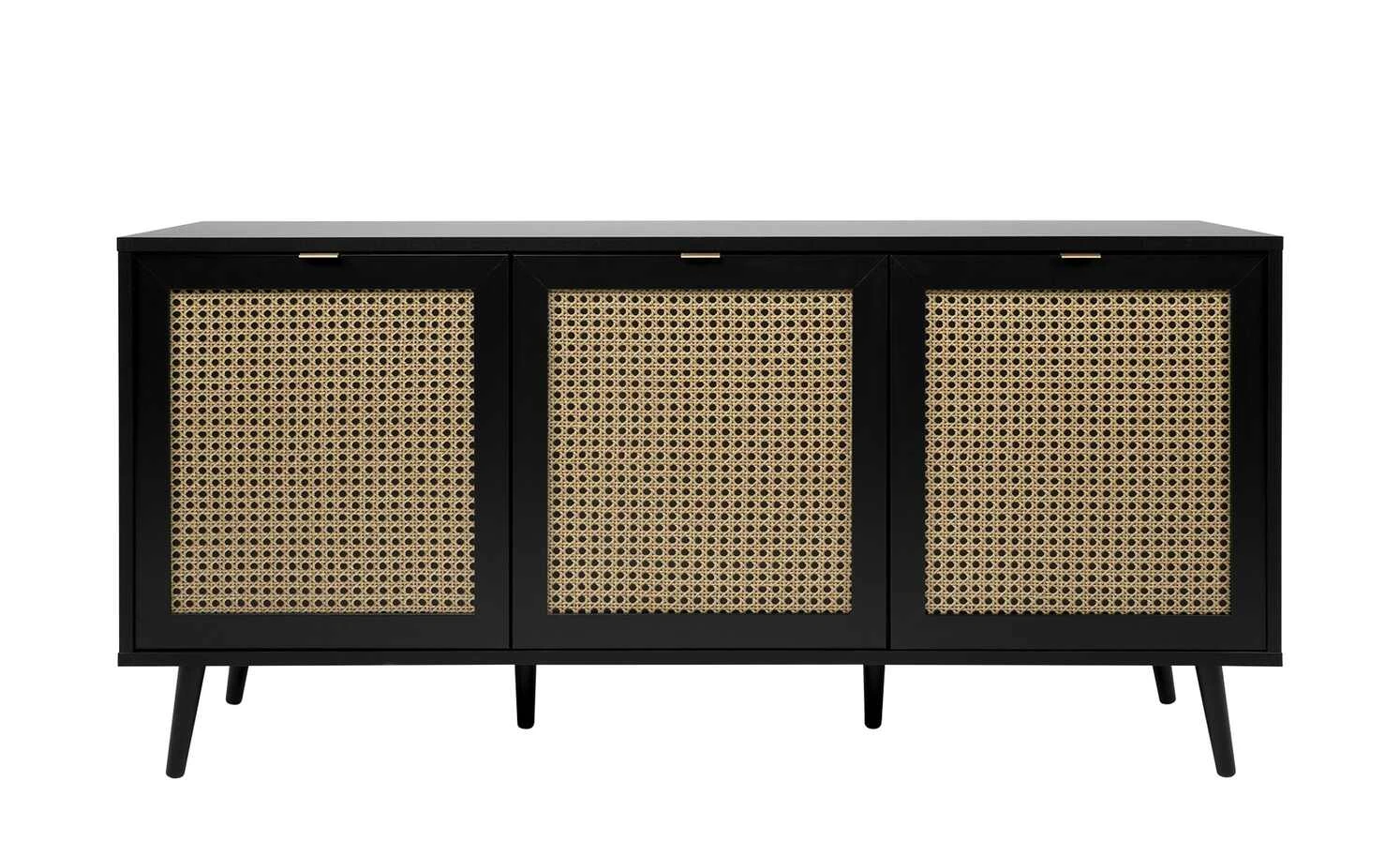 Zeitloses Schwarz in Kombination mit hellen Fronten in Wiener-Geflecht-Optik: Das ist das Sideboard Vienna. Zusammen mit den schräg zulaufenden Buchenfüßen in schwarz erzeugt sie ein edles Kaffeehaus-Flair. Hinter den drei Türen befinden sich sechs Fächer, in denen Sie allerlei Dinge unterbringen können. Auch die 150 x 40 Zentimeter große Oberfläche bietet viel Platz für Dekoobjekte oder Tischlampen.