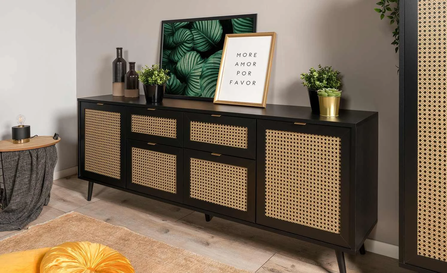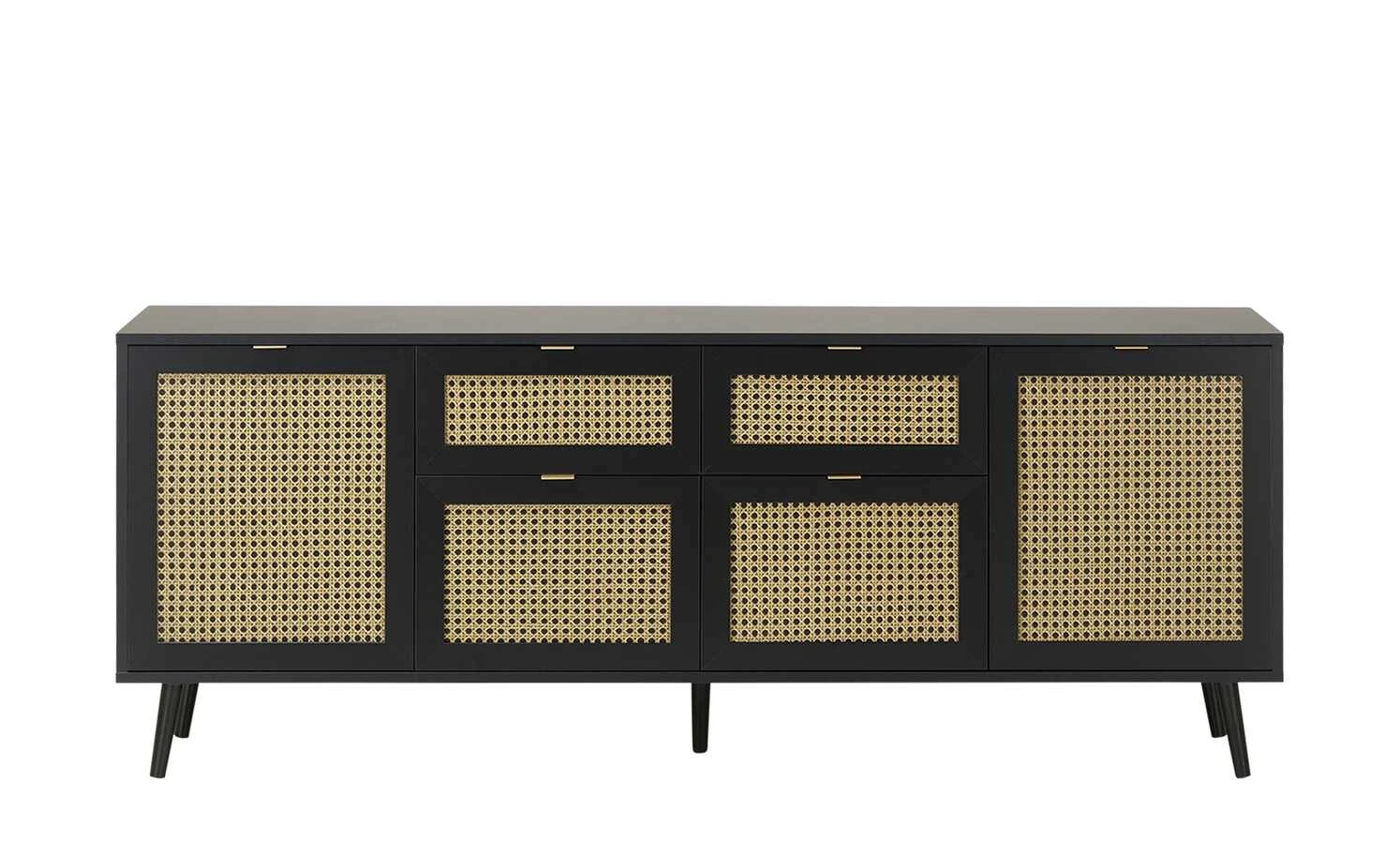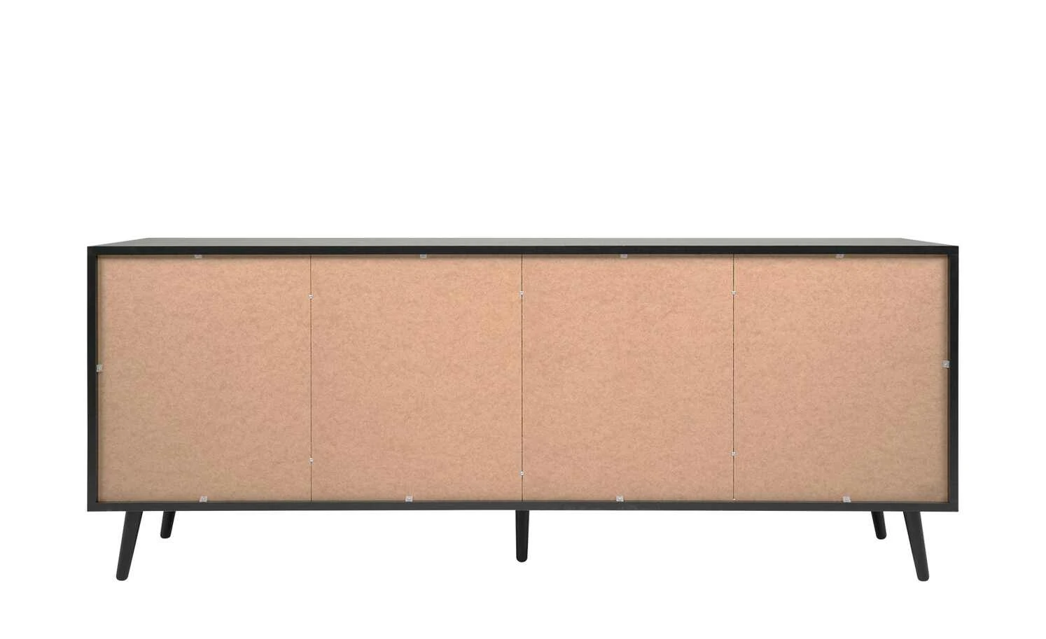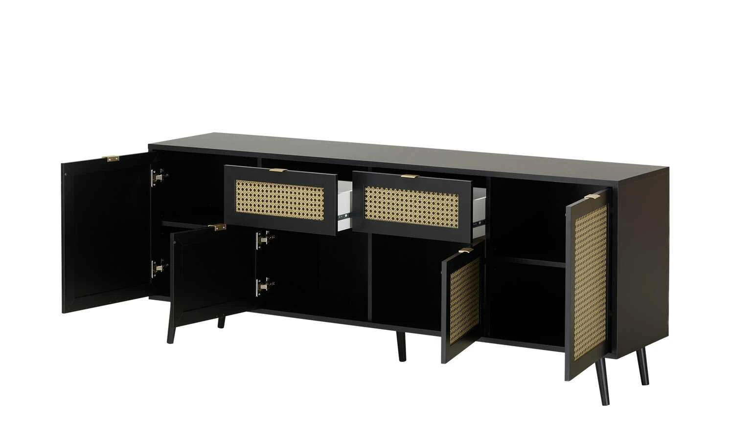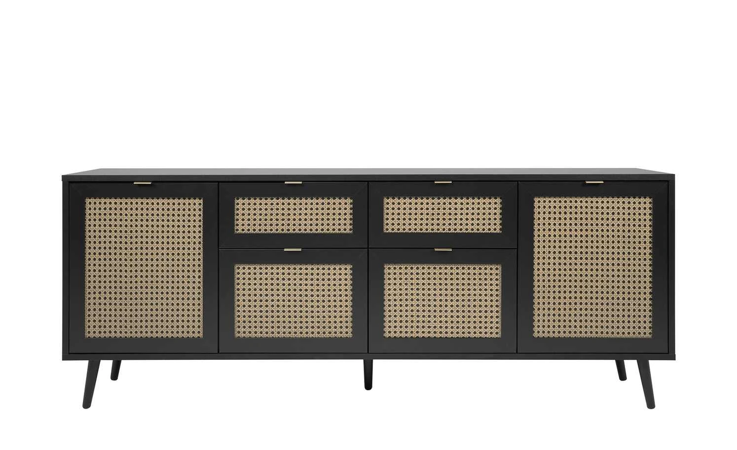Zeitloses Schwarz in Kombination mit hellen Fronten in Wiener-Geflecht-Optik: Das ist das Sideboard Vienna. Zusammen mit den schräg zulaufenden Buchenfüßen in schwarz erzeugt sie ein edles Kaffeehaus-Flair. Hinter den vier Türen und in den zwei mittigen Schubfächern befindet sich großzügiger Stauraum. Auch die 180 x 40 Zentimeter große Oberfläche bietet viel Platz für Dekoobjekte oder Tischlampen.