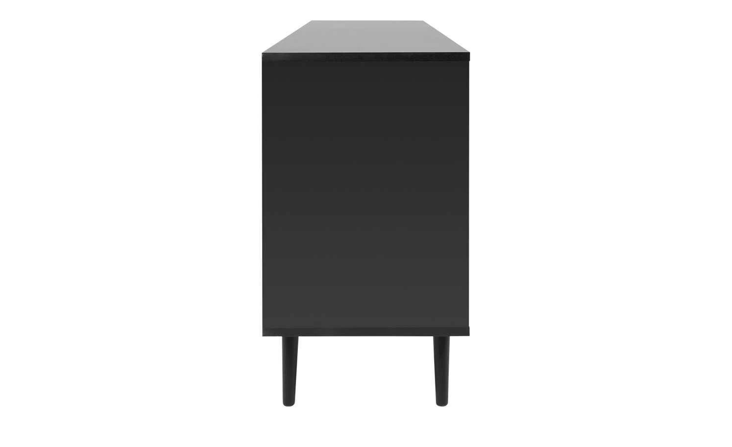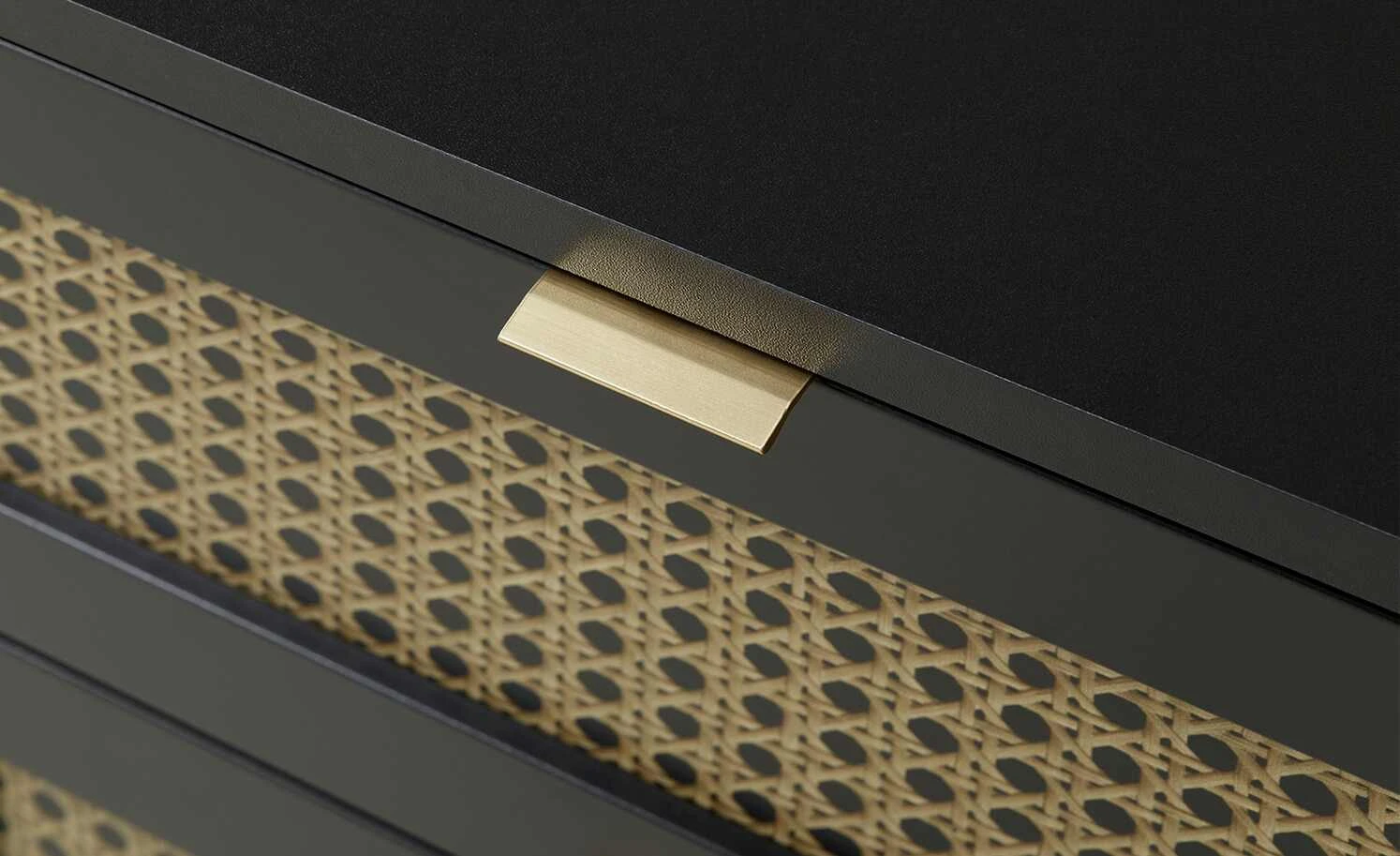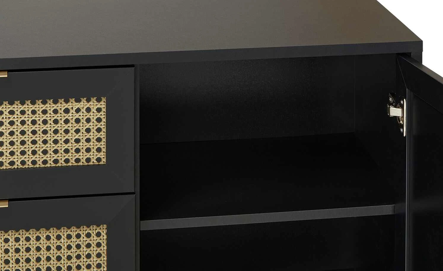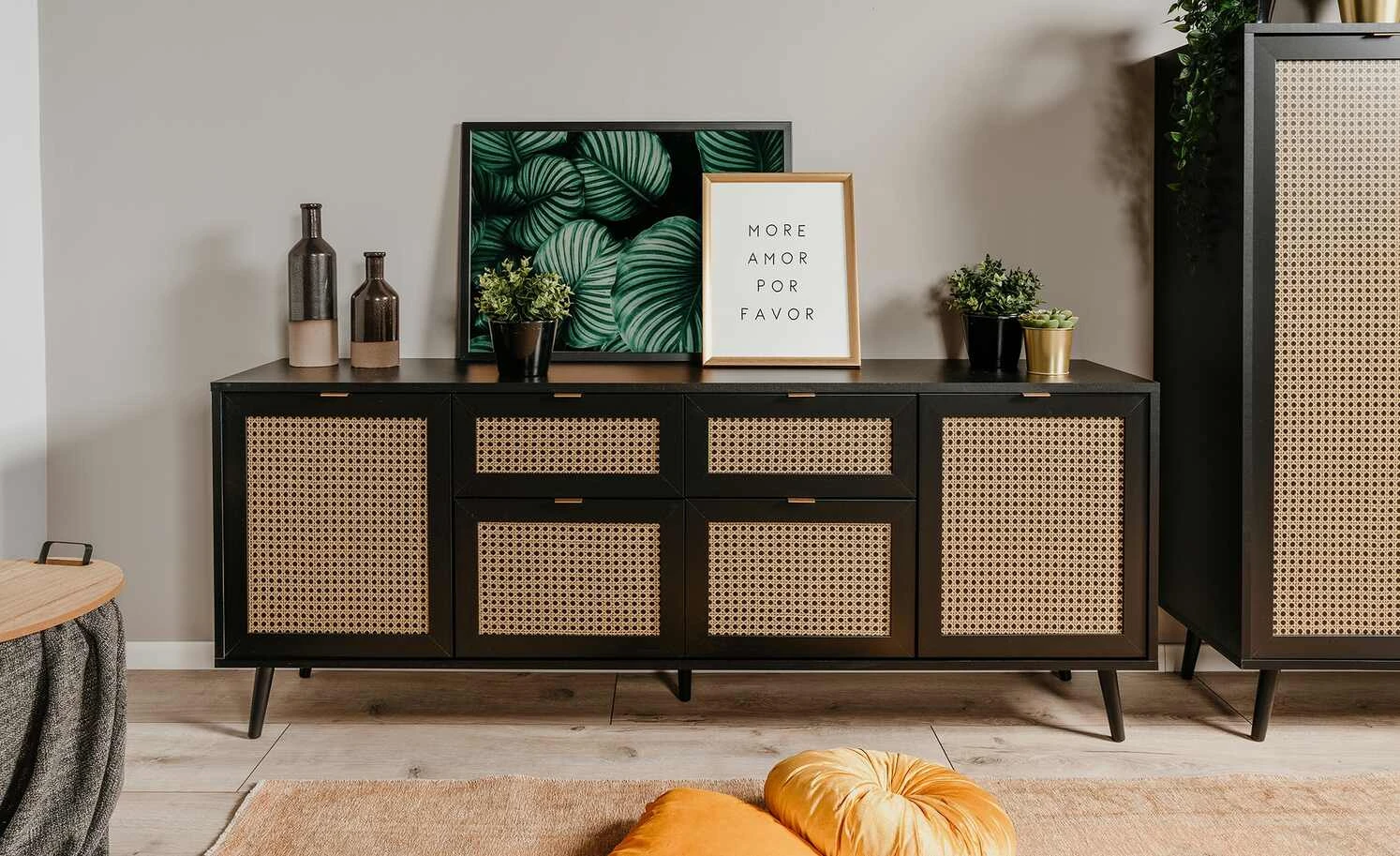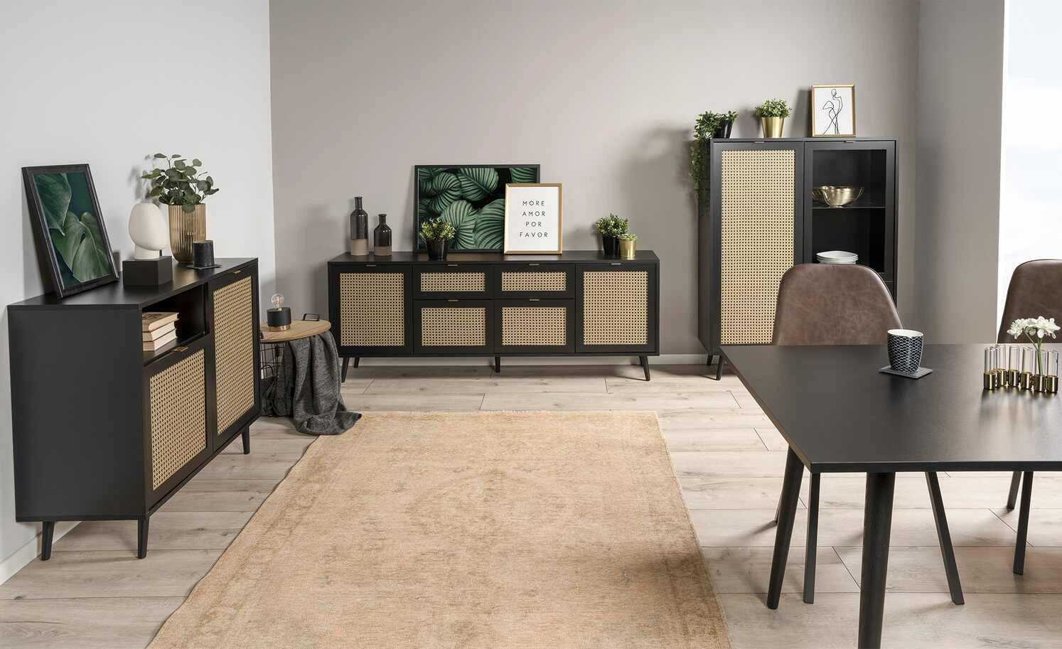 Zeitloses Schwarz in Kombination mit hellen Fronten in Wiener-Geflecht-Optik: Das ist das Sideboard Vienna. Zusammen mit den schräg zulaufenden Buchenfüßen in schwarz erzeugt sie ein edles Kaffeehaus-Flair. Hinter den vier Türen und in den zwei mittigen Schubfächern befindet sich großzügiger Stauraum. Auch die 180 x 40 Zentimeter große Oberfläche bietet viel Platz für Dekoobjekte oder Tischlampen.