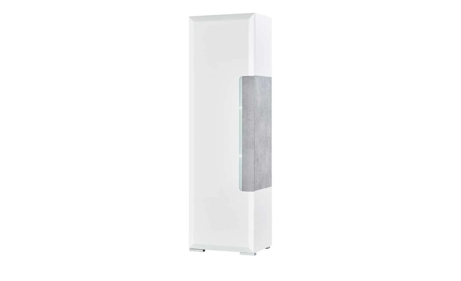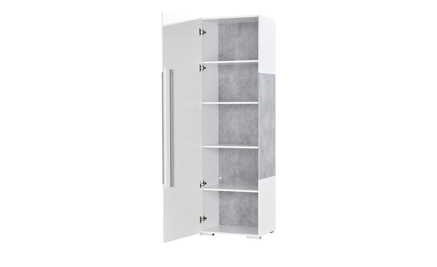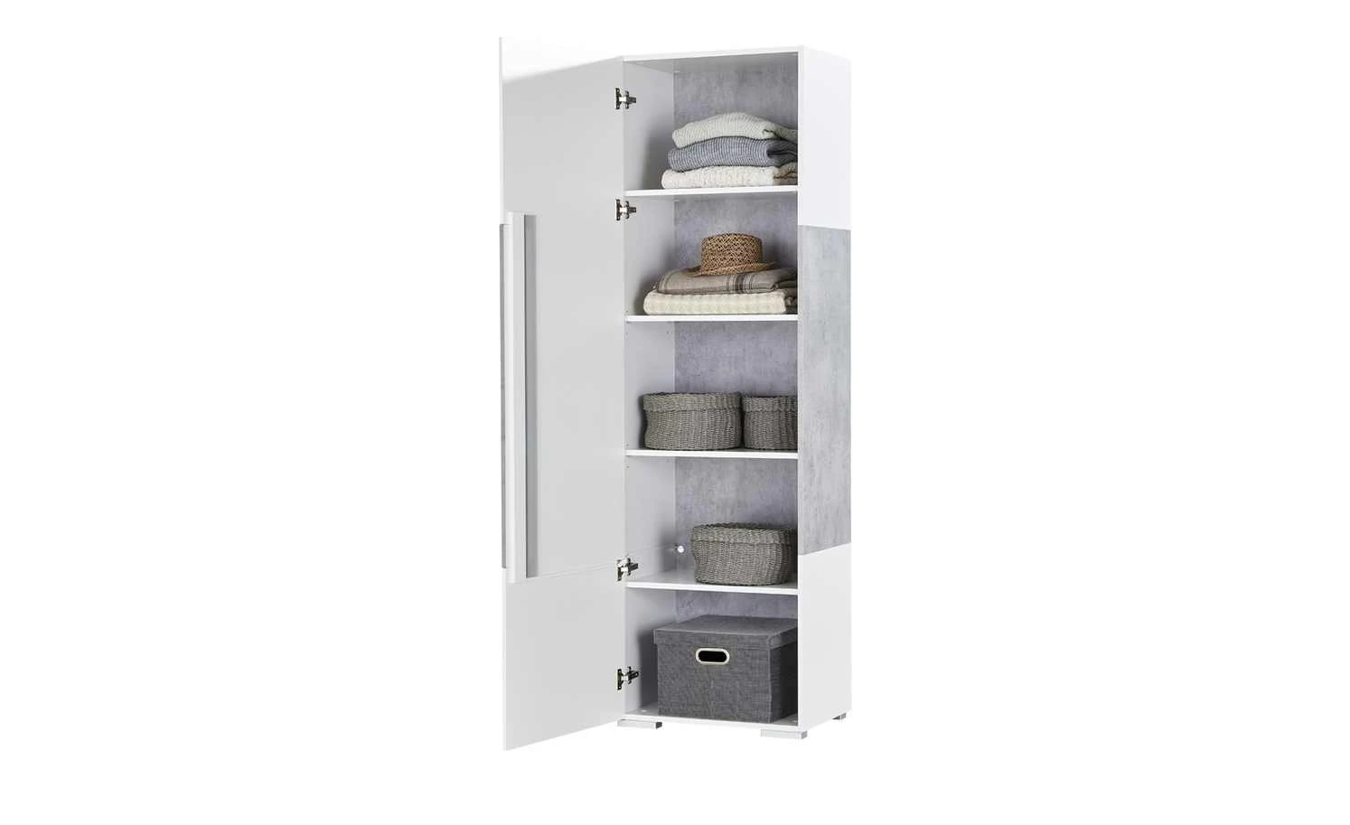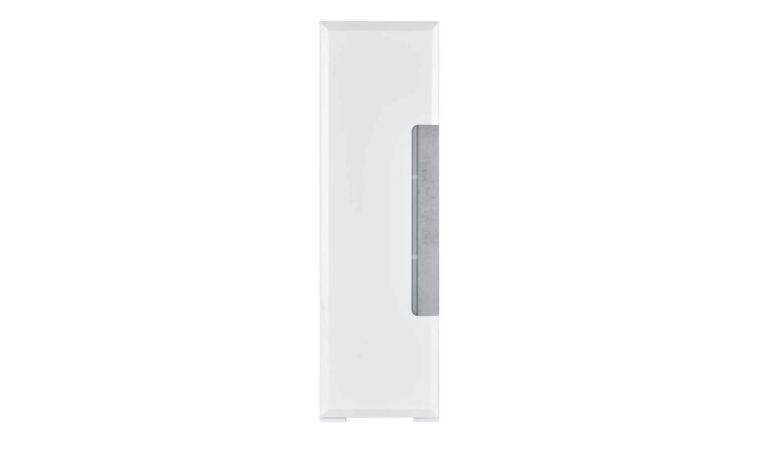 Der Name ist Programm: Das Stauraumelement Puro bietet Ihnen im Inneren viel Platz. Gleich fünf geräumige Fächer sind hinter der Tür zu finden. Doch auch optisch macht Puro etwas her. Die Absetzung in Beton (Nachbildung) zieht alle Blicke auf sich. Der Rest des Schrankes ist in Weiß bzw. Alpinweiß gehalten. Während die Front hochglänzend ist, wurde für den Korpus ein mattes Finish gewählt. Seitlich von der Beton-Optik befindet sich eine LED-Lichtleiste. Sie inszeniert das Stauraumelement auch bei Dunkelheit.