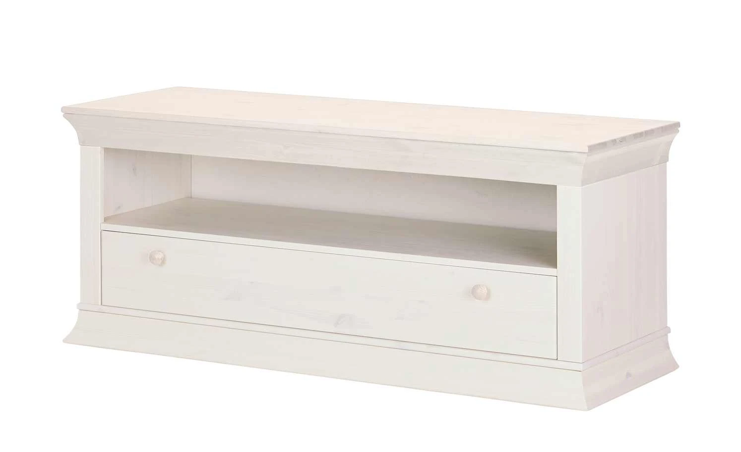 Geben Sie ihrem Fernseher ein passendes Plätzchen, zum Beispiel auf dem TV-Board Bornholm. Wie alle Möbel der Serie, fällt auch dieses Modell durch seinen Landhausstil auf. Korpus und Front sind weiß gewachst, eine leichte Holzmaserung schimmert durch. Diese kommt von dem Kiefernholz aus dem Bornholm gefertigt wurde. Bornholm hat ein offenes Fach und ein Fach mit Klappe.