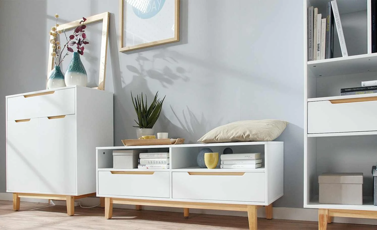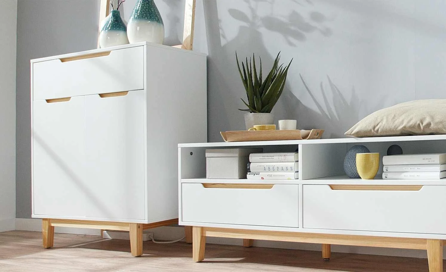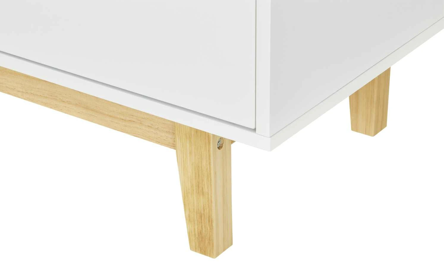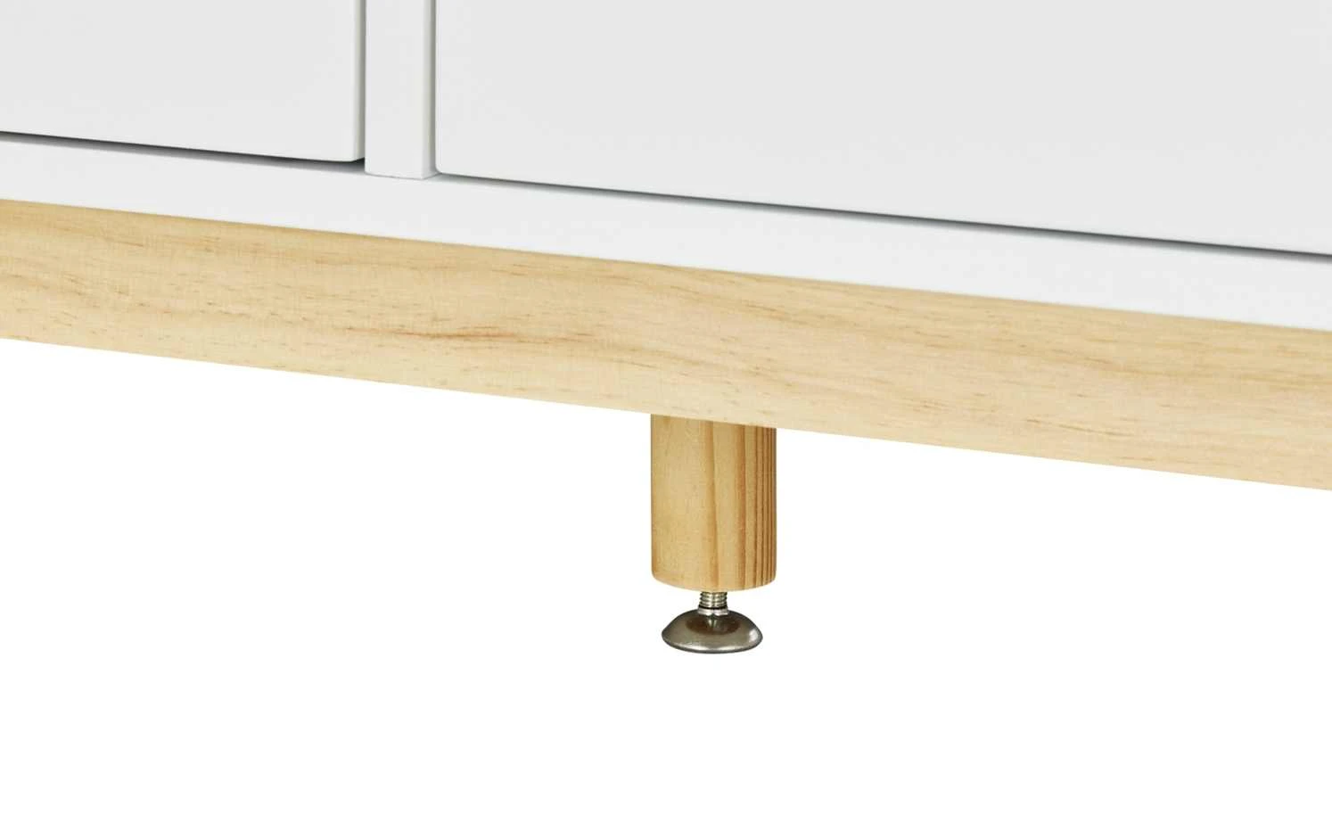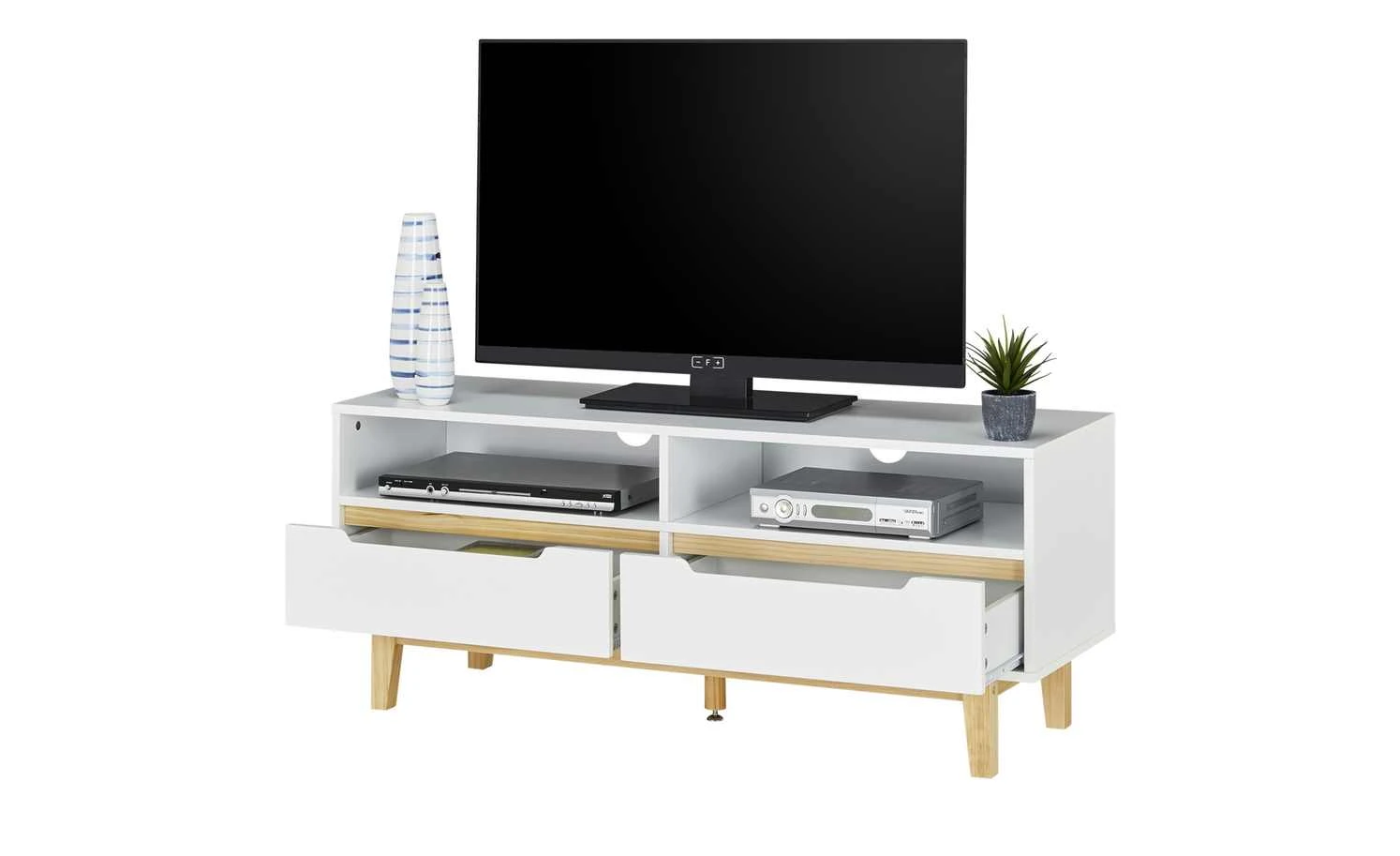 Das TV-Lowboard Brescia vereint praktischen Nutzen und skandinavisches Design. Front und Korpus sind in schönem Weiß lackiert. Für Akzente sorgen die Absetzungen aus massiver Kiefer Natur. Sie befinden sich an der Front und auch das Gestell greift den Holzlook auf. Damit die Kiefer gut geschützt ist, wurde sie mit einem speziellen Lack behandelt. Dank der neutralen Lackfarbe, ist die natürliche Holzmaserung dabei aber erhalten geblieben. Brescia verfügt über eine 120 Zenitmeter breite Stellfläche für Ihren Fernseher. Direkt darunter sind zwei Gerätefächer mit Kabeldurchlass zu finden. Stauraum steht Ihnen in zwei Schubladen zur Verfügung.