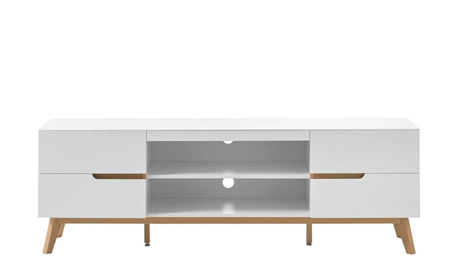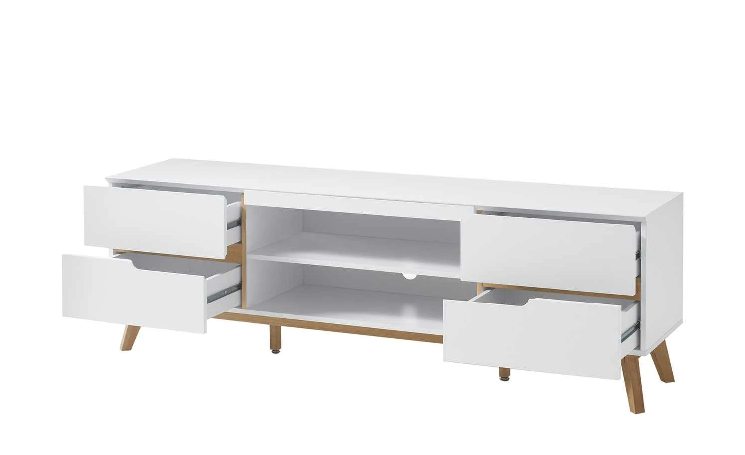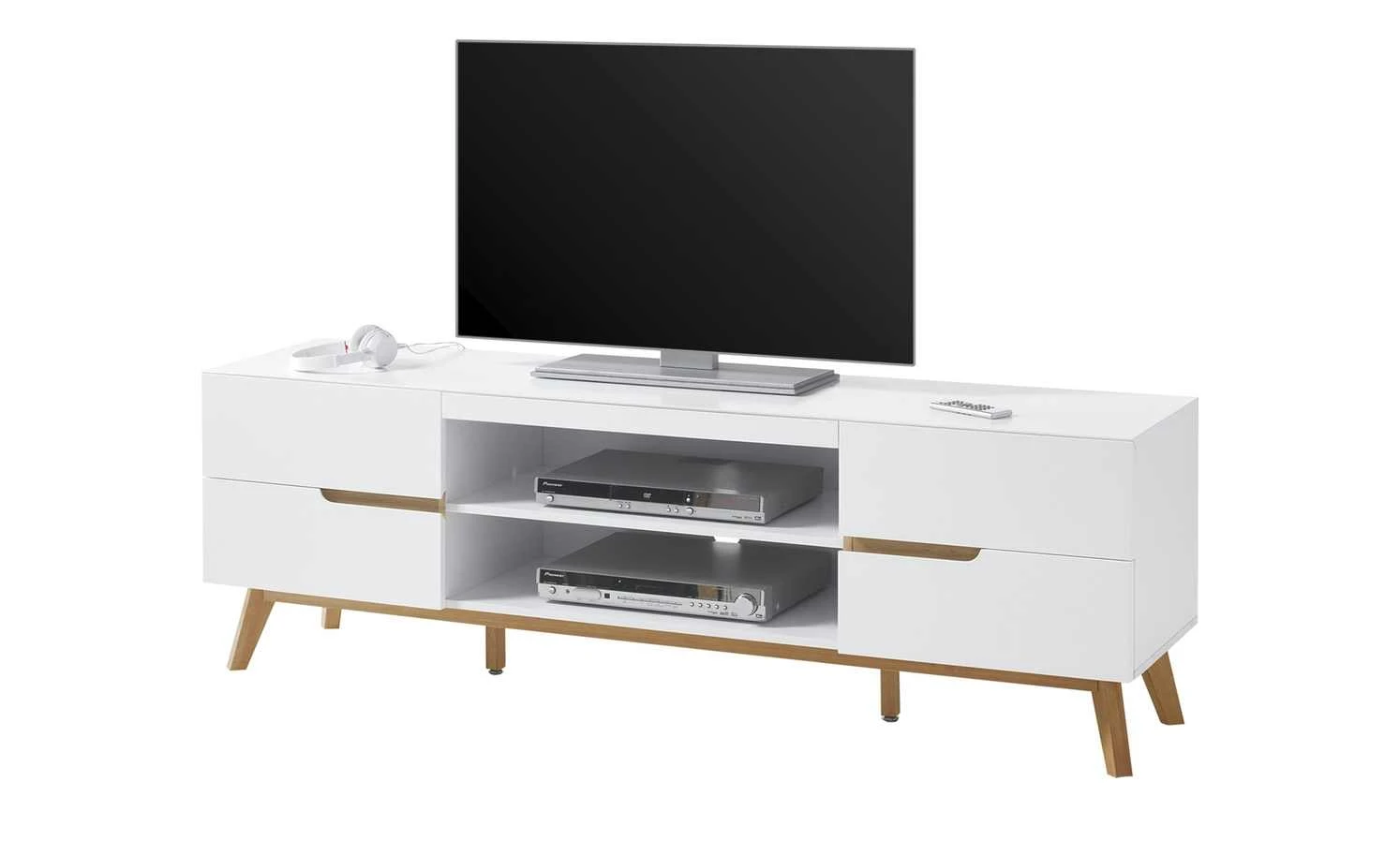 Die Serie Casoria sorgt für skandinavischen Charme in Ihrem Wohnzimmer. Dazu gehört auch dieses TV-Lowboard. Korpus und Front sind weiß lackiert. Das Gestell aus massiver Eiche und die Frontabsetzungen aus Asteichen-Furnier setzen natürliche Akzente. Die Stellfläche für Ihren Fernseher ist so breit, dass darauf TV-Geräte bis zu einer Größe von 70 Zoll stehen können. Mittig sind zwei Gerätefächer angeordnet. Durch den Kabeldurchlass in der Fach-Rückwand wird lästiger Kabelsalat verhindert. Stauraum ist in vier Schubkästen vorhanden.
