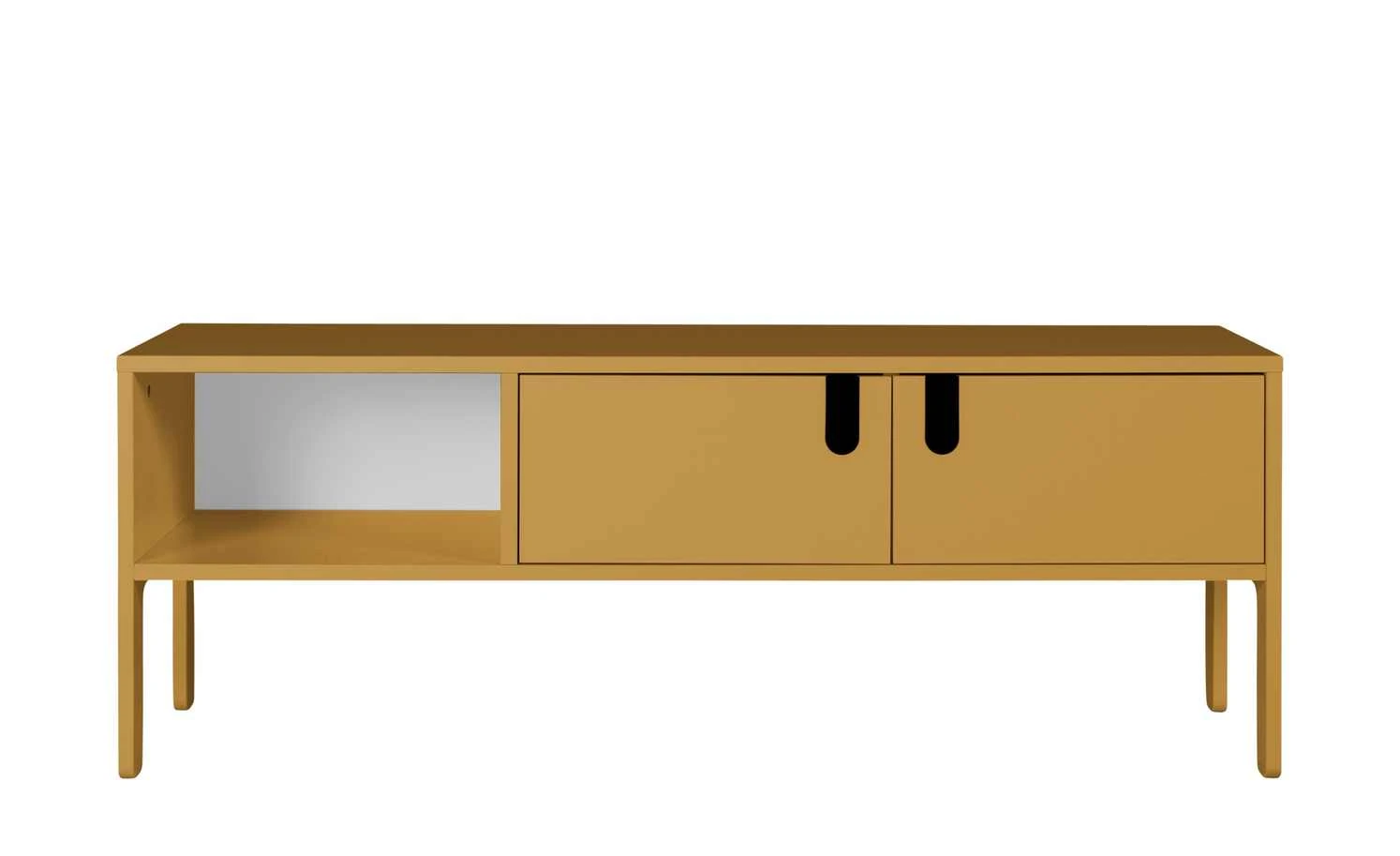Auf dem TV-Lowboard Uno kommt Ihr Fernseher wunderbar zur Geltung. Das stylische Lowboard ist als Teil der Serie Uno mit dem German Design Award Special 2019 ausgezeichnet worden. Der Mix aus einer zurückhaltenden Linienführung und der modernen Farbe spricht für sich. Der senfgelbe Lack hat einen matten Look, was die Farbe edel akzentuiert. Die sichtbare Rückwand setzt sich in Weiß davon ab. Neben der breiten Stellfläche bietet Uno ein offenes Fach und Stauraum hinter zwei Türen. Die Rückwand ist mit einem Kabeldurchlass ausgestattet.