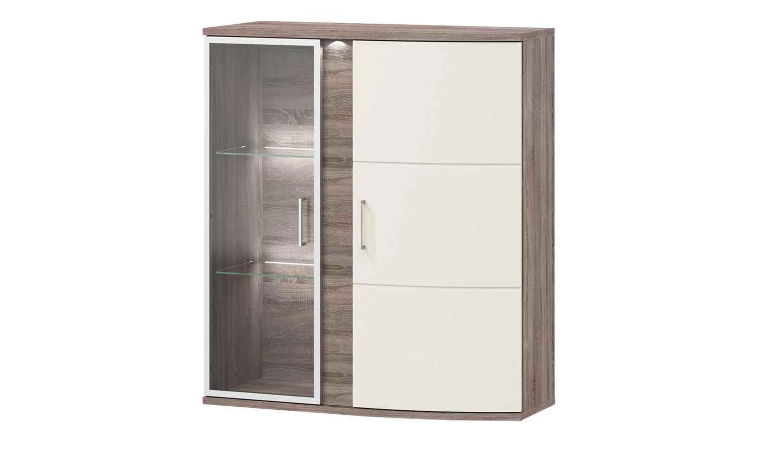 Die Hängevitrine Onyx von uno ist ein ergänzendes Element für die gleichnamige Serie. An der Wand hängend kann sie Side-, Lowboard und Co. wunderbar ergänzen. Onyx bietet Stauraum und drei geräumige Vitrinenfächer, die durch Glasböden unterteilt werden. Die Glastür wird von einem Alu-Rahmen umgeben. Der Korpus der Vitrine sorgt mit seinem Eichendekor (Nachbildung) für natürliches Flair. Dieser attraktive Holzlook wird an der geschroppten Frontabsetzung erneut aufgegriffen. Die zweite Tür sorgt für Kontraste: Sie ist in einem hochglänzenden Vanilleton (Creme) gehalten. Damit die Front noch besser in Szene gesetzt wird, ist eine LED-Spotbeleuchtung im Lieferumfang enthalten.