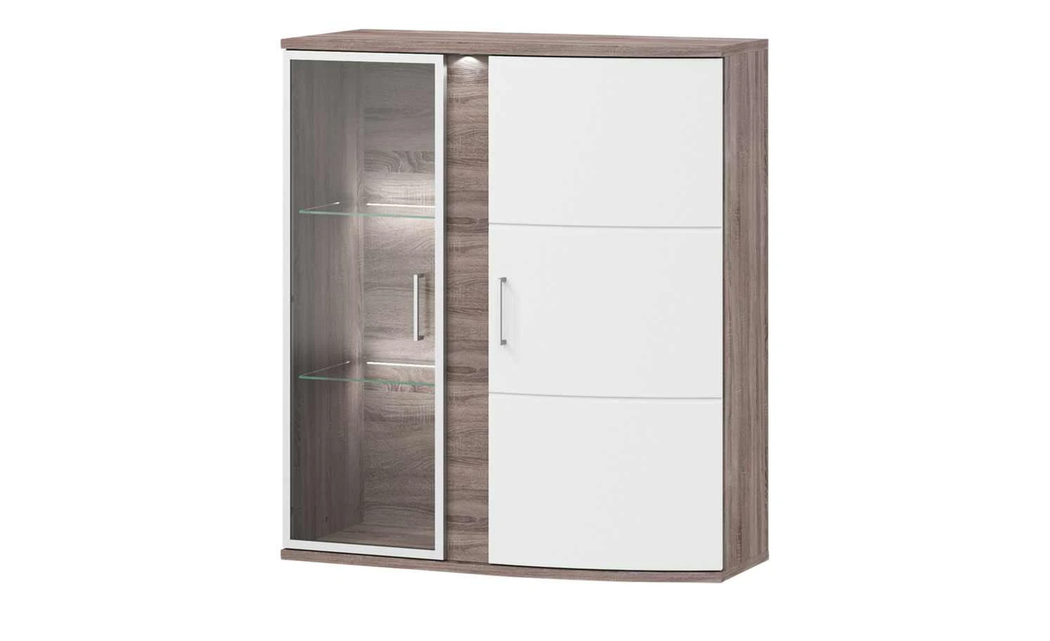 Die Hängevitrine Onyx von uno ist ein ergänzendes Element für die gleichnamige Serie. An der Wand hängend kann sie Side-, Lowboard und Co. wunderbar ergänzen. Onyx bietet Stauraum und drei geräumige Vitrinenfächer, die durch Glasböden unterteilt werden. Die Glastür wird von einem Alu-Rahmen umgeben. Der Korpus der Vitrine sorgt mit seinem Eichendekor (Nachbildung) für natürliches Flair. Dieser attraktive Holzlook wird an der geschroppten Frontabsetzung erneut aufgegriffen. Die zweite Tür sorgt für Kontraste: Sie ist in hochglänzendem Weiß gehalten. Damit die Front noch besser in Szene gesetzt wird, ist eine LED-Spotbeleuchtung im Lieferumfang enthalten.