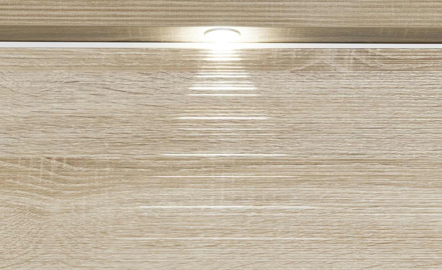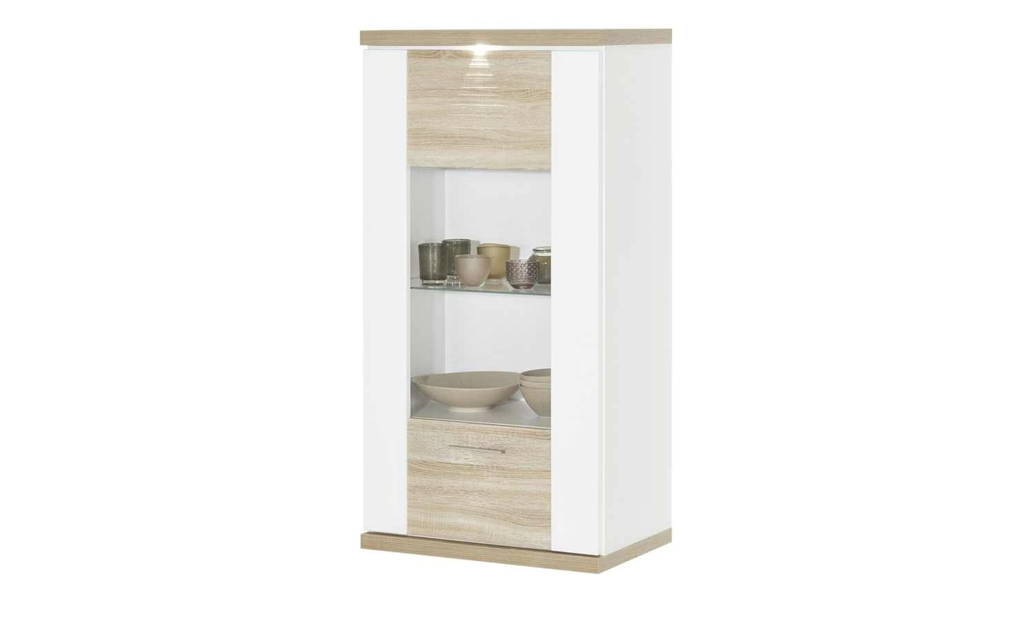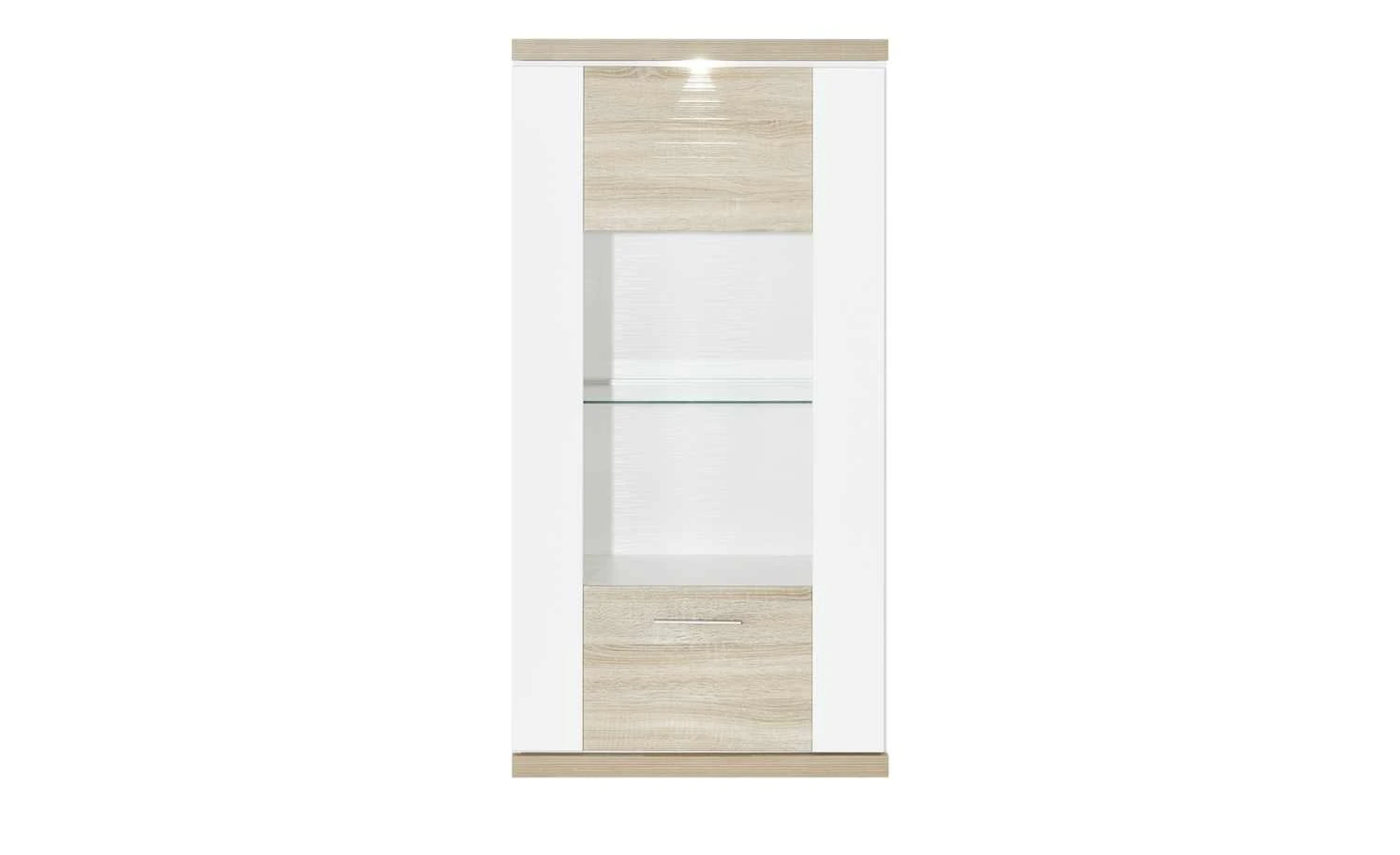 uno Hängevitrine Titan | Weiß / Eiche sägerau (Nachbildung) links Spotbeleuchtung