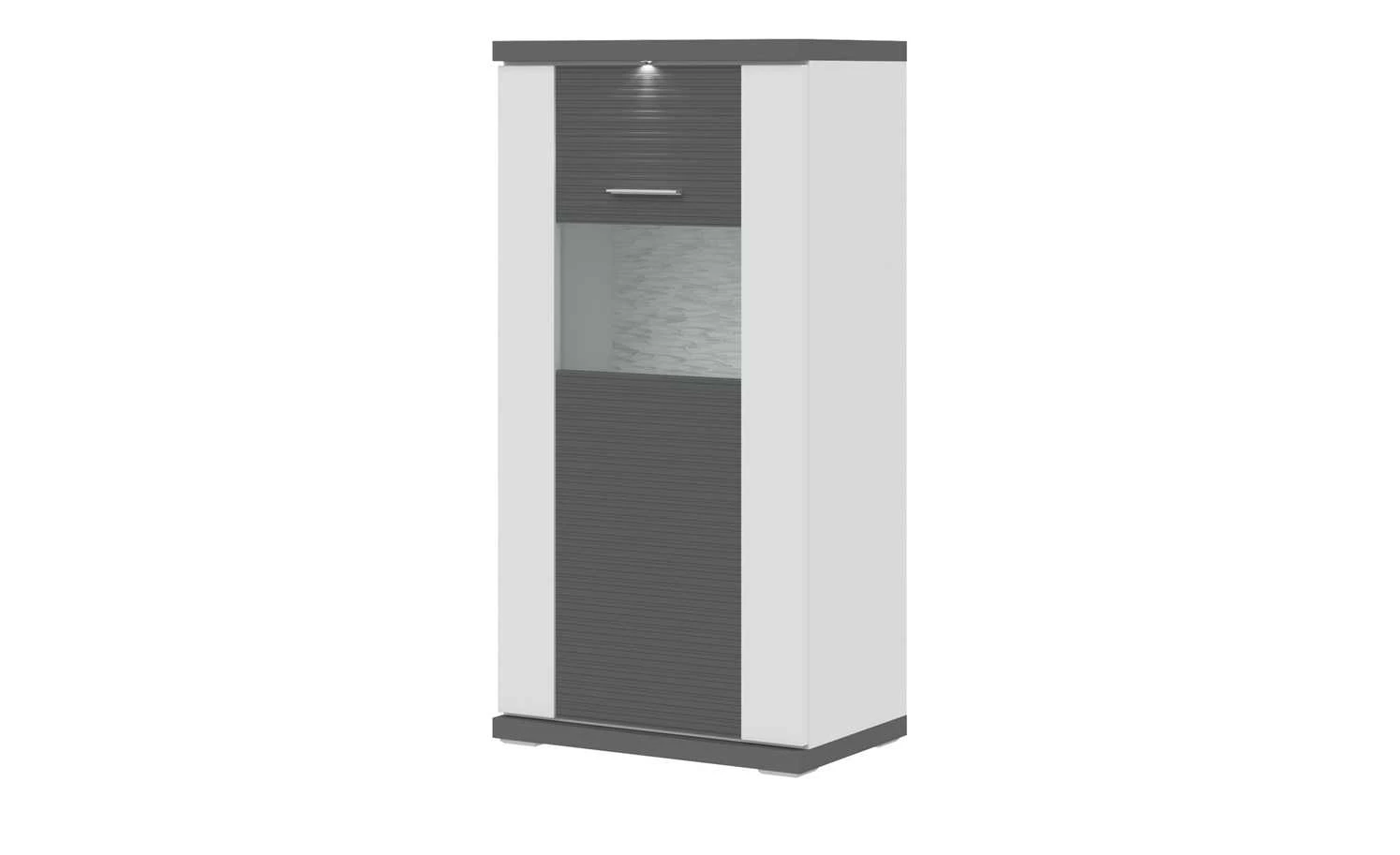 Drei Fächer mit viel Stauraum bietet Ihnen das Highboard Titan. Darüber hinaus hat es ein Vitrinenfach. Dieses können Sie zur Präsentation von besonders hübschem Geschirr nutzen. Titan hat einen strahlenden Weißton und wird dunkel abgesetzt – an der Front und an Oberplatte und Boden. Die mittigen Frontakzente haben eine Schropphobelung. Diese stellt einen tollen Kontrast zum Hochglanz der weißen Front dar. Eine LED-Beleuchtung ist im Lieferumfang enthalten.