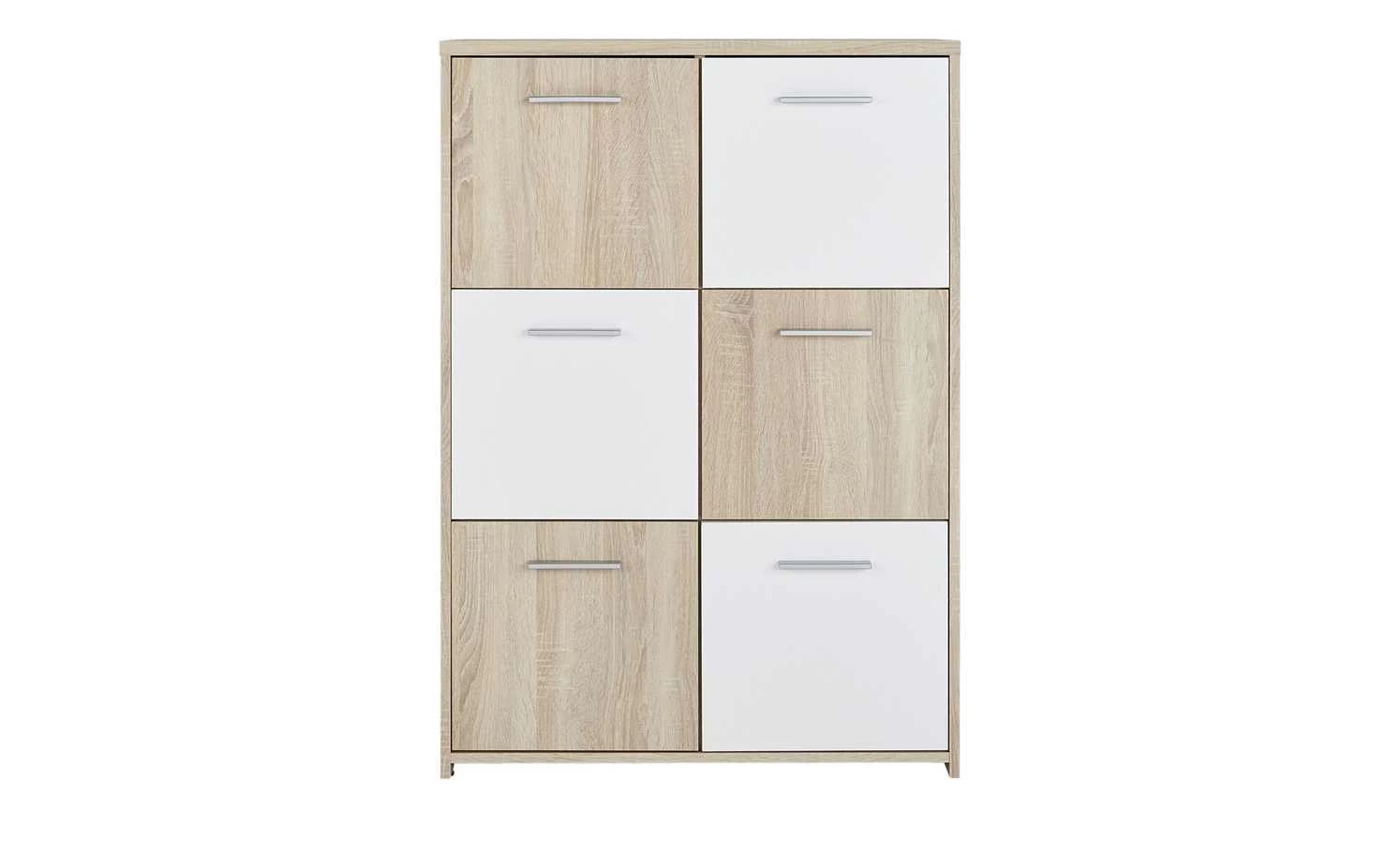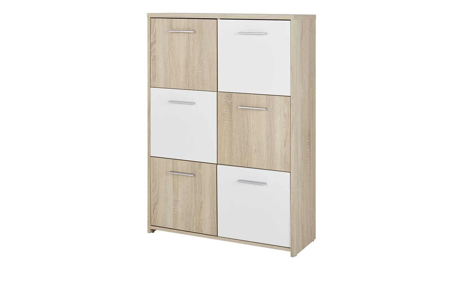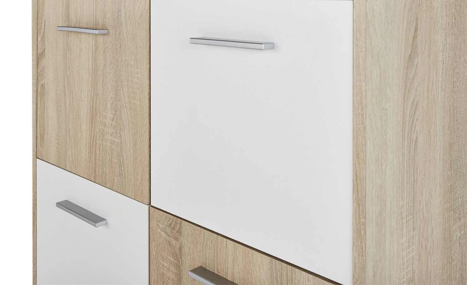 Stauraum ist gut, er sollte aber auch praktisch unterteilt sein. So wie bei der Kommode Quadro. Der Platz im Inneren unterteilt sich in sechs große Fächer mit Türen davor. Dadurch können Sie nicht nur viel verstauen, sondern finden es auch schnell wieder. Quadro hat ein Dekor in Eiche Sonoma (Nachbildung), Teile der Front setzen sich in Weiß ab. Dadurch ergibt sich ein Look, der an ein Schachbrett erinnert.