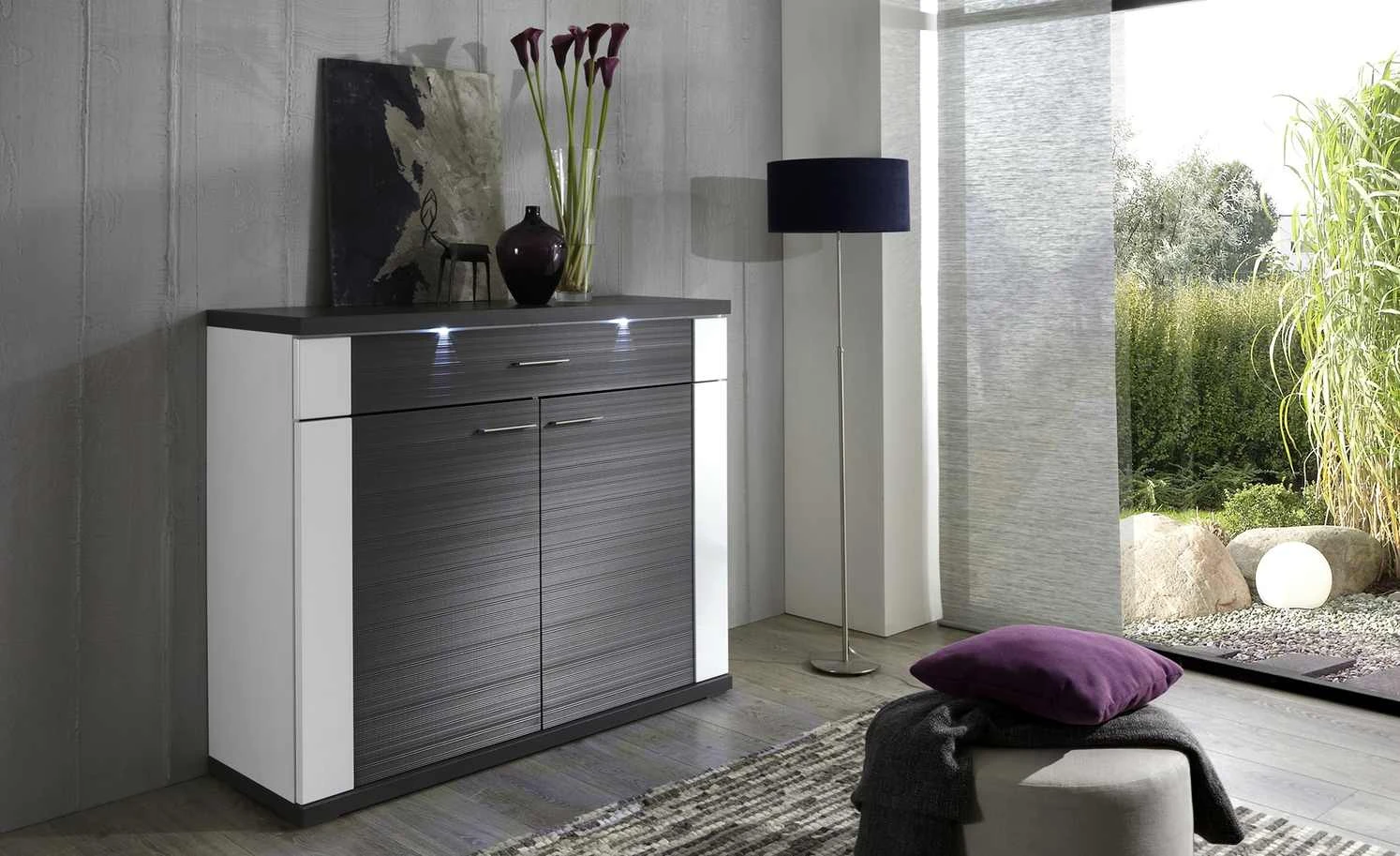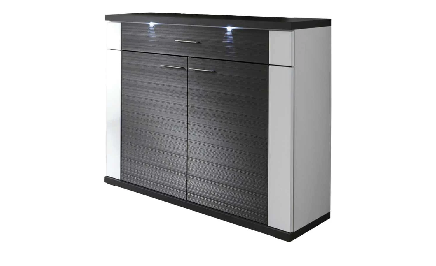 Die Kommode Titan von uno ist ein praktisches Highlight für Wohn- und Speisezimmer. Sie können darin vielerlei Dinge wie Geschirr, Fotoalben und andere Dinge verstauen. Im oberen Bereich befindet sich eine Schublade. Das Besondere an ihr: Sie ist mittig unterteilt, was den Stauraum noch praktischer macht. Darunter befinden sich die beiden Drehtüren. Hinter ihnen sind vier Fächer angeordnet. Titan setzt auf zeitlose Kontraste: Ein dunkles Dekor in Graphit (Nachbildung) wird mit einem freundlichen Weiß kombiniert. Damit das noch besser zur Geltung kommt, wird Titan mit zwei LED-Spotbeleuchtungen für die Front geliefert.