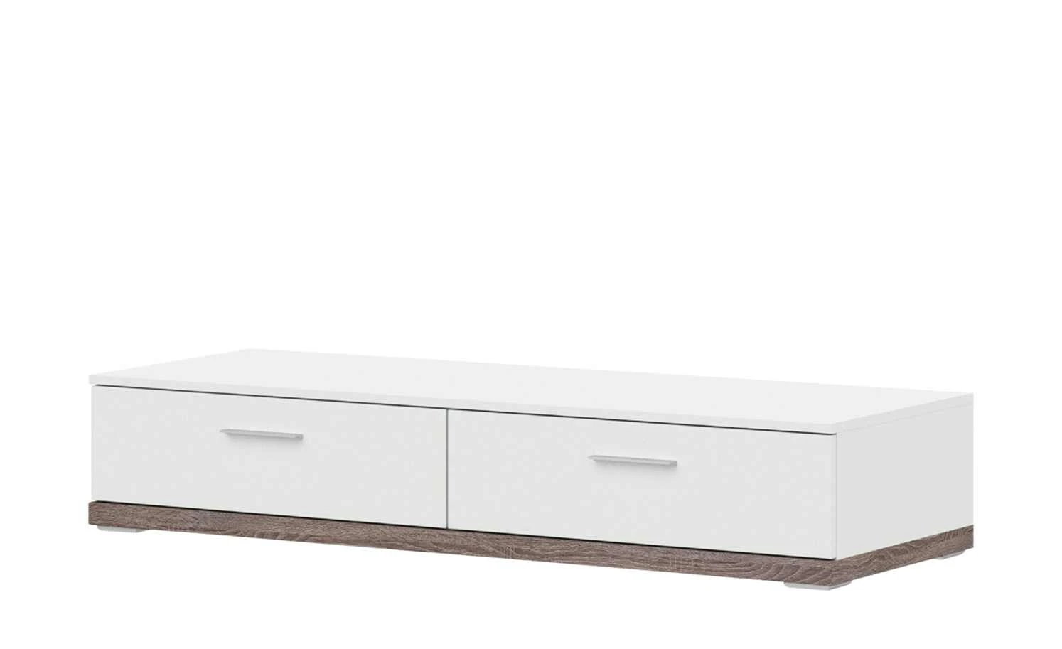 Das Lowboard Titan von uno kann als Stellfläche für Ihren Fernseher genutzt werden. Oder Sie platzieren darauf andere Dinge, wie beispielsweise Bücher, Deko oder auch eine Lampe. Titan ist mit zwei großen Schubladen ausgestattet, die nebeneinander angeordnet sind. Das Lowboard ist weiß und hat eine Front mit einem schönen Hochglanzfinish. Eine breite Absetzung im unteren Bereich von Front und Korpus setzt Akzente: Sie hat ein Dekor in Eiche Trüffel (Nachbildung).