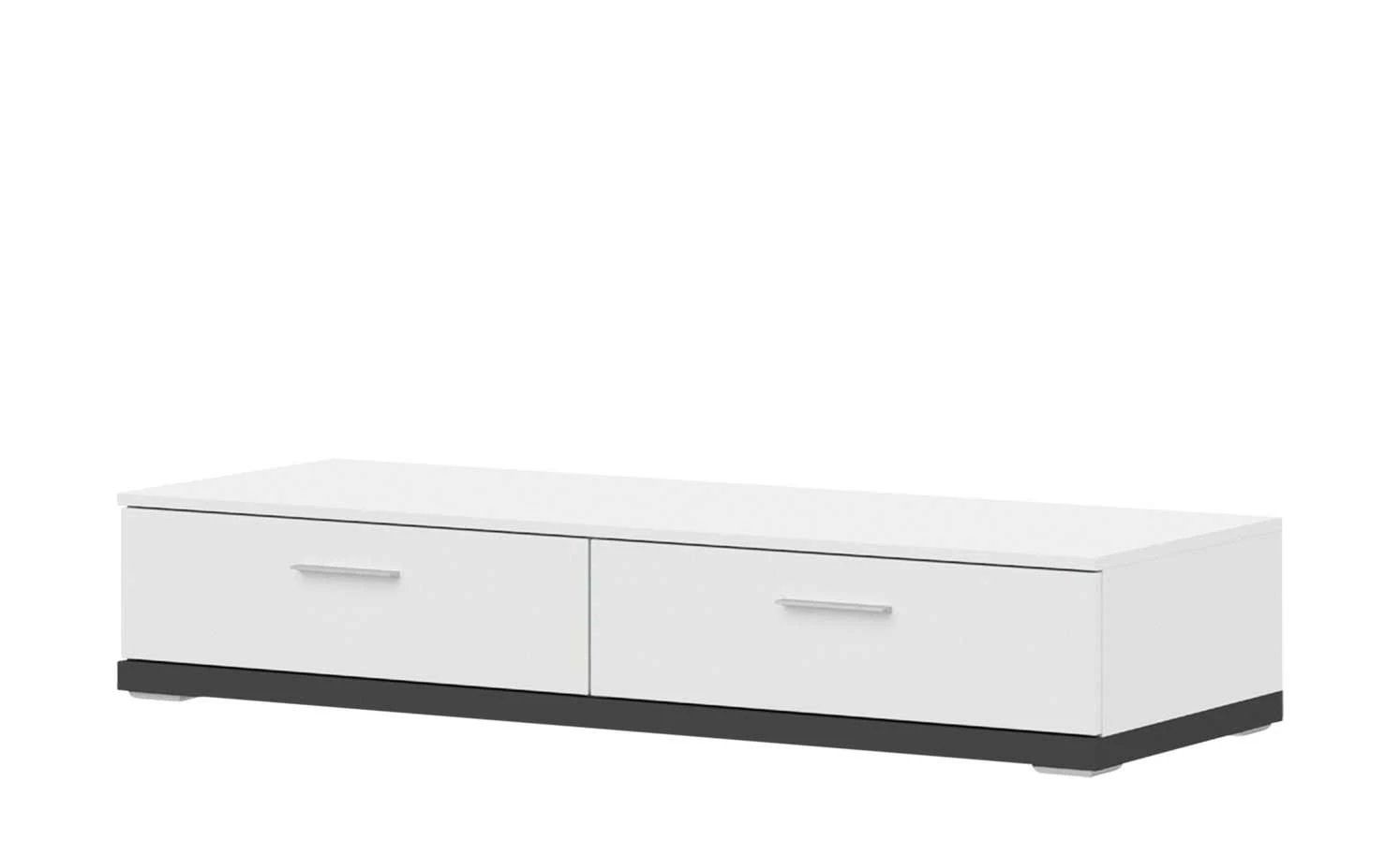 Das Lowboard Titan von uno kann als Stellfläche für Ihren Fernseher genutzt werden. Oder Sie platzieren darauf andere Dinge, wie beispielsweise Bücher, Deko oder auch eine Lampe. Titan ist mit zwei großen Schubladen ausgestattet, die nebeneinander angeordnet sind. Das Lowboard ist weiß und hat eine Front mit einem schönen Hochglanzfinish. Eine breite Absetzung im unteren Bereich von Front und Korpus setzt Akzente: Sie hat ein Dekor in Graphit (Nachbildung).