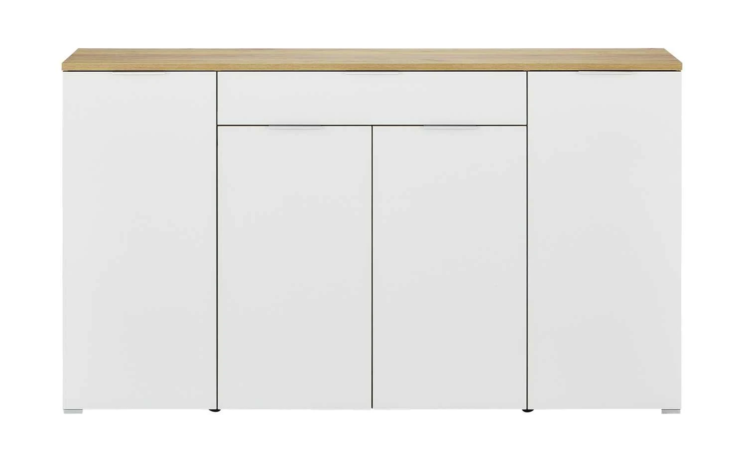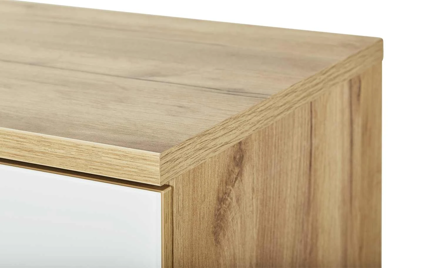 Stylisches Design und Funktionalität vereinen sich in der Kommode Bent von uno. Der Korpus ist in rustikaler Navarra Eiche (Nachbildung) gehalten. Die weiße Front setzt sich davon dekorativ ab. Sie ist aus Glas und hat einen leichten Glanz. Er hebt das Weiß hervor. Das Sicherheitsglas ist robust und kratzerunempfindlich – so wie auch der Korpus. Er ist mit strapazierfähigem Melamin beschichtet. Bent verfügt über eine Schublade und vier Türen. Dahinter befinden sich acht Fächer mit jeder Menge Stauraum.